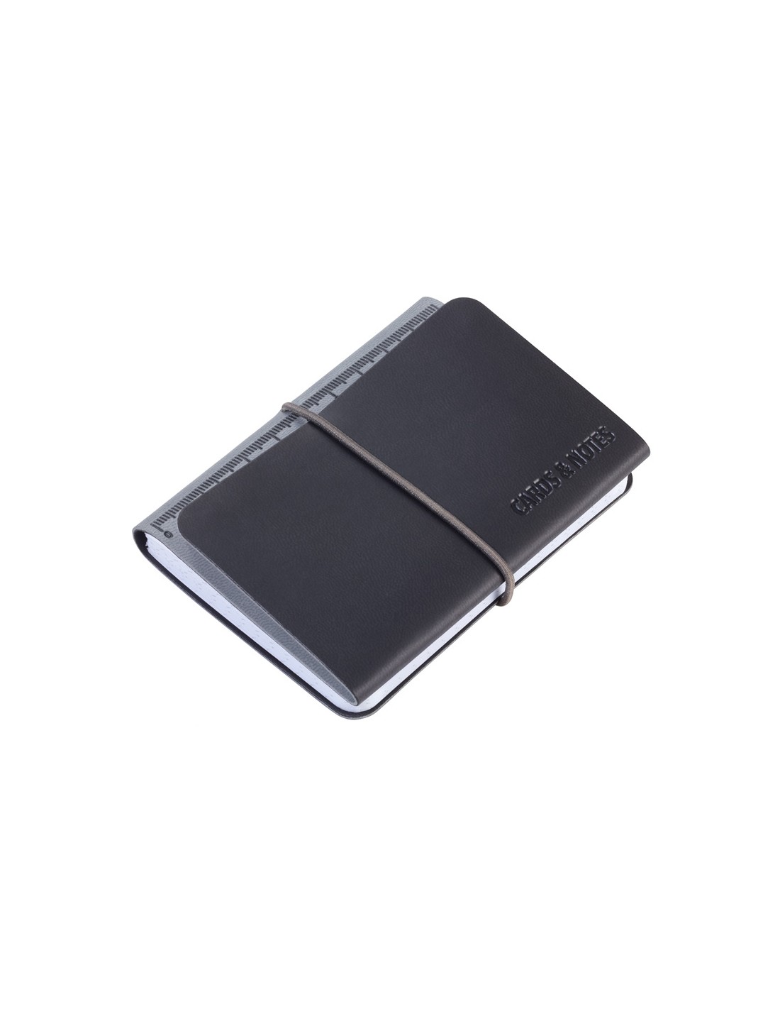 Kartenetui mit 3 Fächern für Kreditkarten, Visitenkarten, Geldscheine, Belege, inkl. Notizblock DIN A7, elastische Kordel als Verschluss, geprägtes Lineal (10 cm) auf Notizblock, FSC zertifiziertes Papier, perforierte Seiten, Punktraster, Kunstleder, matt, schwarz/titanfarben