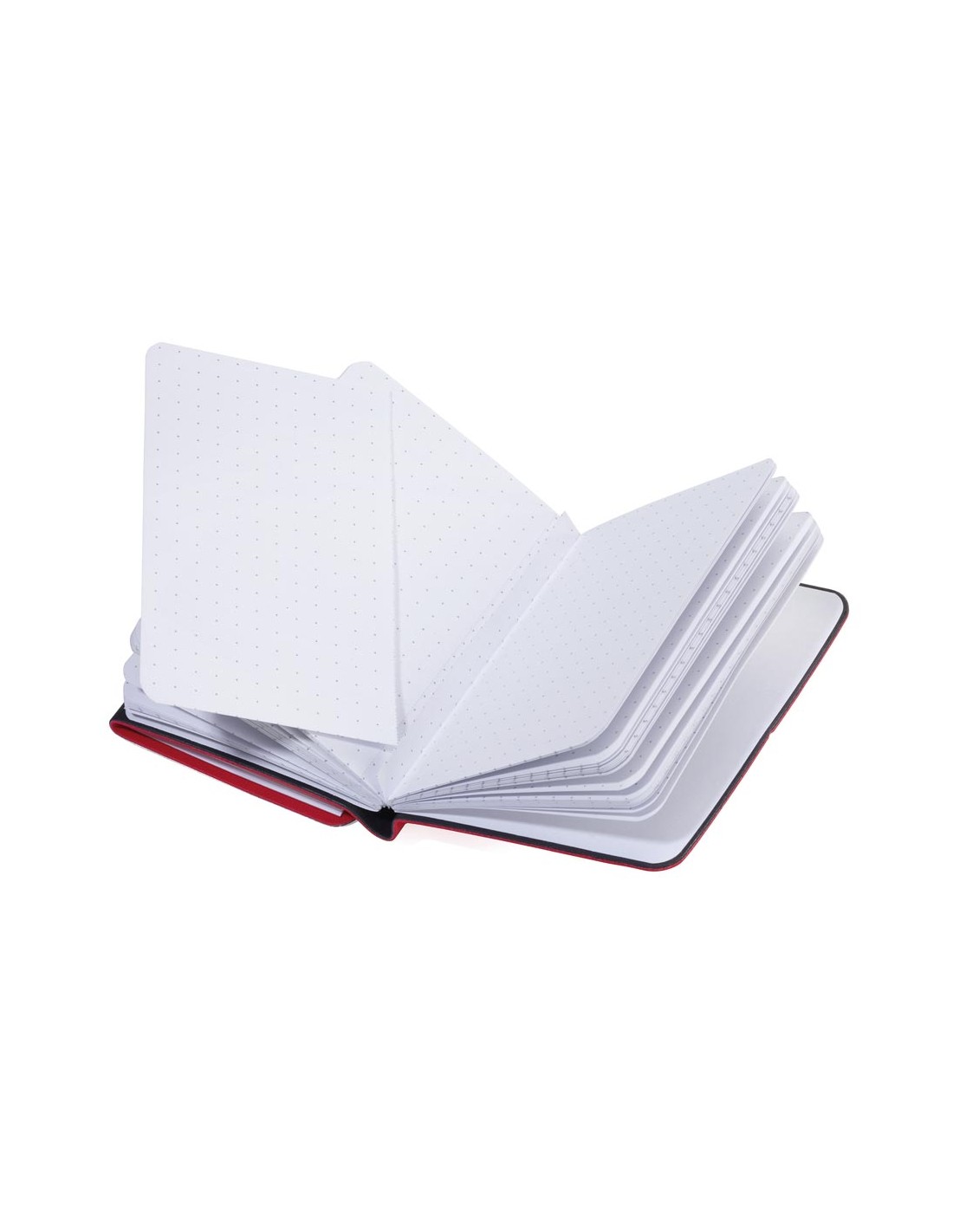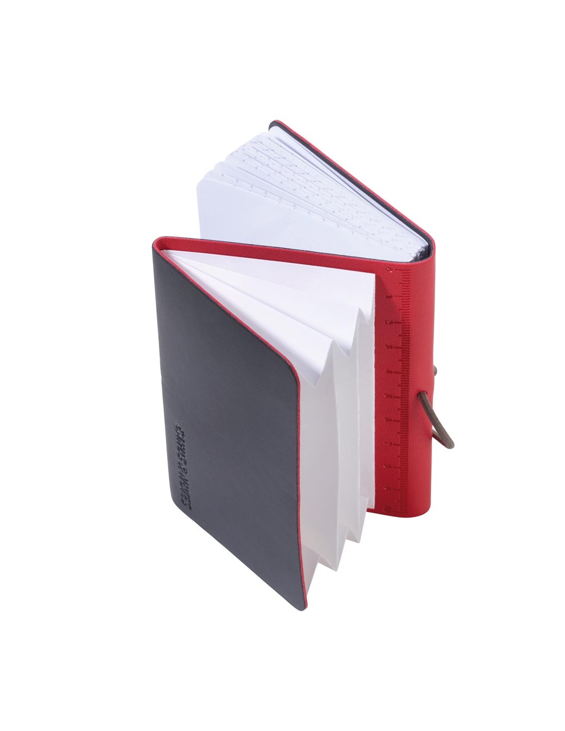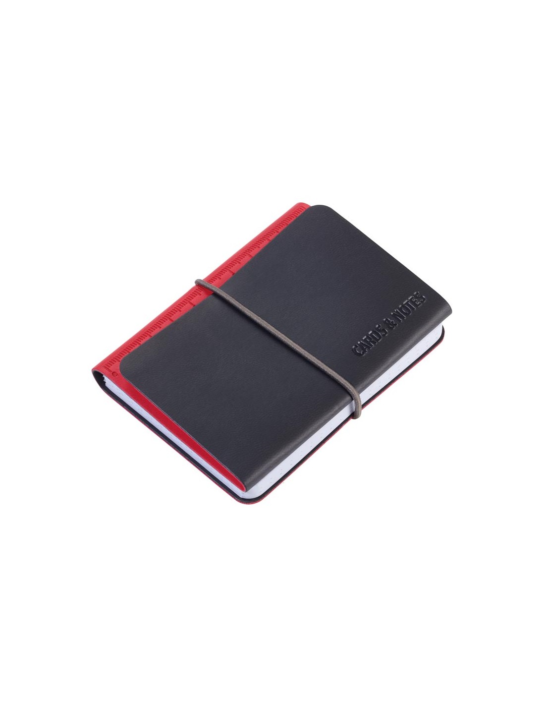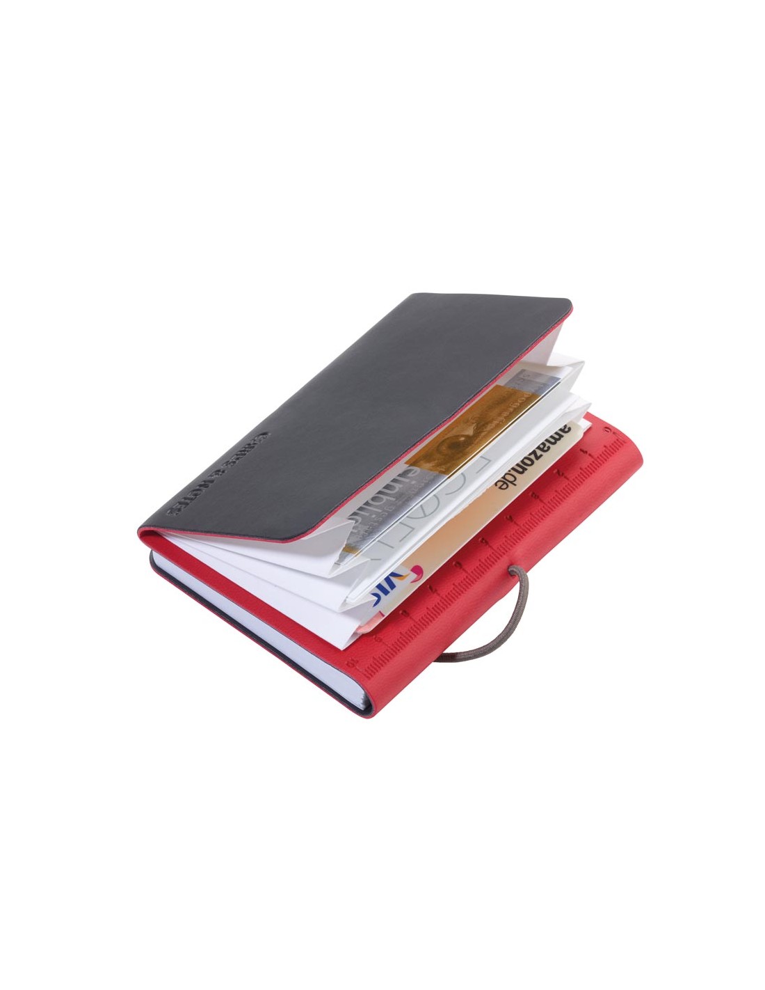 Kartenetui mit 3 Fächern für Kreditkarten, Visitenkarten, Geldscheine, Belege, inkl. Notizblock DIN A7, elastische Kordel als Verschluss, geprägtes Lineal (10 cm) auf Notizblock, FSC zertifiziertes Papier, perforierte Seiten, Punktraster, Kunstleder, matt, rot/schwarz