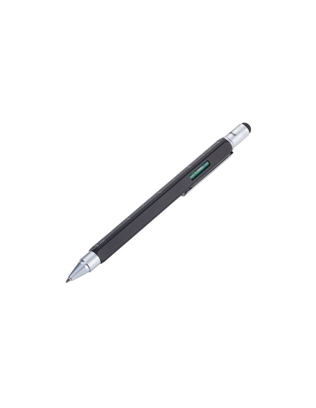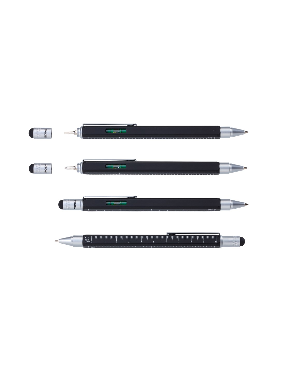 Multitasking-Kugelschreiber, quadratisch, Zentimeter-/Zoll-Lineal, Wasserwaage, Stylus, Schlitz-/Kreuzschraubendreher, schwarze Mine, Messing, lackiertschwarz/silber