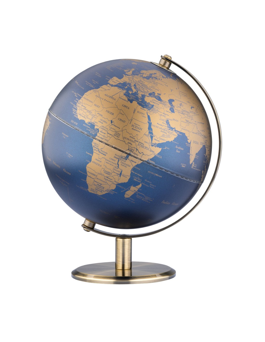 Globus mit 20 cm Durchmesser, antikgoldener, gebürsteter Metallfuß, bewegliche Achse, Kunststoff, Metall, matt, dunkelblau/goldfarben