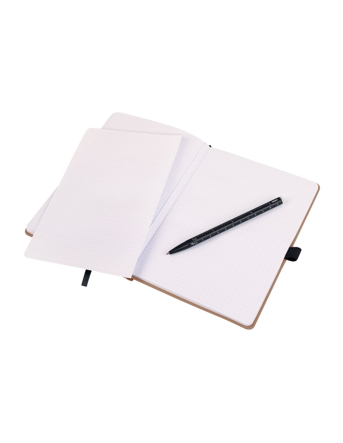 Notizblock DIN A5 inkl. Kugelschreiber, Elastikband-Verschluss, Stiftschlaufe, Lesezeichen, geprägtes Lineal (20 cm) auf Cover, FSC zertifiziertes Papier, 64 perforierte Blätter (128 Seiten), Punktraster, Fach für Belege, Kugelschreiber CONSTRUCTION BASIC (schwarze D1 Mine), Kunstleder, Metall, matt, braun