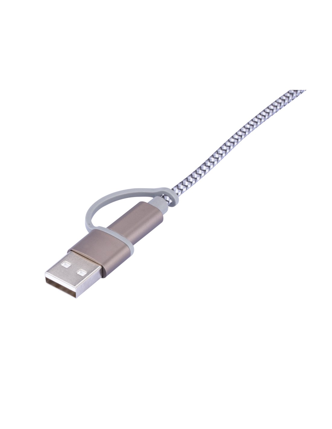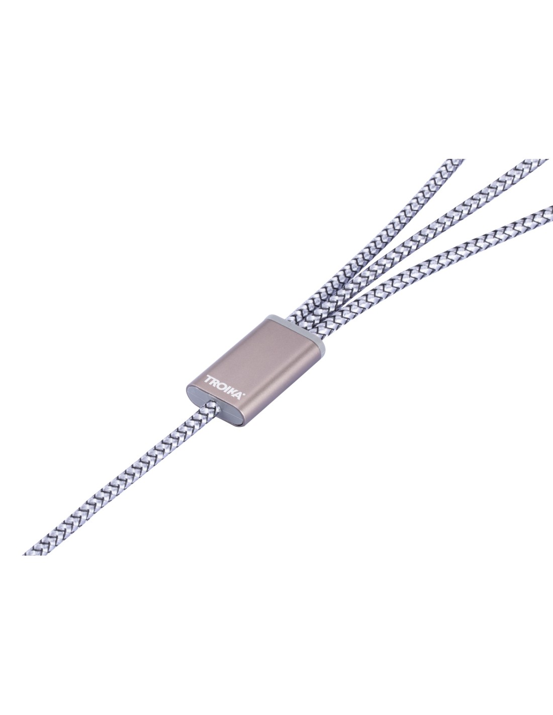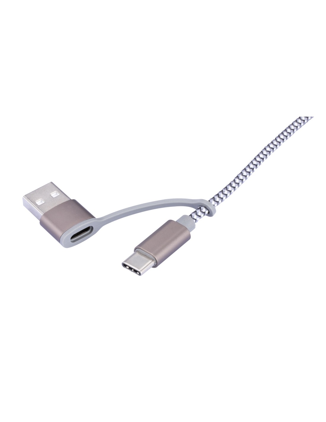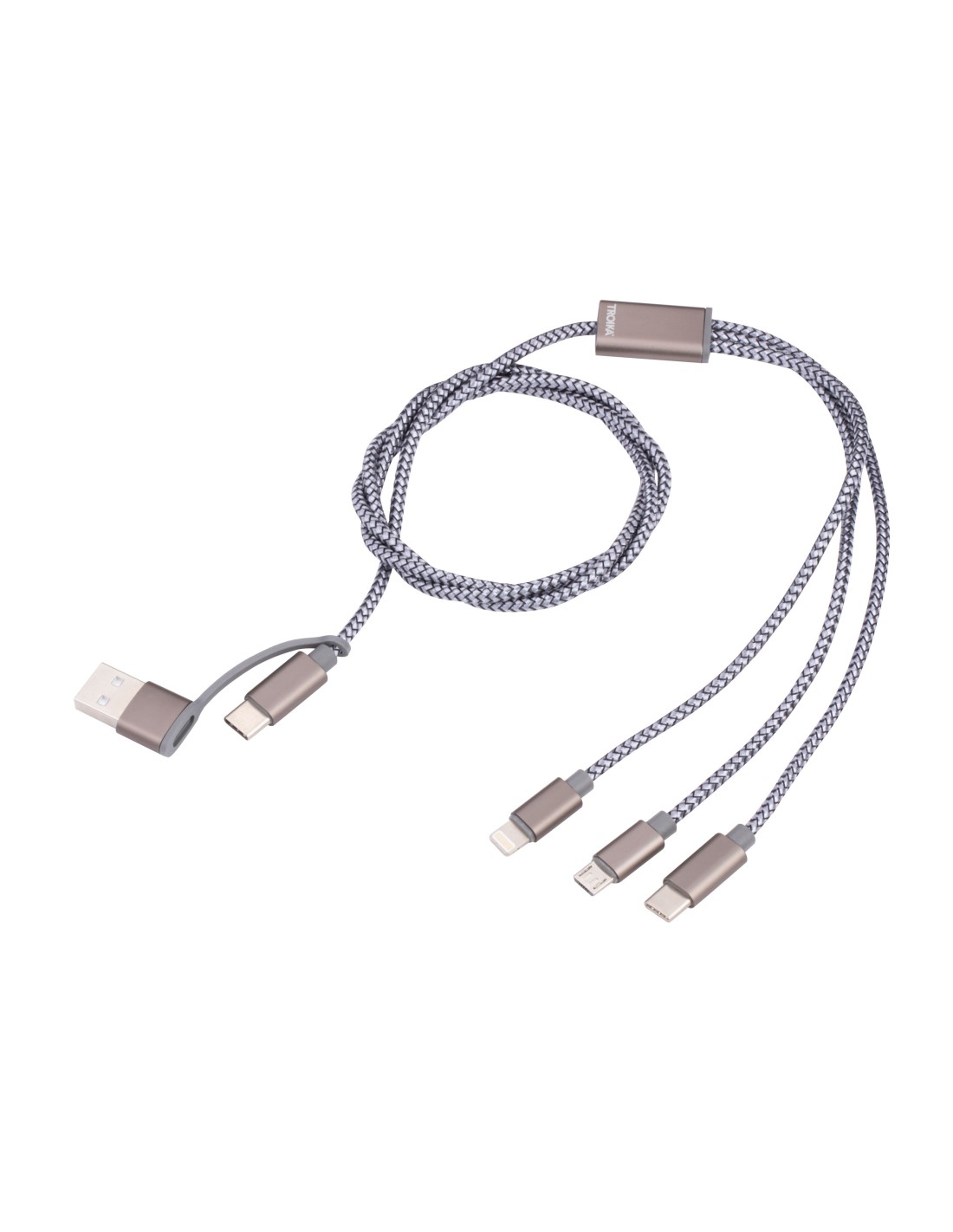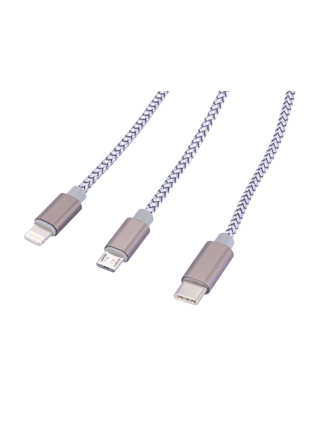Ladekabel 3 in 1 - für gleichzeitiges Laden von bis zu 3 Geräten über USB, USB/USB-C auf Micro-USB/Lightning/USB-C, Kabel textilummantelt, 1m lang, geeignet für Schnellladung (bis ca. 5V/2,5A), 22 AWG, Metall, Nylon, matt, grau