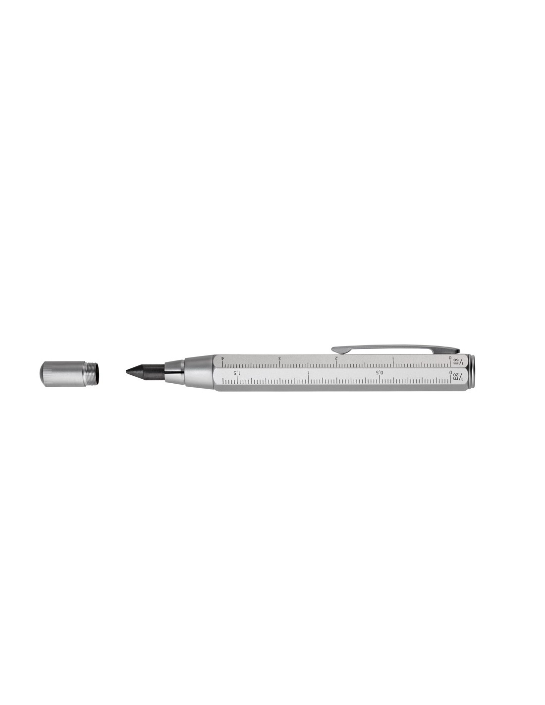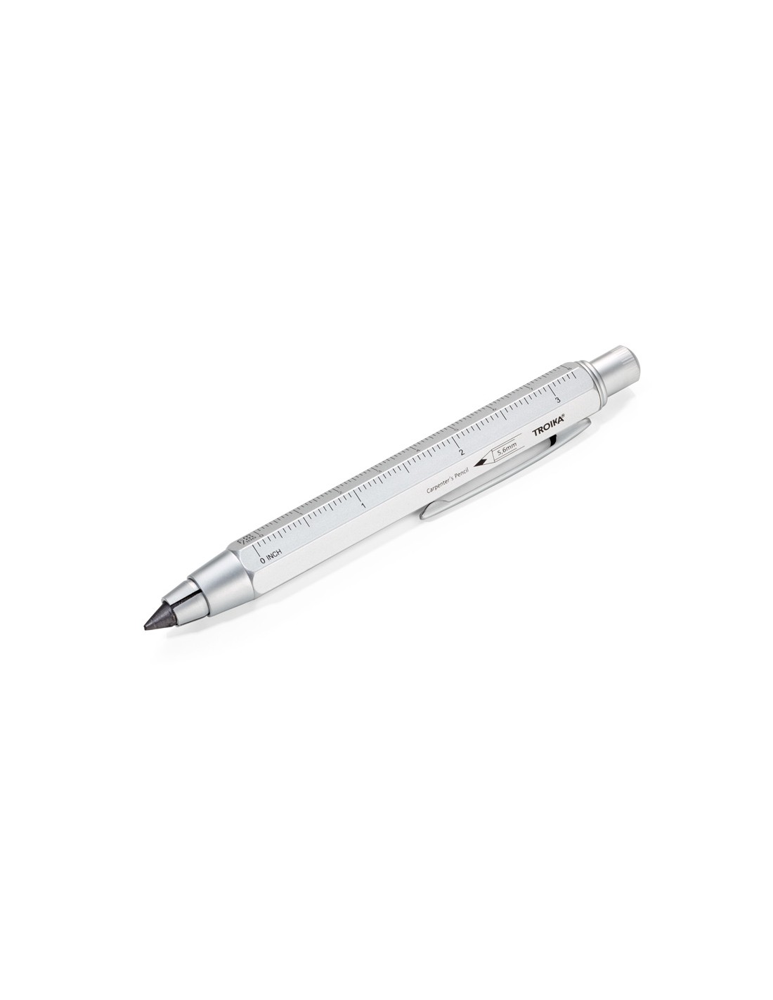 Zimmermannsbleistift, Fallminen-Stift (5,6 mm HB-Mine), Zentimeter-/Zoll-Lineal, 1:20 m/1:50 m Skala, integrierter Anspitzer, Messing, silberfarben