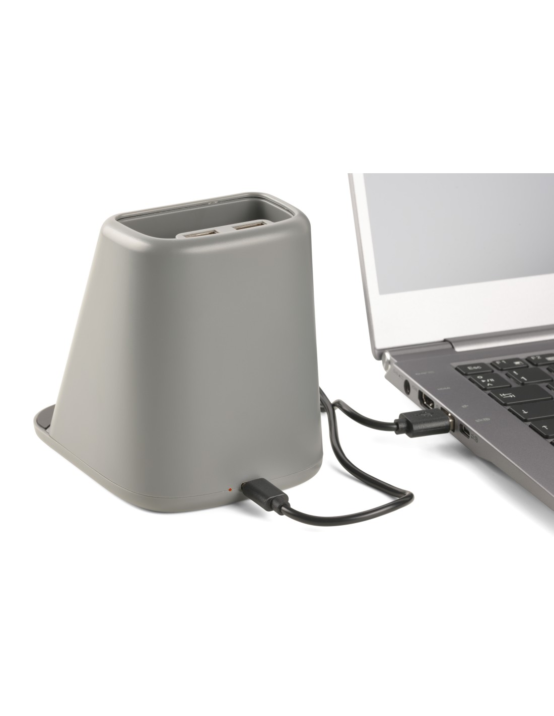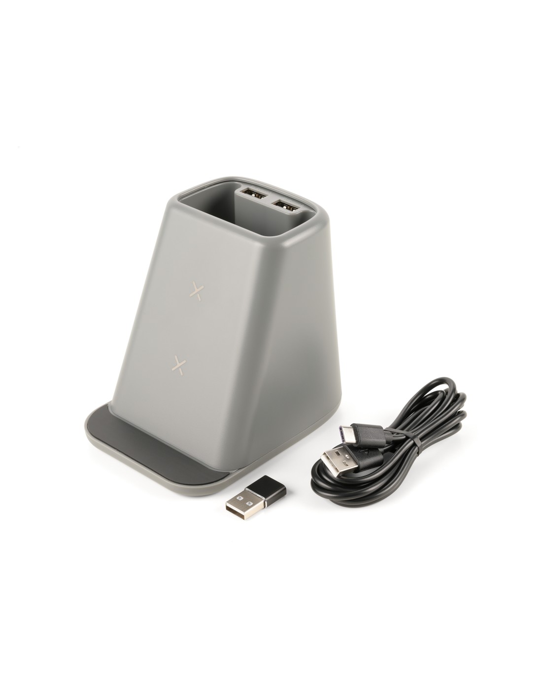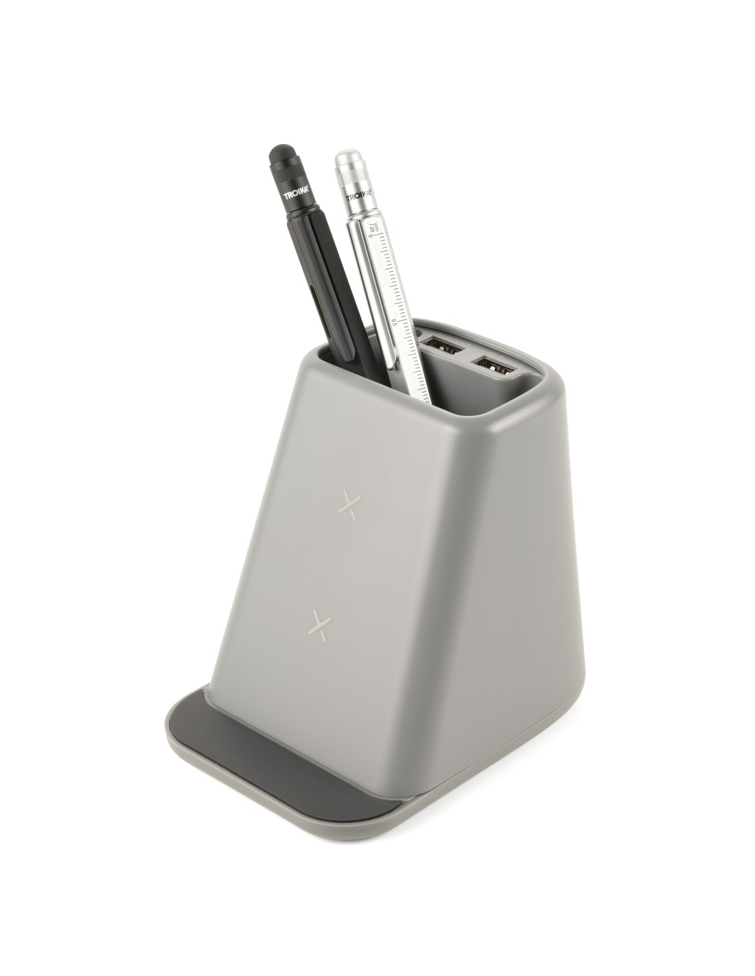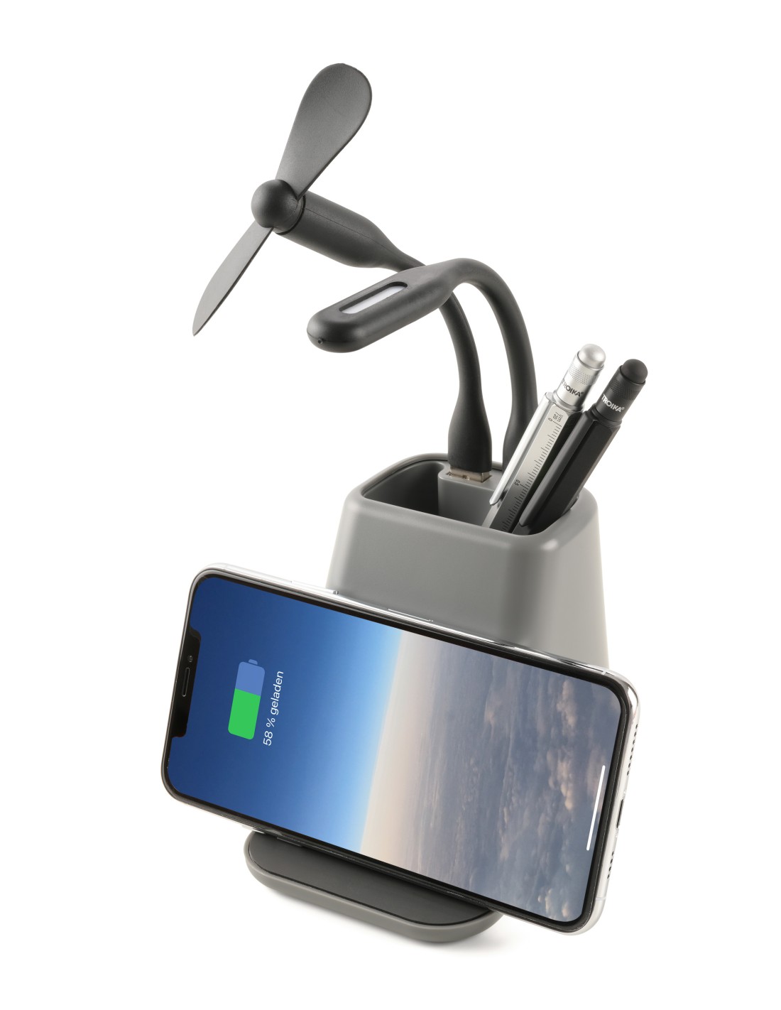 Ladestation und Schreibtisch Organizer: Stiftehalter und Handyhalter, induktives Laden (senkrecht oder waagerecht, 10 Watt), zusätzlich 2 USB-Ladebuchsen (Output: max. 5 Volt - max. 2 Ampere) für weitere Geräte oder Lampe, Mini-Ventilator, etc., inkl. 1 USB-C auf USB Ladekabel + 1 USB-C auf USB Adapter, Aufladewinkel perfekt für gleichzeitiges Laden und Nutzung für Video Calls, Kunststoff, matt, grau