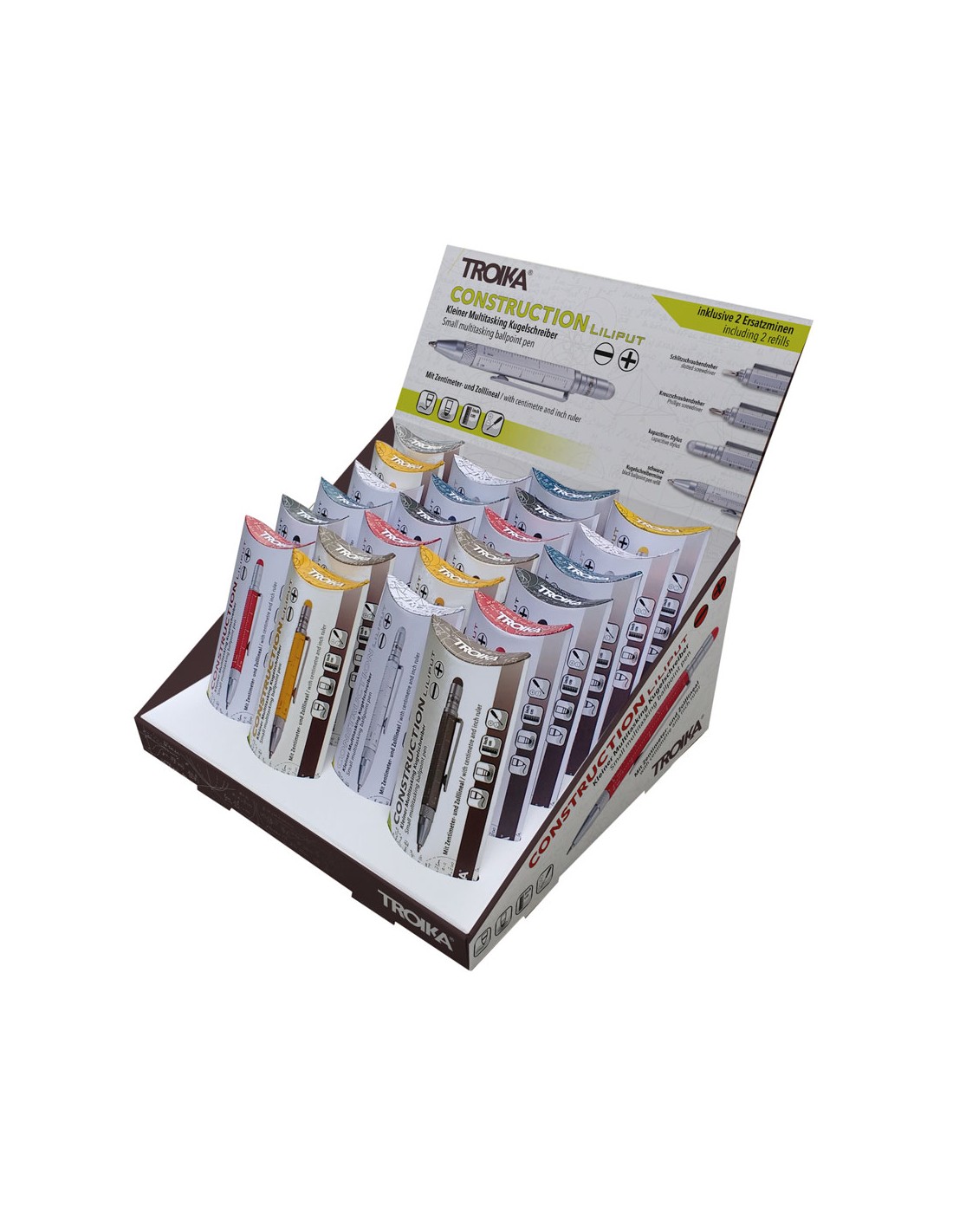 Thekendisplay inkl. 24 x CONSTRUCTION LILIPUT Multitasking-Kugelschreiber (klein), vorsortiert (je 4 x PIP25/BK, PIP25/BL, PIP25/RD, PIP25/SI, PIP25/TI, PIP25/YE), zur Selbstbedienung, Pappe, bedruckt, matt, mehrfarbig