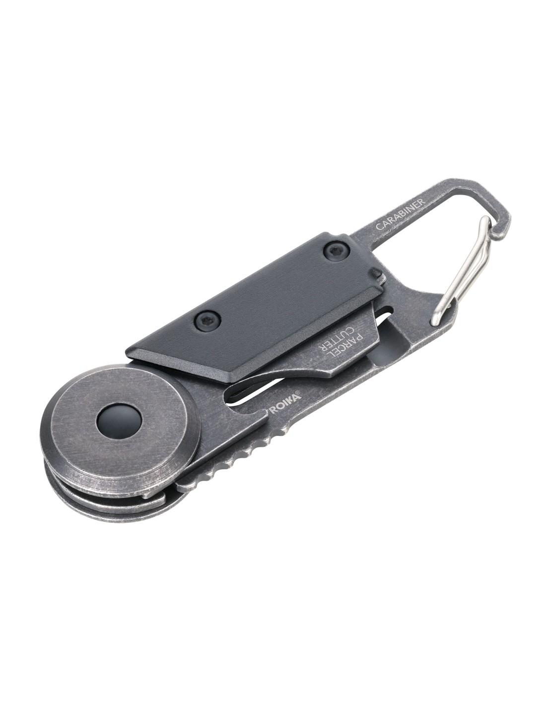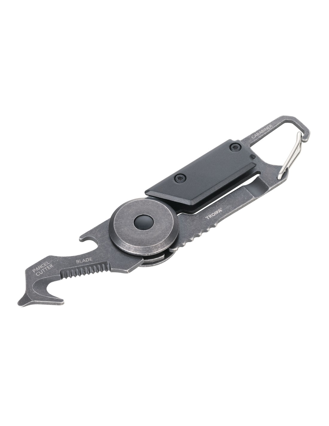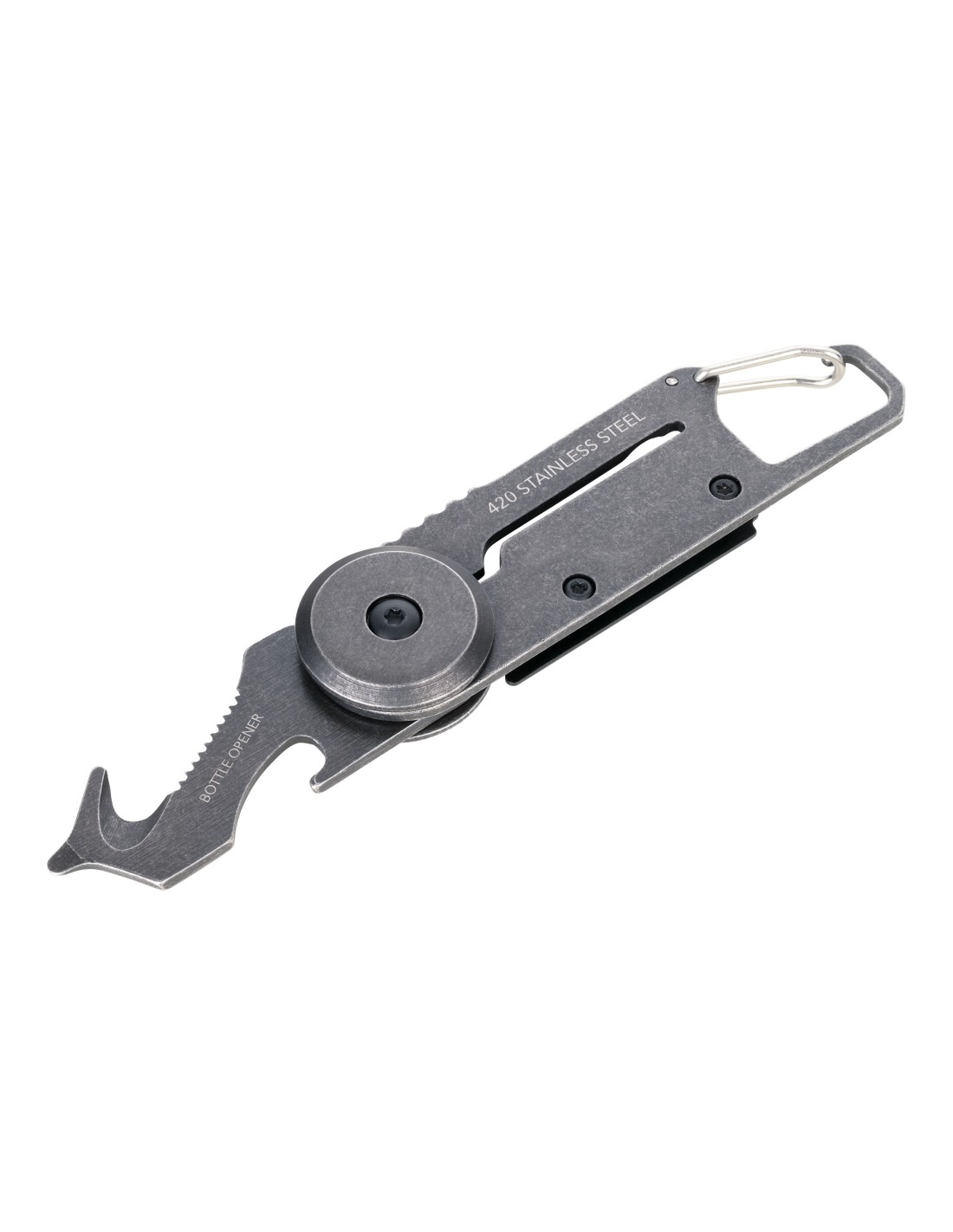 Mini-Werkzeug mit 5 Funktionen, Paketmesser, Karabinerhaken, kleine Sägeklinge, Schlitz-Schraubendreher, Flaschenöffner, 420 Edelstahl, , Aluminium, schwarz/stonewash