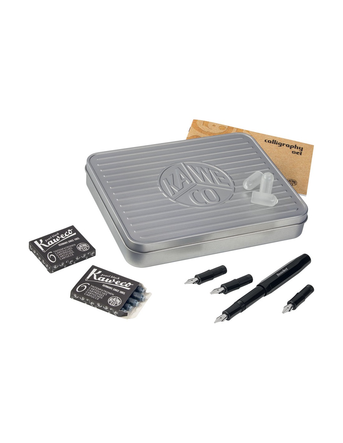 Bei Kaweco können Sie sich, passend zu Ihren Wünschen, für verschiedene Tools zum schönen Schreiben entscheiden. Das Kalligrafie-Set Schwarz zum schönen Schreiben in vier Strichstärken besteht aus einem Sport Füllhalter (1,1 mm), drei wechselbaren Griffstücken (1,5 mm, 1,9mm und 2,3 mm), drei Schutzkappen und zwei 6-Pack Tintenpatronenschachteln in der Farbe Perlenschwarz.