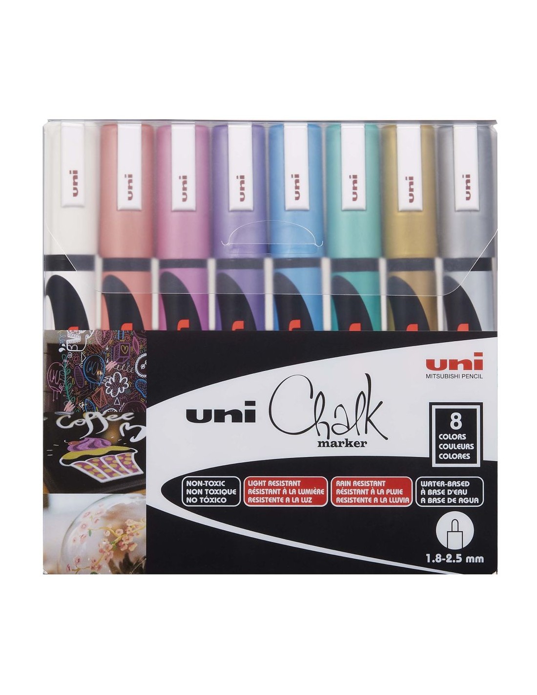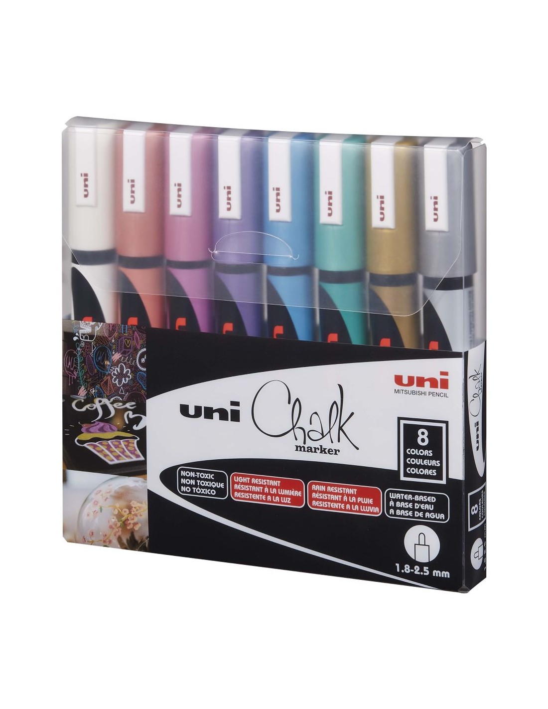 Der uni Chalk Marker ist ein Flüssig-Kreidemarker für die Beschriftung von allen glatten Oberflächen, wie z.B. schwarze Tafeln, Schaufenster, Plakate, Schilder, Spiegel, Glas, Plastik und Metall. Kann auch sehr gut im Freien benutzt werden, da die Farbe wetterfest ist. Weder Regen noch Schnee wird das geschriebene löschen. Trotzdem ist die Farbe mit einem feuchten Tuch von allen glatten Oberflächen leicht abwischbar. Die Farben sind sehr intensiv und kräftig. Die Tinte ist auf Wasserbasis und somit geruchlos. Rundspitze, Strichbreite 1,8- 2,5 mm. Spitze auswechselbar.