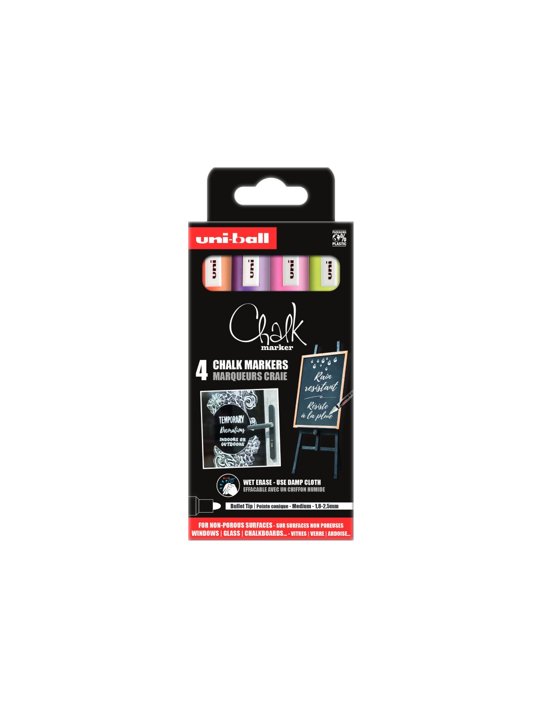 Der uni CHALK MARKER ist ein vielseitig einsetzbarer Kreidemarker. Mit seiner schönen, staubfreien Kreideoptik und der leicht feucht abwischbaren Tinte ist er einfach und praktisch zugleich. Er ist regenfest und kann im Freien auf allen glatten Oberflächen wie Schaufenstern, Leuchtreklamen oder Schiefertafeln verwendet werden. Der CHALK Marker ist nicht nur ein beliebtes Werkzeug im Gastgewerbe und im Einzelhandel, sondern auch für Privatpersonen, die ihre Spiegel, Fenster, Tischkarten usw. mit einer vergänglichen Dekoration versehen möchten.