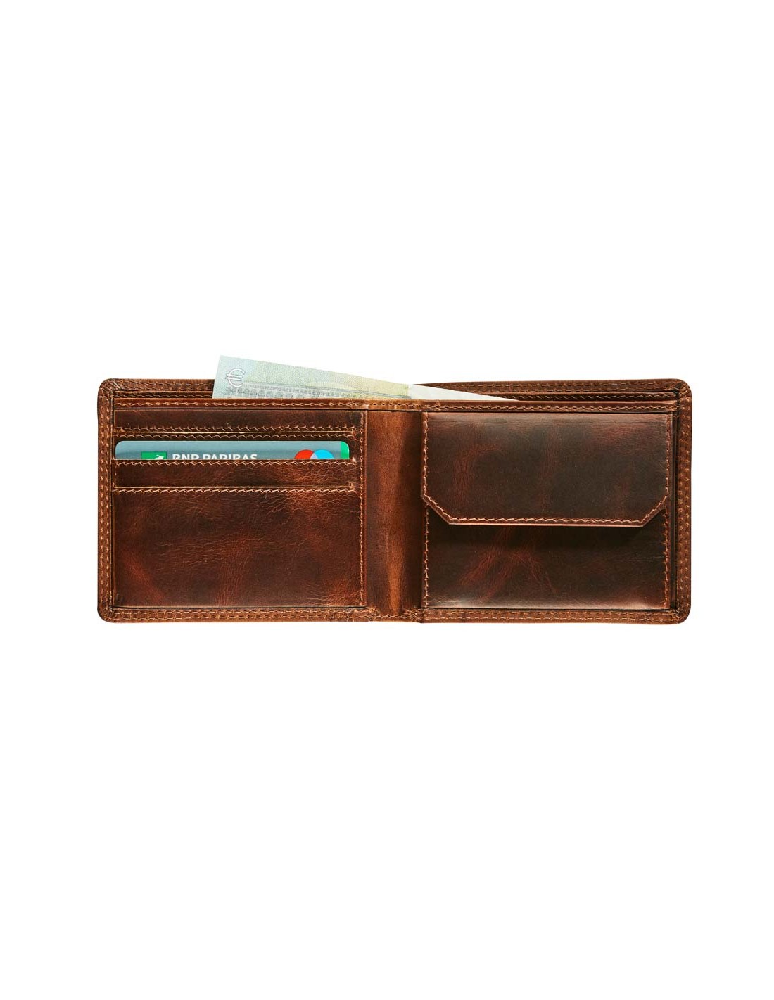 - Vollnarbiges Rindsleder - 3 Zahlungskartenschlitze - 2 Geldscheinfächer - 1 Münzfach - 11 x 8,5 cm.