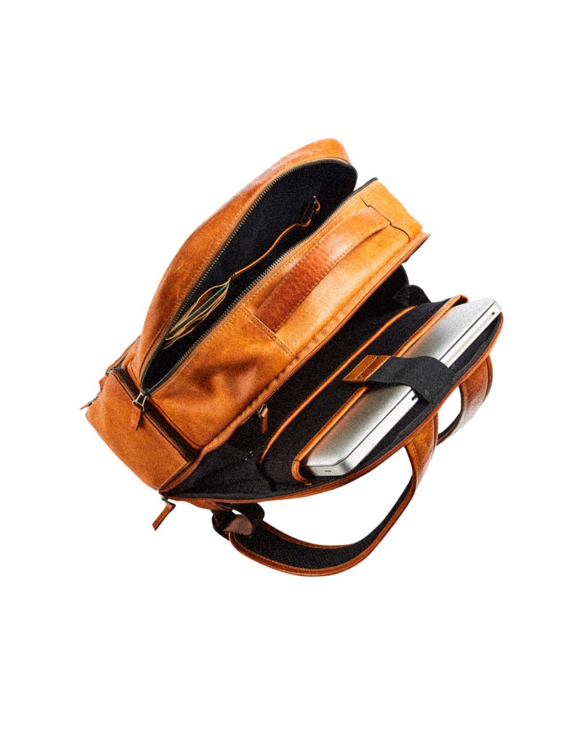 Eleganter Lederrucksack mit separatem, verstärktem Fach für 14-Zoll-Laptops. Ausgestattet mit einer geheimen, diebstahlsicheren Tasche auf der Rückseite. Es regnet in Strömen? Keine Sorge, eine praktische Regenhülle ist inbegriffen!