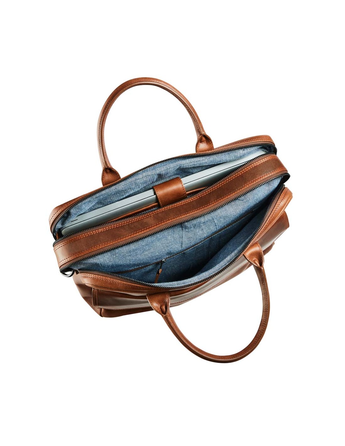 - Vollnarbiges Rindsleder - pflanzlich gegerbtes Leder - 15'6"-Notebook (max. Größe 37 x 25 cm) - 2 Hauptfächer vInterne Organisation - Leicht zugängliches Fach - Abnehmbarer Schultergurt - Riemen zur Befestigung an einem Trolley.