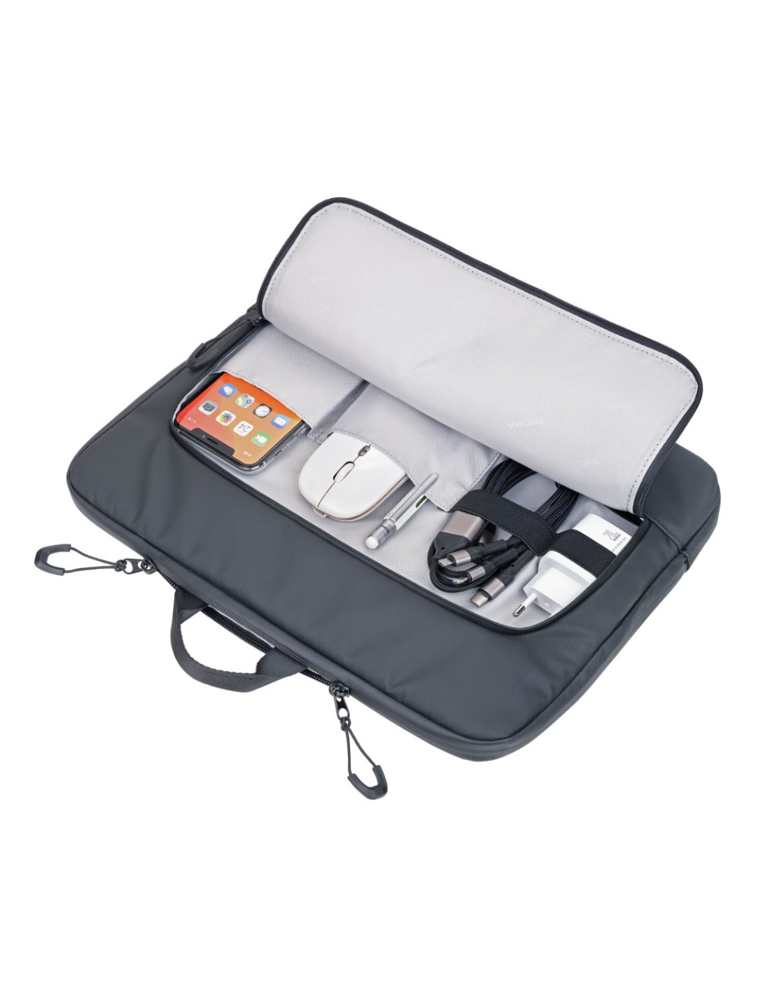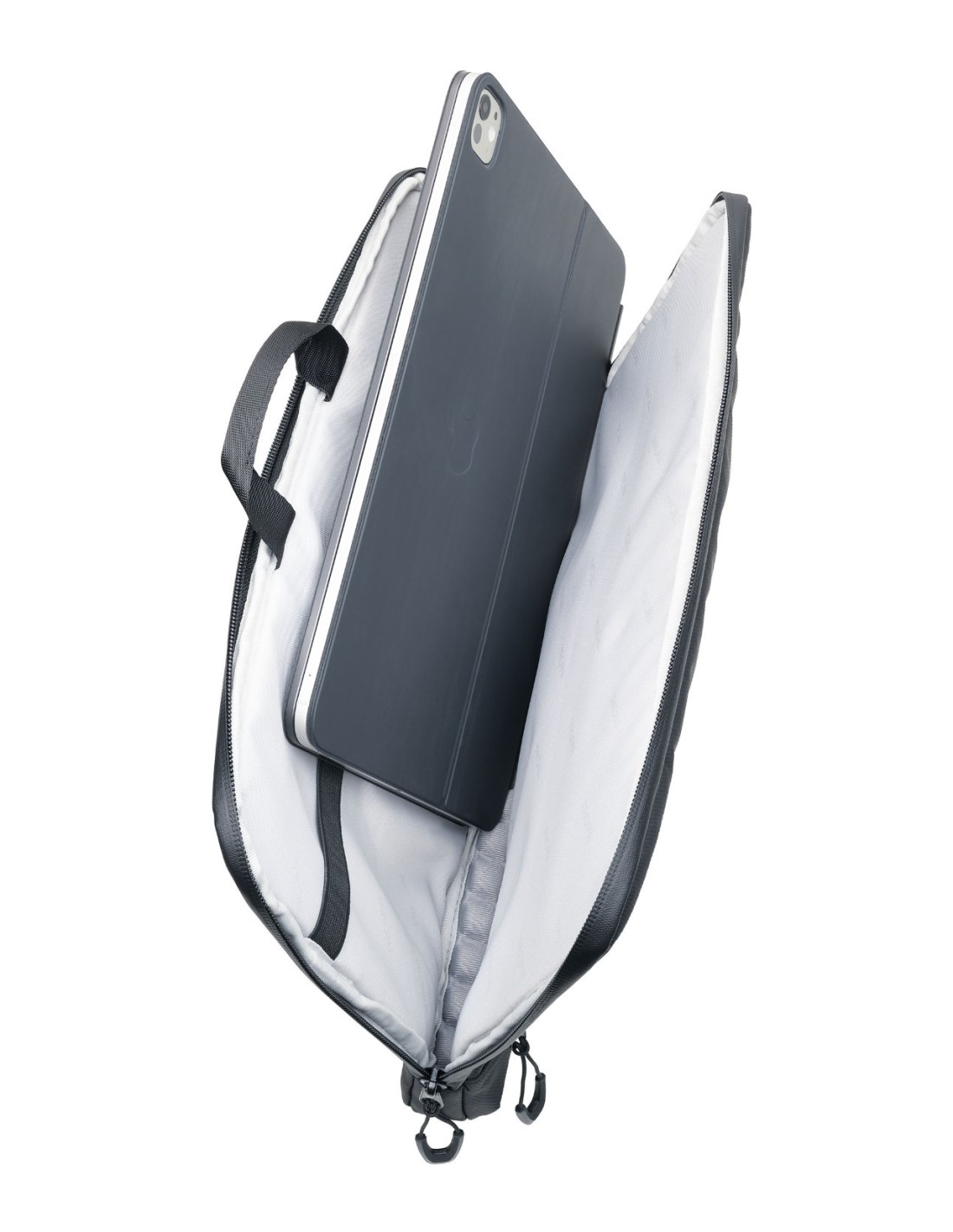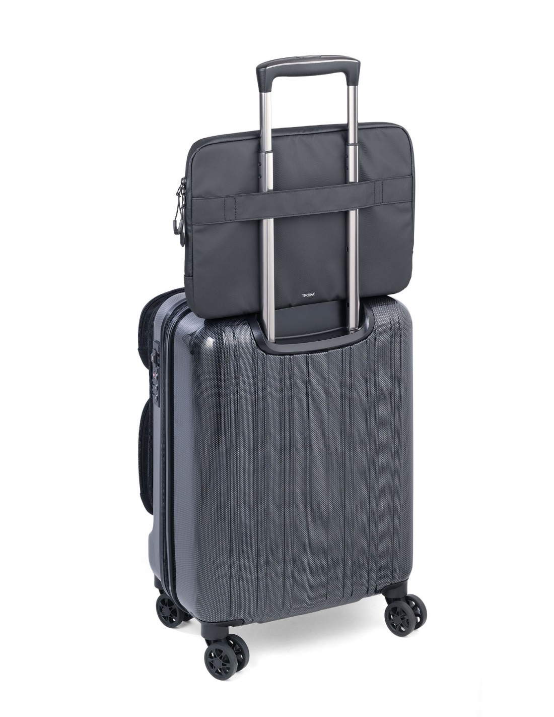 Laptoptasche mit 2 Reißverschlussfächern, 1 großes Fach für Laptop, Tablet, Dokumente (bis zu 14''), mit Tragegriff, separatem Elastikband zur Organisation und zusätzlichem Aufprallschutz durch gepolsterte Ecken, 1 kleines Fach für Zubehör mit 2 Fächern und Elastikbändern, inkl. Geheimfach für mini Tracking-Geräte (z.B. APPLE AirTag®), Schlaufe zur Befestigung am Trolley, wasserabweisende Reißverschlüsse, widerstandsfähiges Material, spritzwassergeschützt (Wasserdichtheitsgrad IPX4), Tarpaulin: 80% Polyester, 20% Polyurethan (PU), Polyester, Polyurethan, Tarpaulin (Plane), schwarz