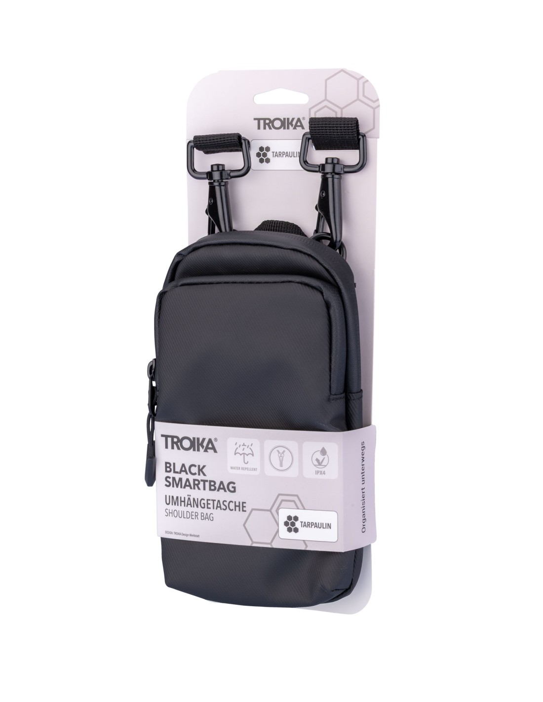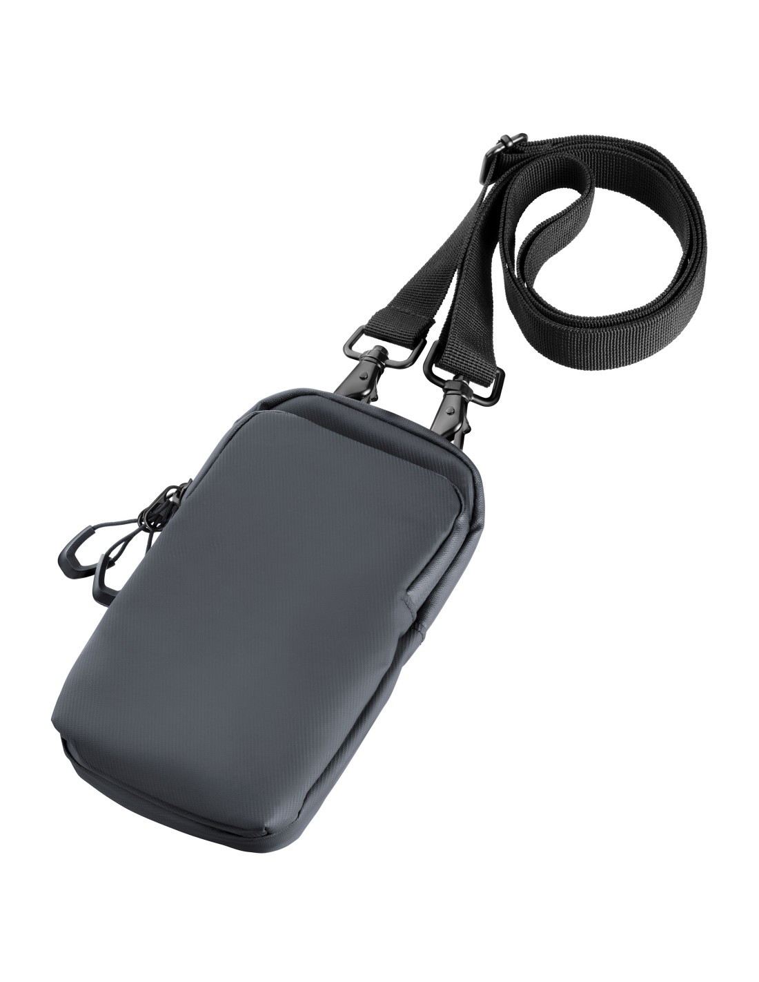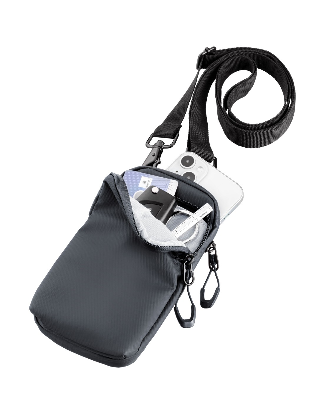 Smartphone Umhängetasche mit wasserabweisenden Reißverschlüssen, großes Fach für das Smartphone, weiteres Fach für andere Utensilien (Visitenkarten, Schlüssel, Bargeld, Kopfhörer, etc.), verstellbarer Gurt mit Metallkarabinern, widerstandsfähiges Material, spritzwassergeschützt (Wasserdichtheitsgrad IPX4), Tarpaulin: 80% Polyester, 20% Polyurethan (PU), Polyester, Polyurethan, Tarpaulin (Plane), schwarz
