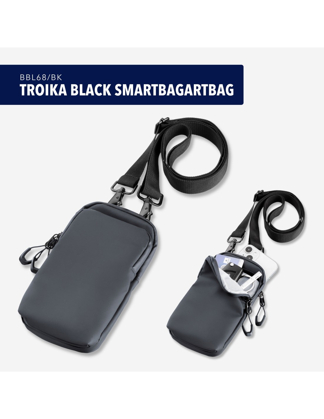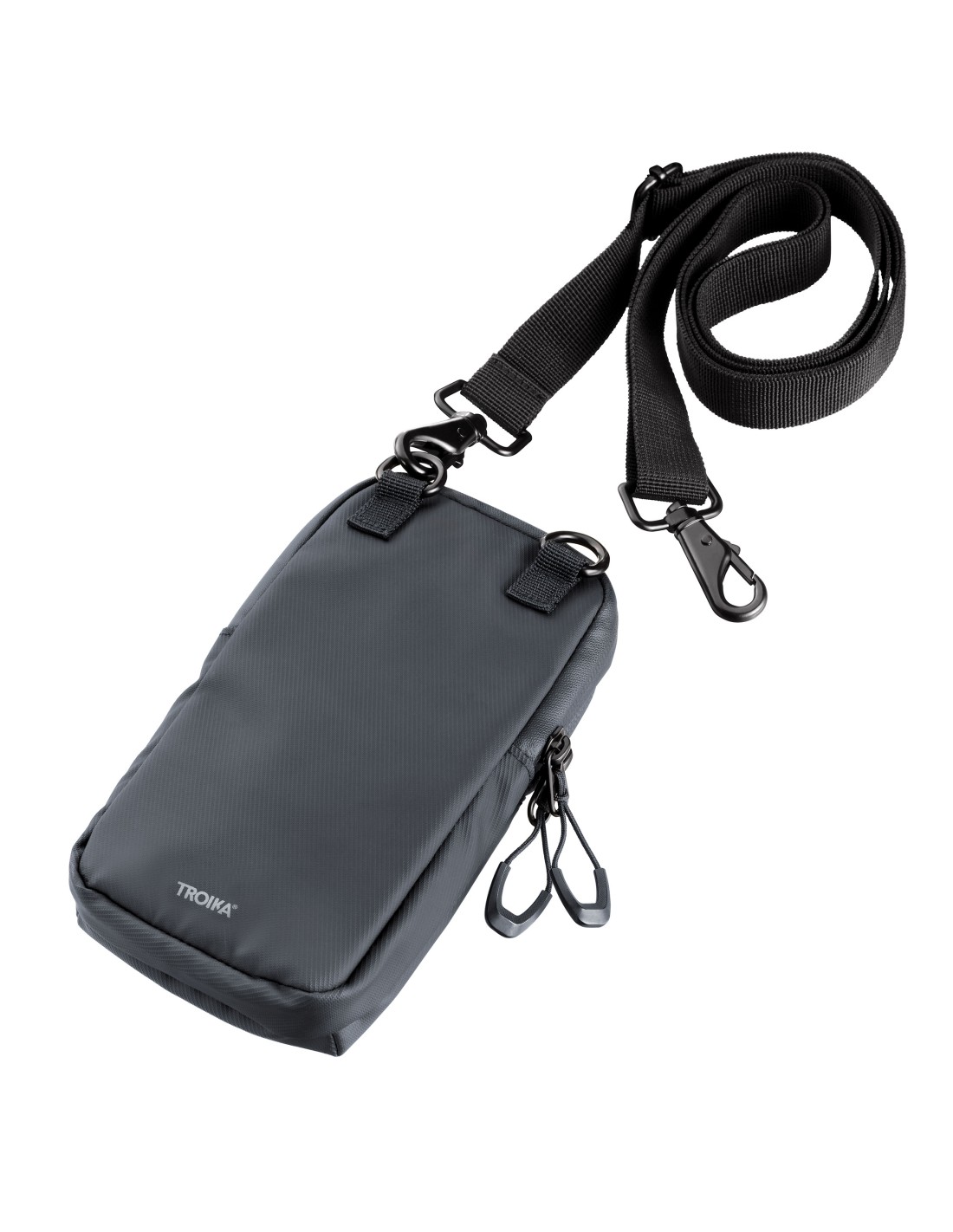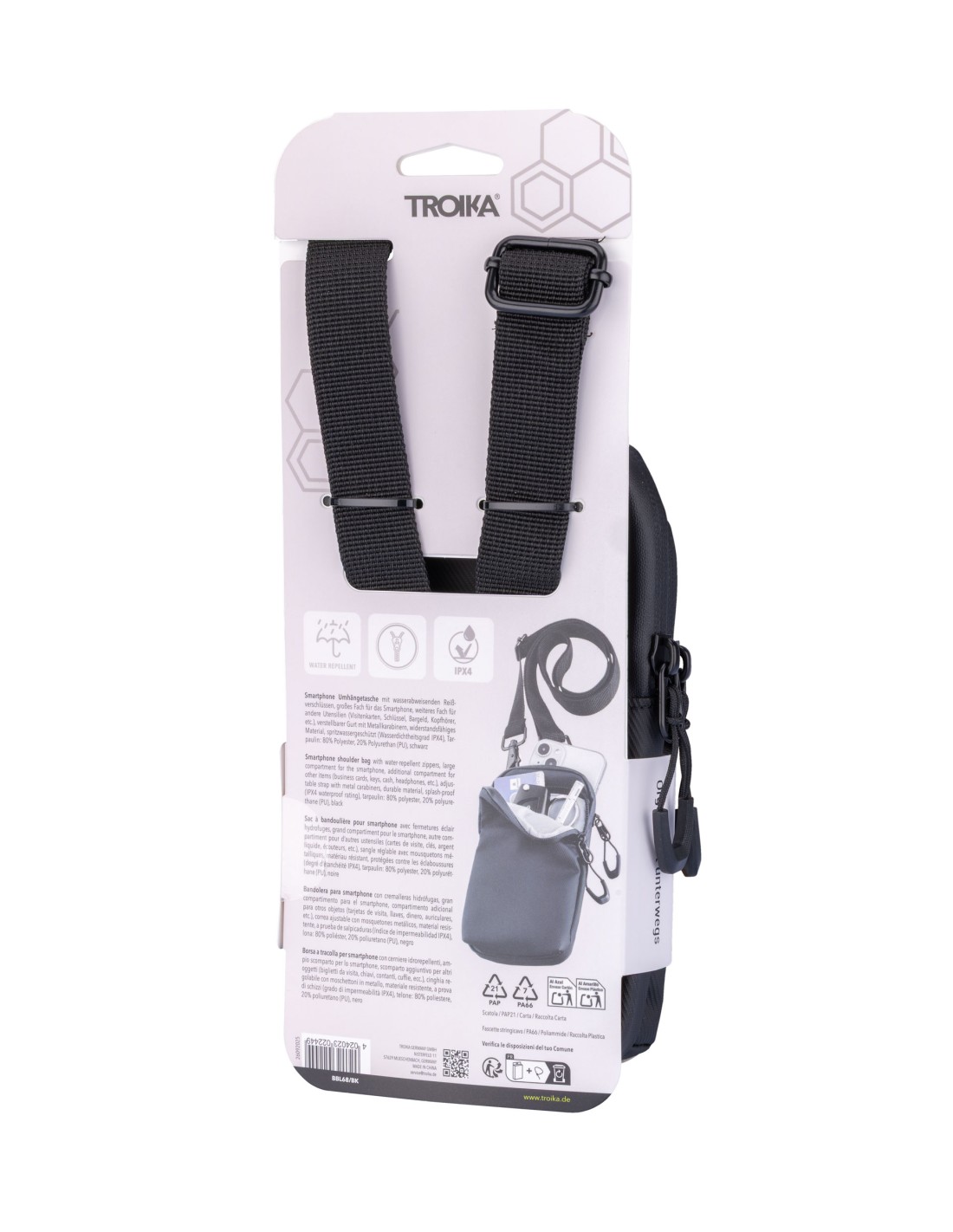 Smartphone Umhängetasche mit wasserabweisenden Reißverschlüssen, großes Fach für das Smartphone, weiteres Fach für andere Utensilien (Visitenkarten, Schlüssel, Bargeld, Kopfhörer, etc.), verstellbarer Gurt mit Metallkarabinern, widerstandsfähiges Material, spritzwassergeschützt (Wasserdichtheitsgrad IPX4), Tarpaulin: 80% Polyester, 20% Polyurethan (PU), Polyester, Polyurethan, Tarpaulin (Plane), schwarz
