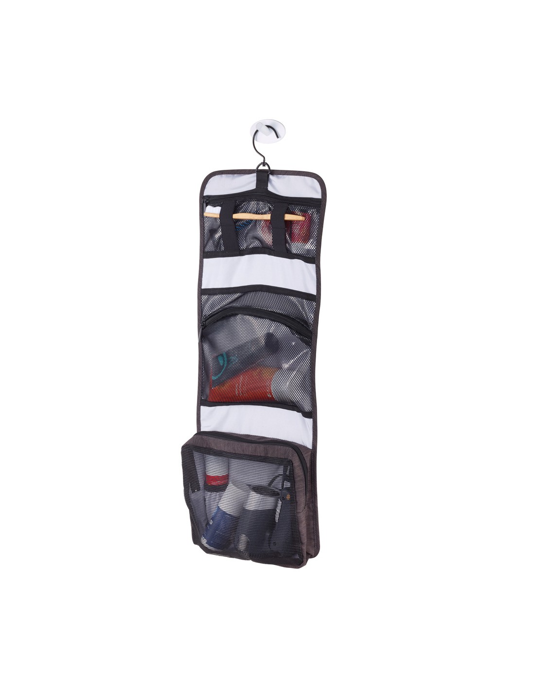 Reise-Kulturtasche mit Haken zum Aufhängen und als Schließe, Innen: atmungsaktives Netzfach mit Reißverschluss und Steckfächern, 2 Reißverschlussfächer mit Netz und PVC Beschichtung (Schutz vor Flüssigkeiten), Fronttasche mit Reißverschluss, Polyester, anthrazit/schwarz