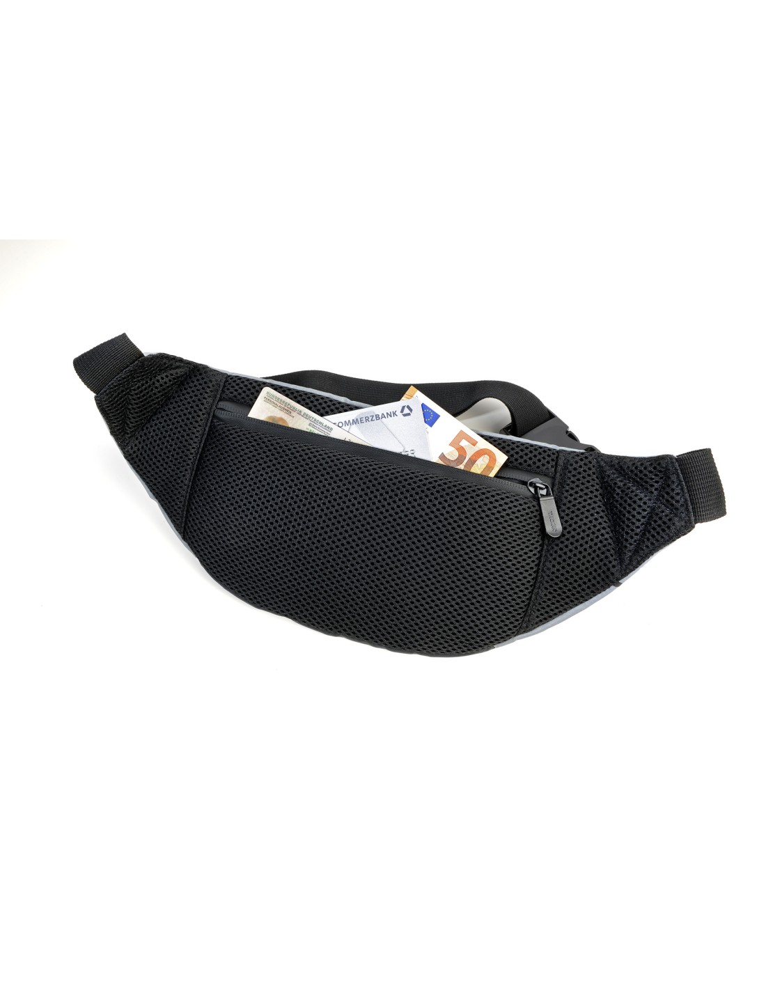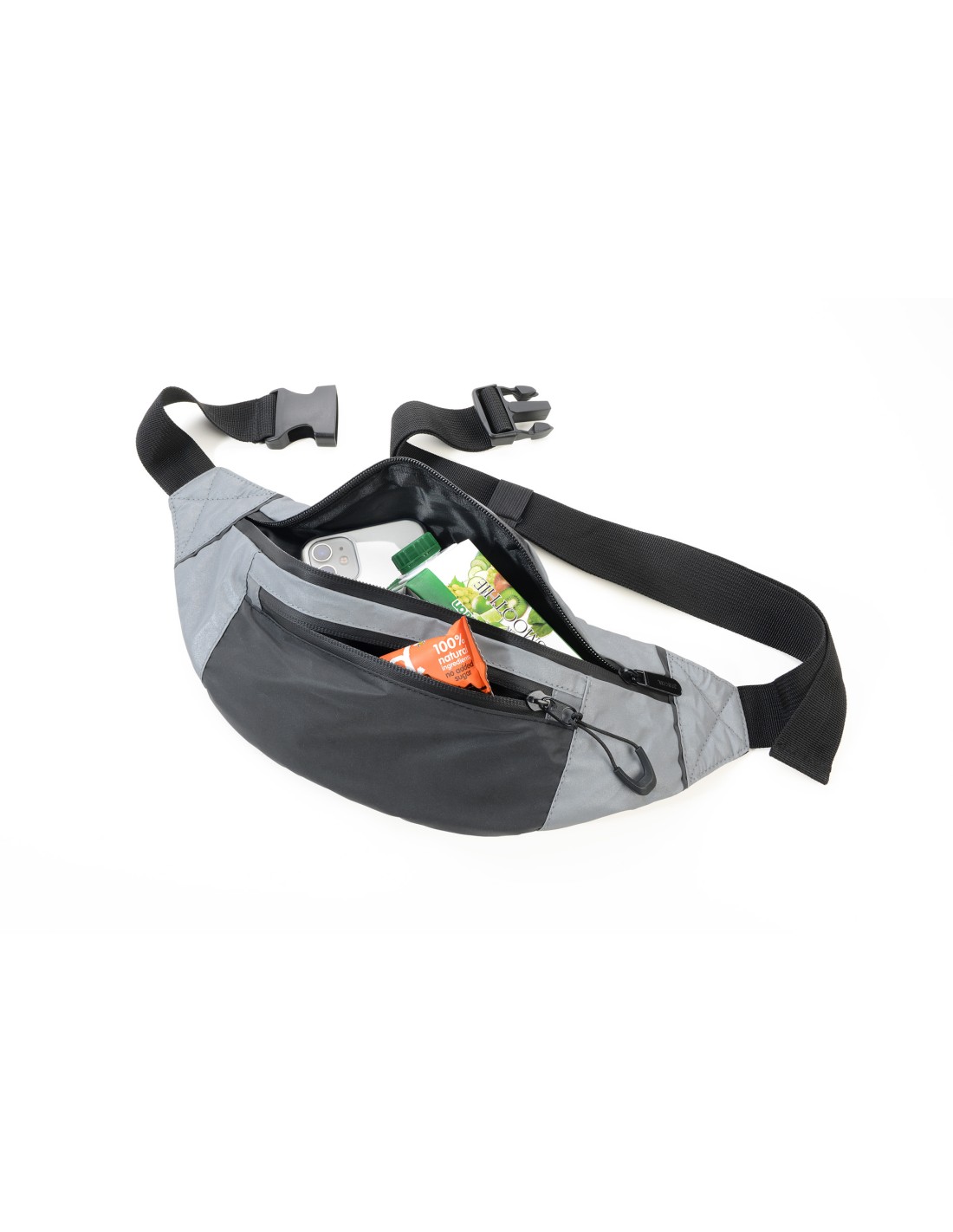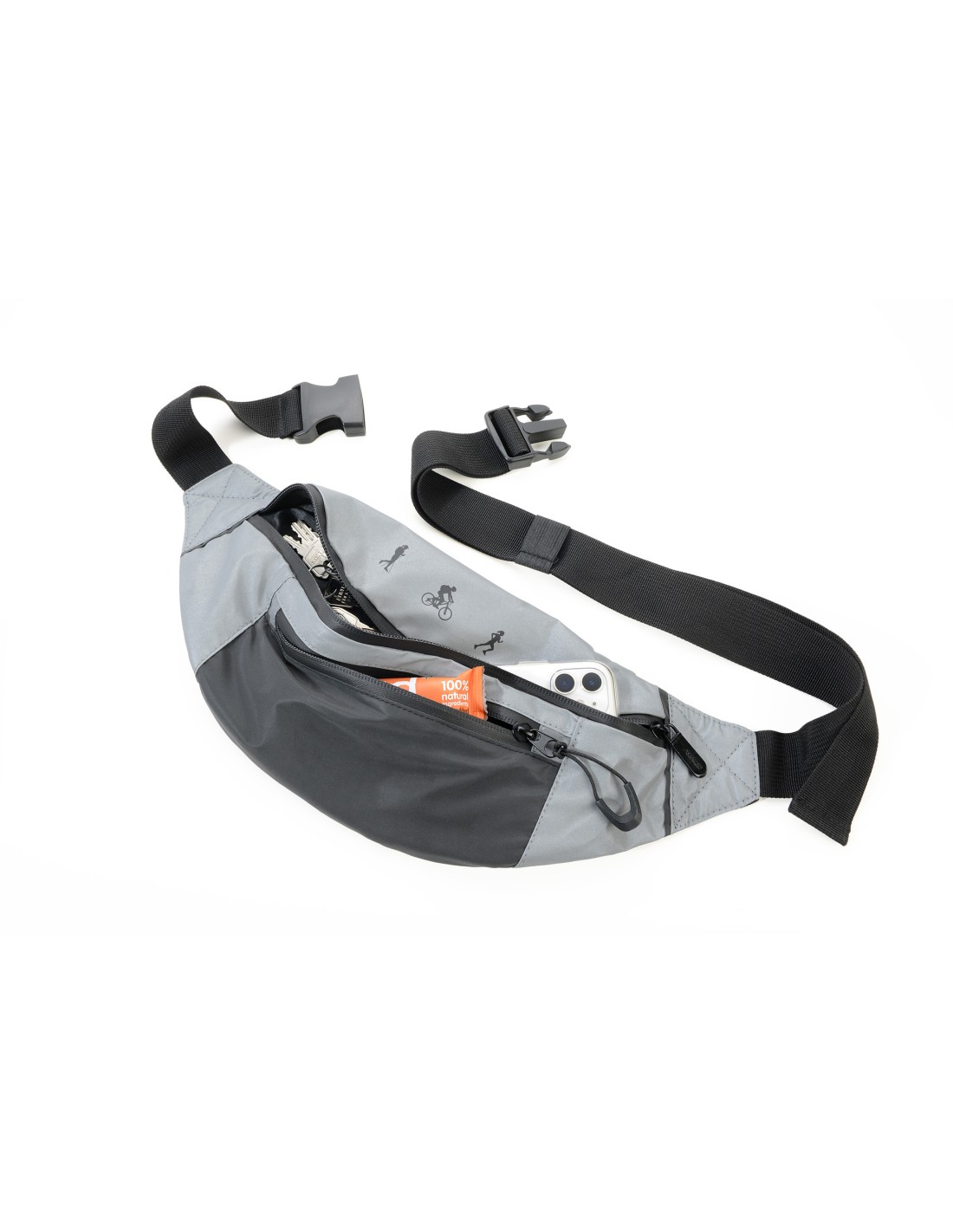 Gürteltasche mit 3 Reißverschlussfächern, reflektierend, kann über die Brust, den Rücken oder um die Hüfte getragen werden, Hauptfach, Frontfach, rückseitiges Geheimfach, Reißverschlüsse gummiert, spritzwassergeschützt (Wasserdichtheitsgrad IPX4), verstellbarer Gurt, gepolsterte Rückseite, Polyester, grau/schwarz