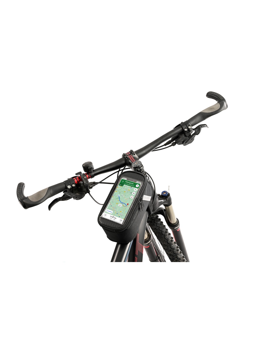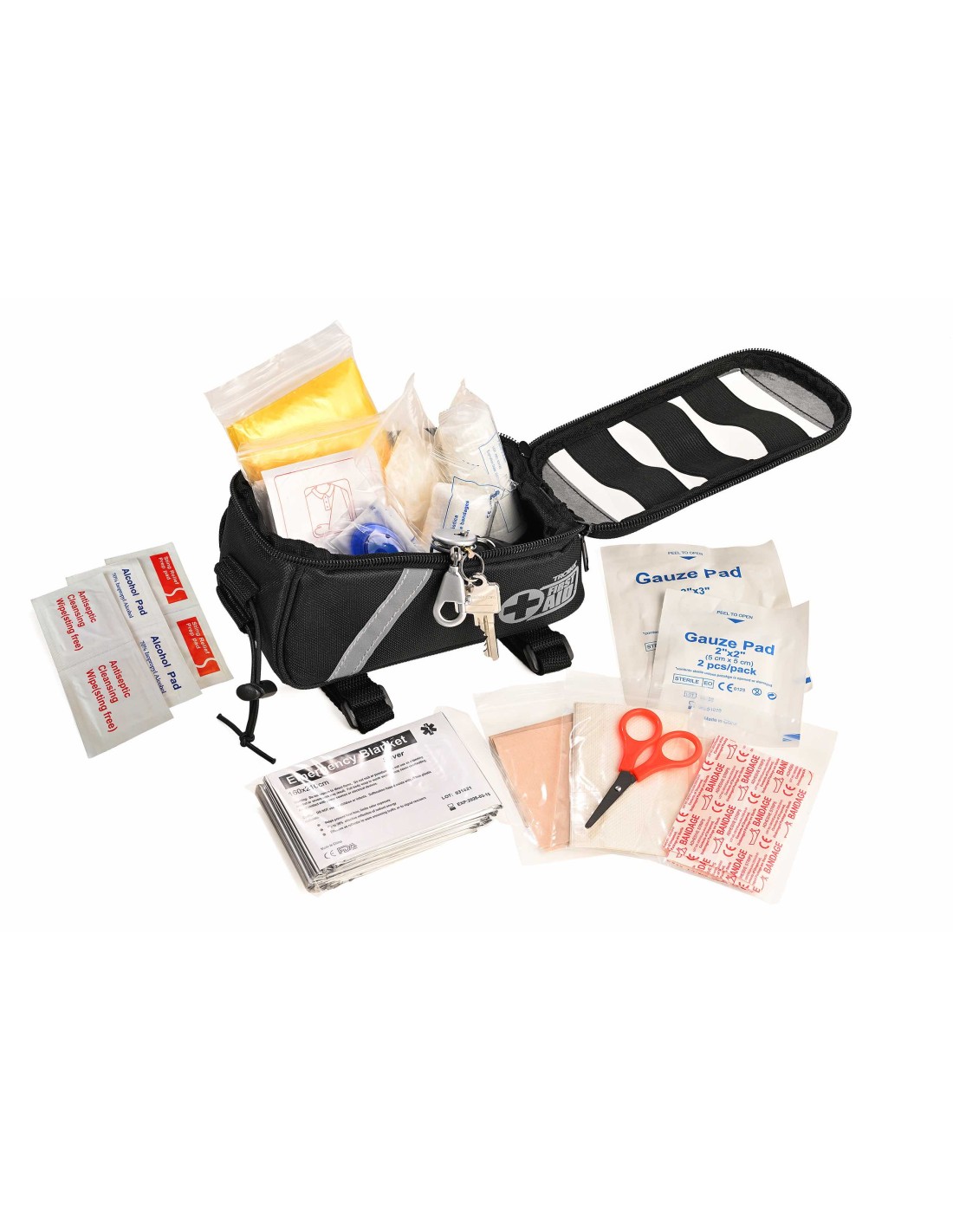 Fahrradtasche für den Rahmen inkl. Erste-Hilfe-Set und Smartphone-Halterung, flexible Befestigung mit Klettbändern, Touchscreen-Sichtfenster passend für gängige mobile Geräte zur Navigation (Elastikbänder), Inhalt: Regenponcho aus PE, 2x Polyester-Wundverband, 1 Mund-zu-Mund-Maske, 1 Paar Vinylhandschuhe, 2 Alkoholtupfer, 2 antiseptische Tücher (BAC), 2 Auflagen für Insektenstiche, 1 Rettungsdecke - silberfarben, 1 Dreieckstuch, 4 Mullkompressen, 27 verschiedene Pflaster, 1 Schere 9 cm, reflektierende seitliche Streifen, 100% Polyester, Nylon, bedruckt, matt, schwarz