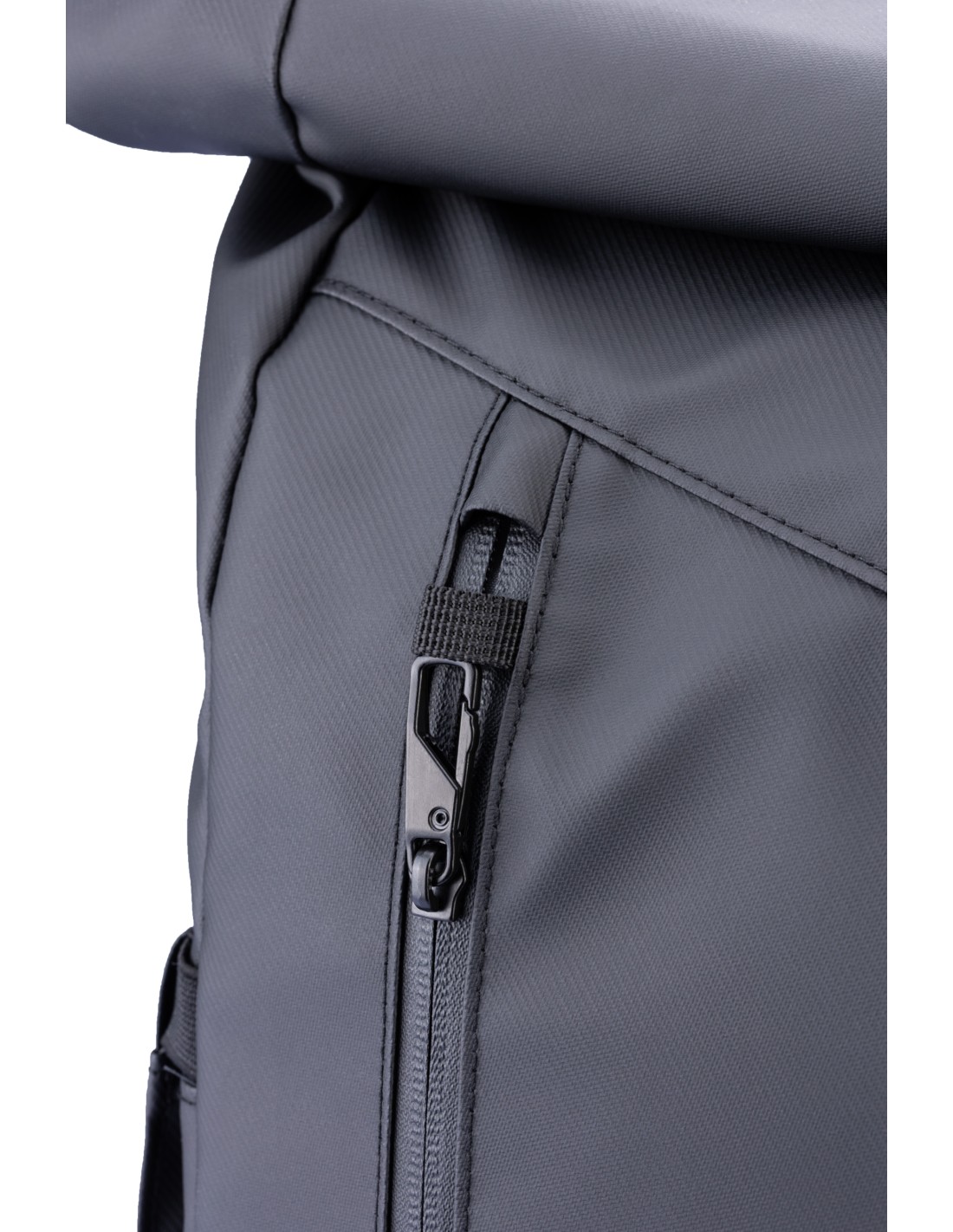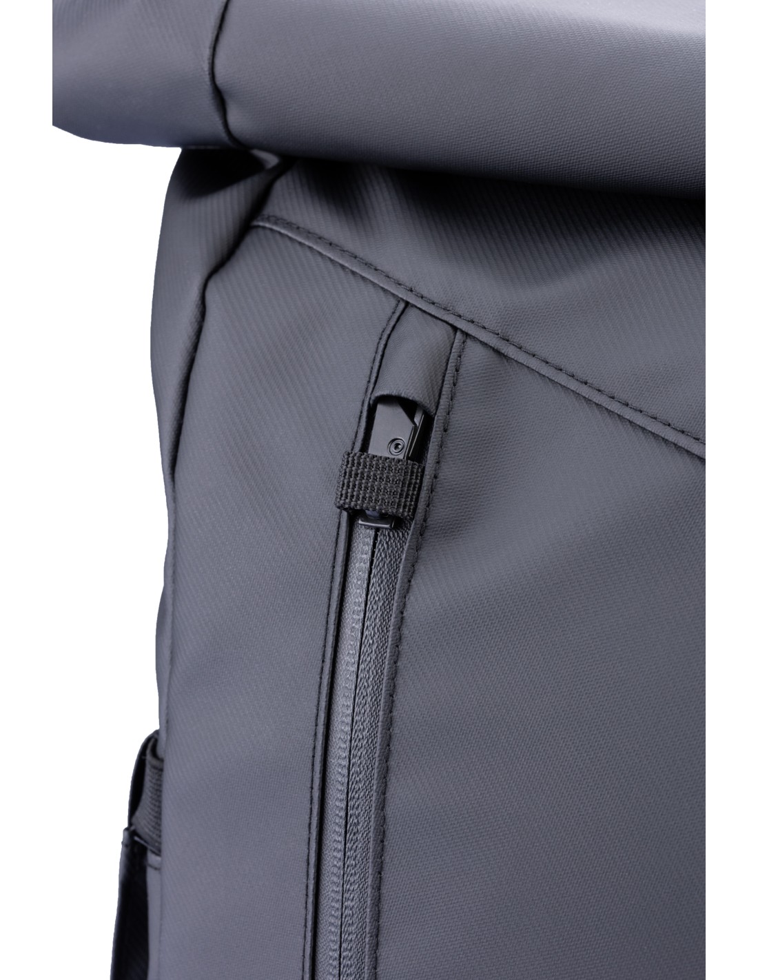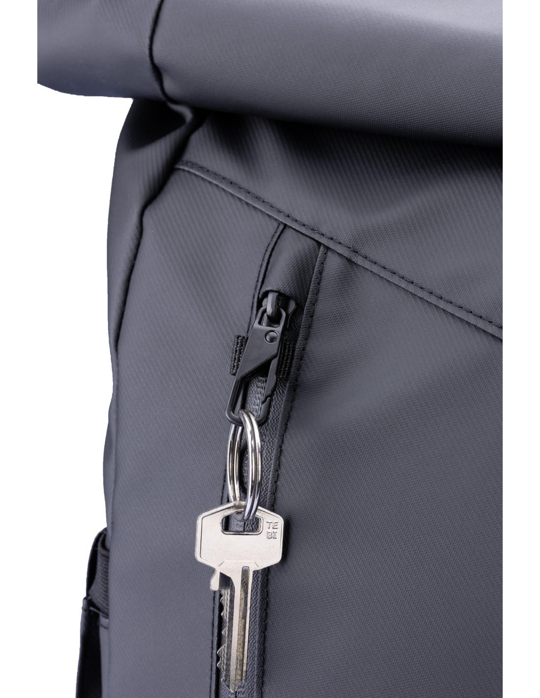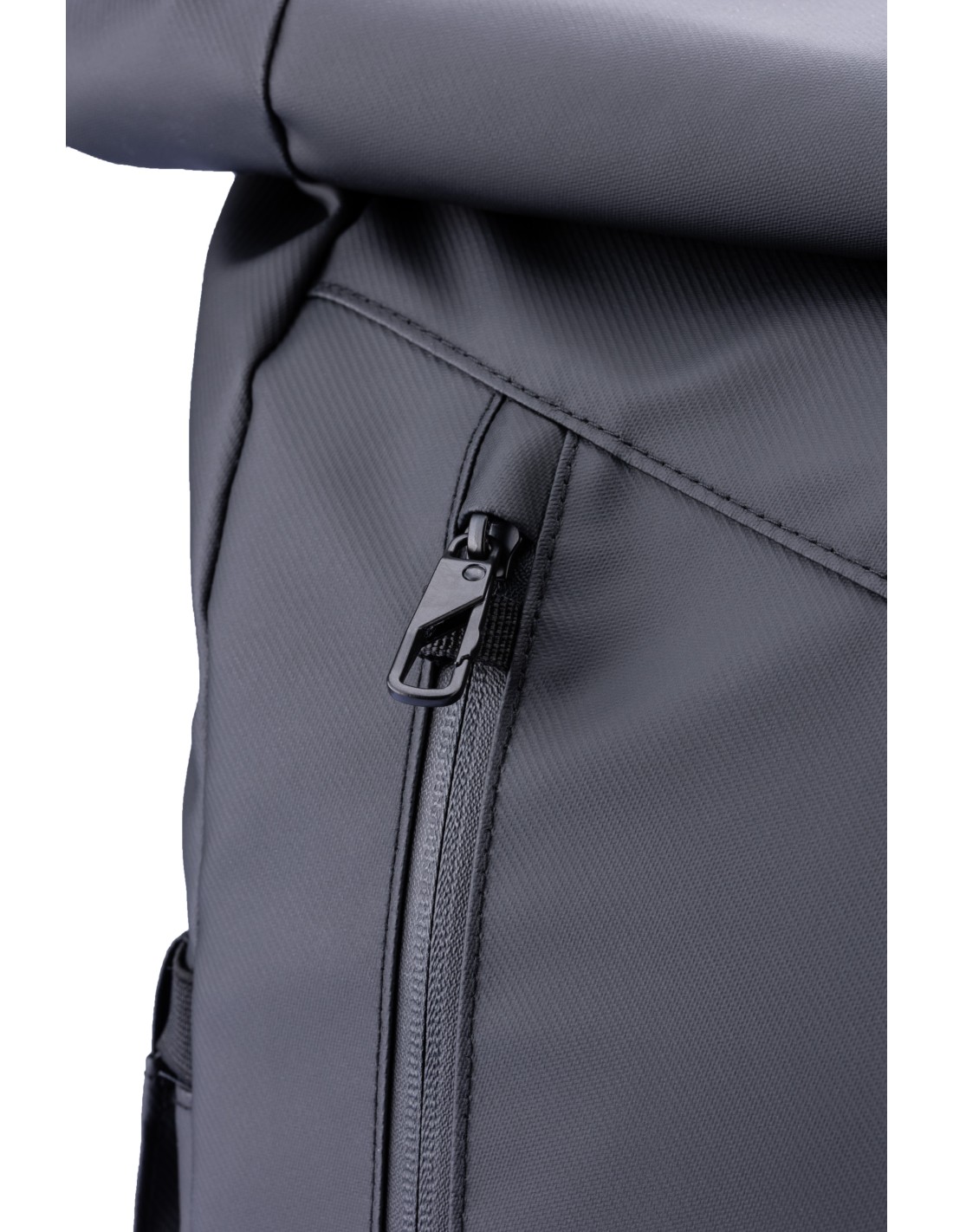 Roll Top Rucksack mit magnetischem Sicherungsverschluss aus Metall, wasserabweisende Reißverschlüsse außen, Hauptfach: 1 Reißverschlussfach inkl. Geheimfach für mini Tracking-Geräte (z.B. APPLE AirTag® Ortungsknopf) + 2 Einschubfächern mit Klettverschluss, Fronttasche mit versteckbarem Reißverschluss-Schieber als Mini-Karabiner (Diebstahlschutz), 2 Seitentaschen, rückseitiges Geheimfach, gepolsterte Schultergurte, Schlaufe zur Befestigung am Trolley, abgesetzter Standboden, Kapazität ca. 17,5 Liter, Tragkraft bis zu 15 kg, widerstandsfähiges Material, spritzwassergeschützt (Wasserdichtheitsgrad IPX4), Tarpaulin: 80% Polyester, 20% Polyurethan (PU), Polyester, Polyurethan, Tarpaulin (Plane), schwarz