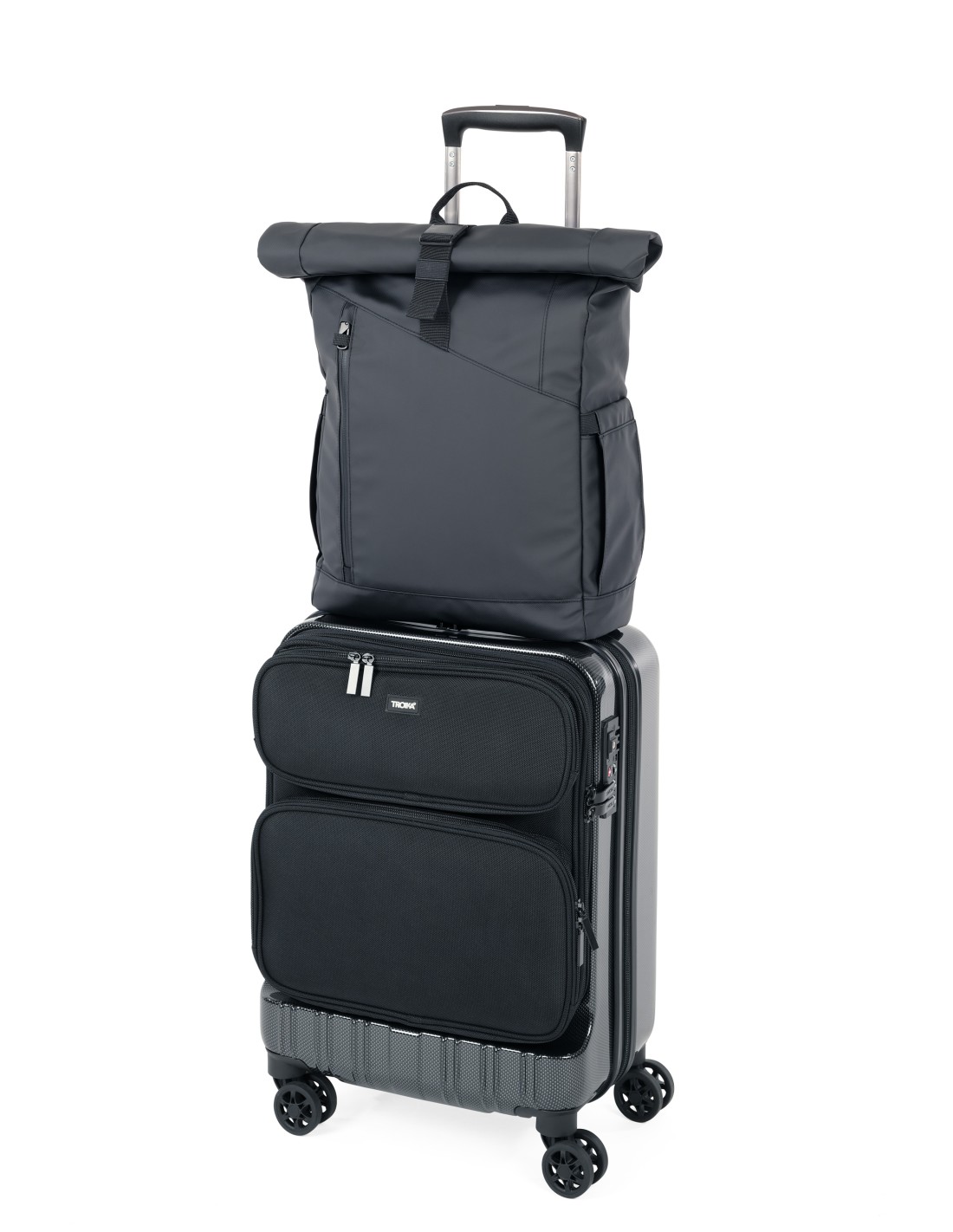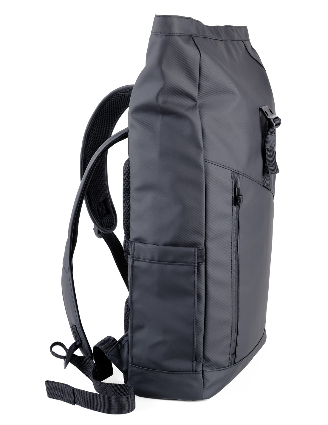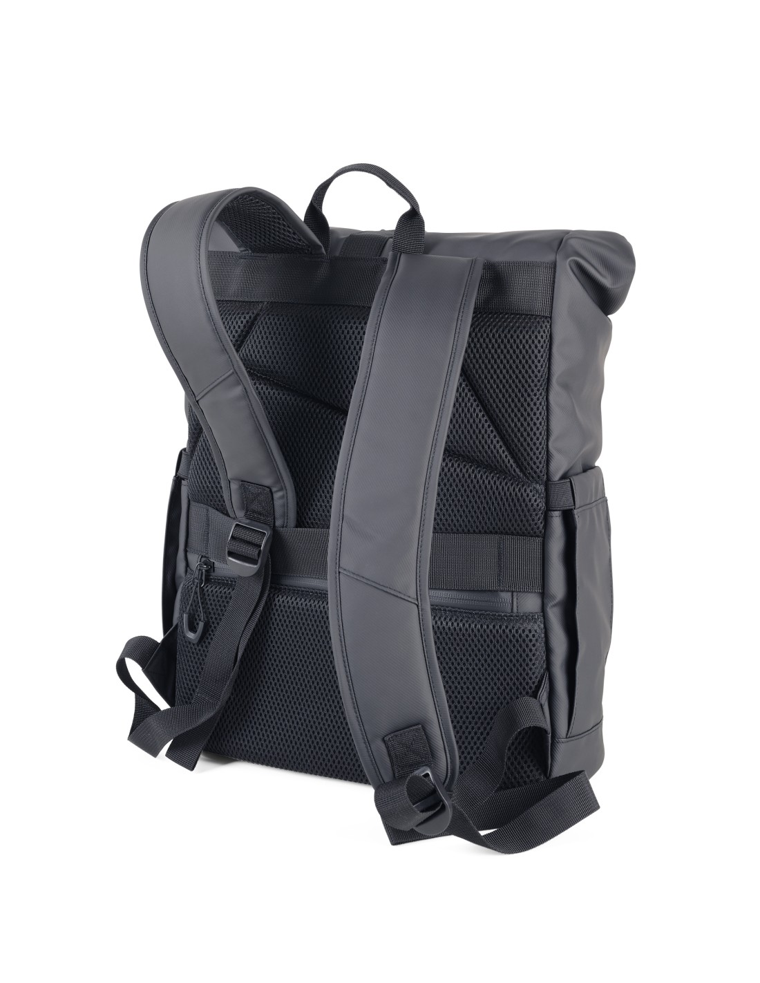 Roll Top Rucksack mit magnetischem Sicherungsverschluss aus Metall, wasserabweisende Reißverschlüsse außen, Hauptfach: 1 Reißverschlussfach inkl. Geheimfach für mini Tracking-Geräte (z.B. APPLE AirTag® Ortungsknopf) + 2 Einschubfächern mit Klettverschluss, Fronttasche mit versteckbarem Reißverschluss-Schieber als Mini-Karabiner (Diebstahlschutz), 2 Seitentaschen, rückseitiges Geheimfach, gepolsterte Schultergurte, Schlaufe zur Befestigung am Trolley, abgesetzter Standboden, Kapazität ca. 17,5 Liter, Tragkraft bis zu 15 kg, widerstandsfähiges Material, spritzwassergeschützt (Wasserdichtheitsgrad IPX4), Tarpaulin: 80% Polyester, 20% Polyurethan (PU), Polyester, Polyurethan, Tarpaulin (Plane), schwarz