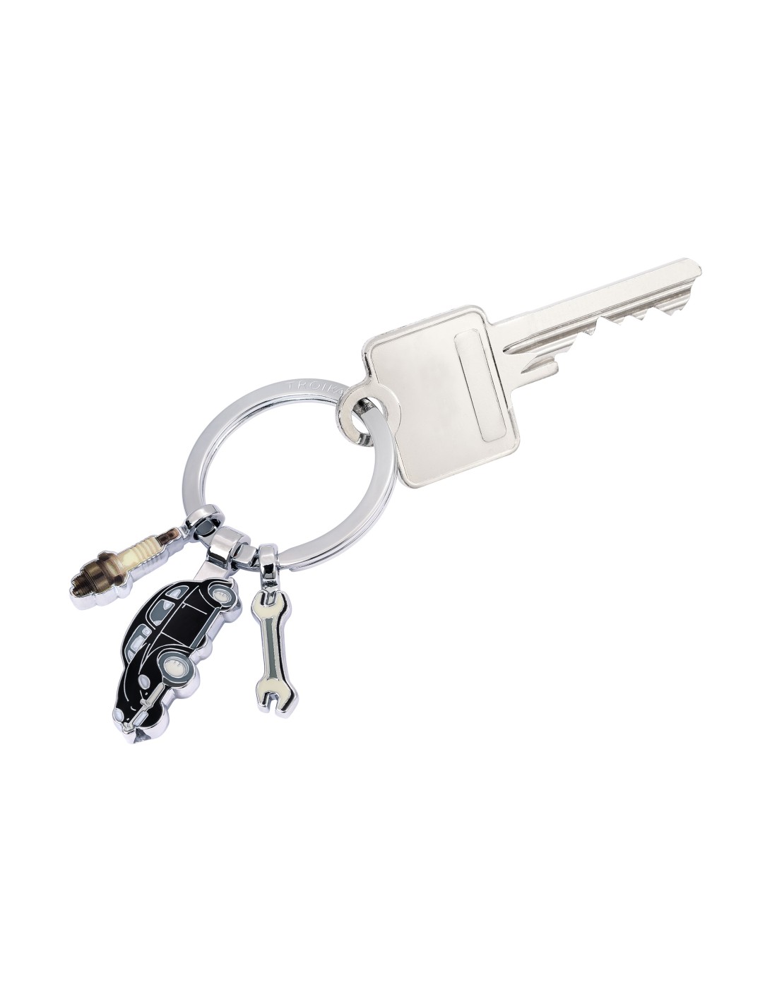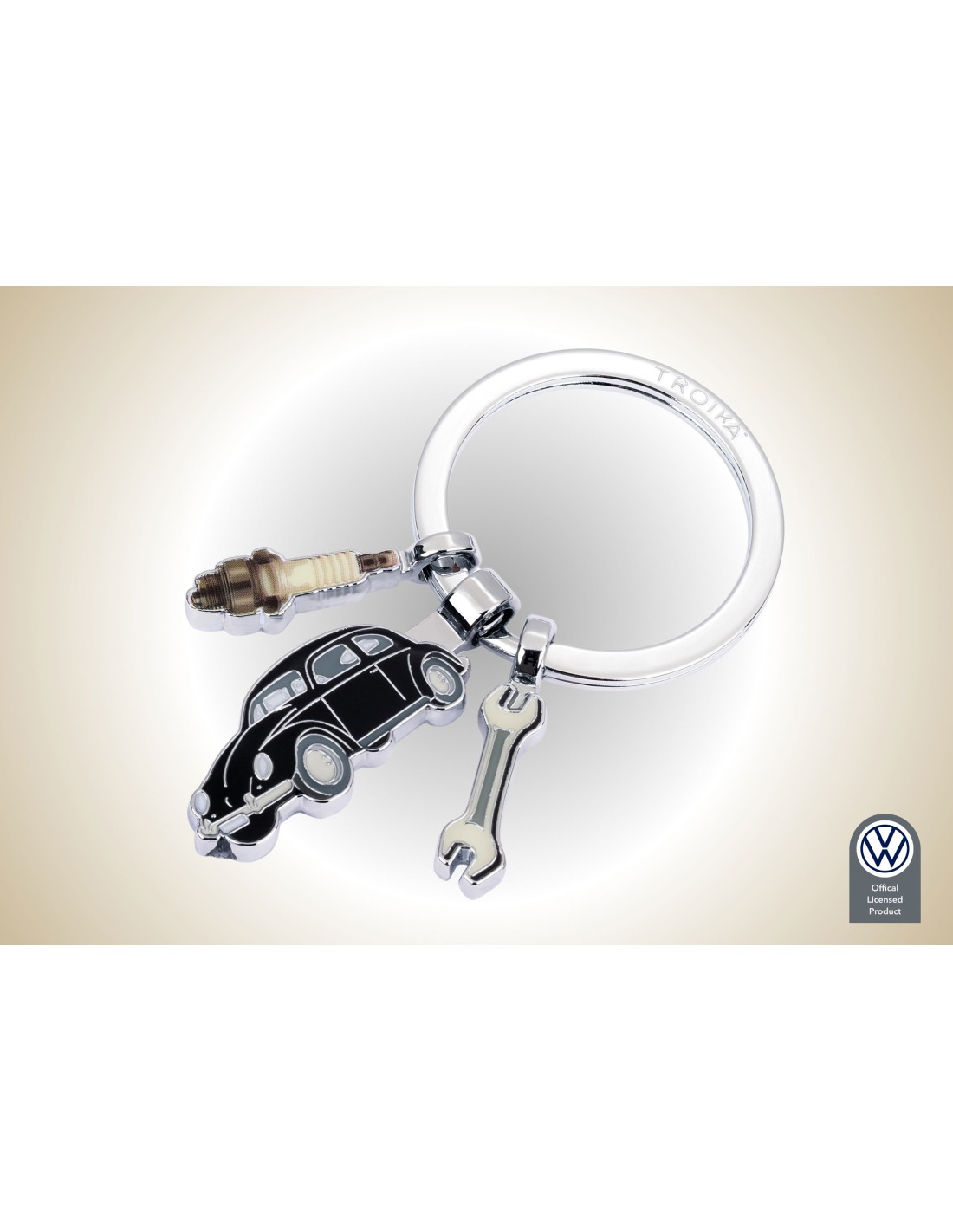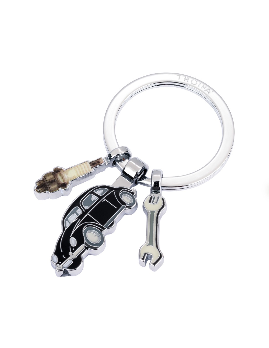 Schlüsselanhänger mit 3 Anhängern, Volkswagen Typ 1, Schraubenschlüssel, Zündkerze, Emaille, Metallguss, verchromt, glänzend, schwarz/silberfarben