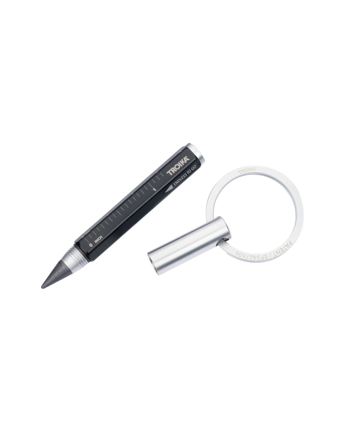 Multitasking-Bleistift und Schlüsselanhänger mit nachhaltiger Endlos-Schreibspitze (ca. 20km Schreiblänge), schnelles & einfaches Anbringen der Schlüssel dank patentiertem Öffnungsmechanismus (TROIKA NAIL GUARD), Zentimeter-/Zoll-Lineal, HB, radierbar, ohne Anspitzen, Schreibspitze austauschbar, Aluminium, matt, schwarz/silberfarben