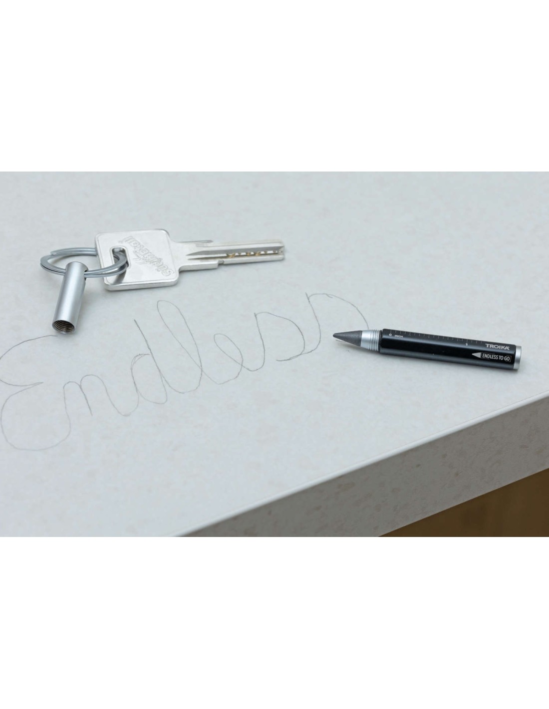 Multitasking-Bleistift und Schlüsselanhänger mit nachhaltiger Endlos-Schreibspitze (ca. 20km Schreiblänge), schnelles & einfaches Anbringen der Schlüssel dank patentiertem Öffnungsmechanismus (TROIKA NAIL GUARD), Zentimeter-/Zoll-Lineal, HB, radierbar, ohne Anspitzen, Schreibspitze austauschbar, Aluminium, matt, silberfarben