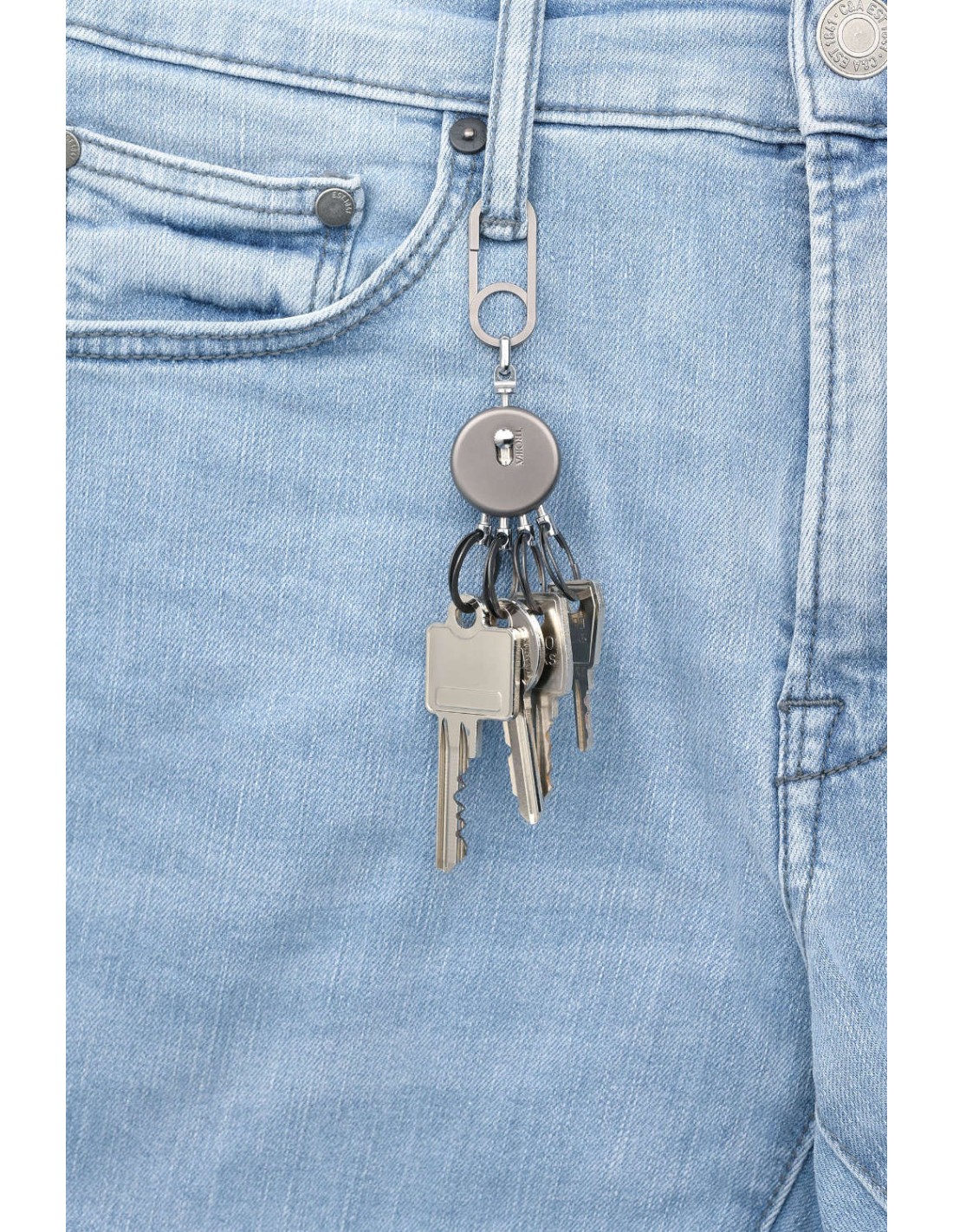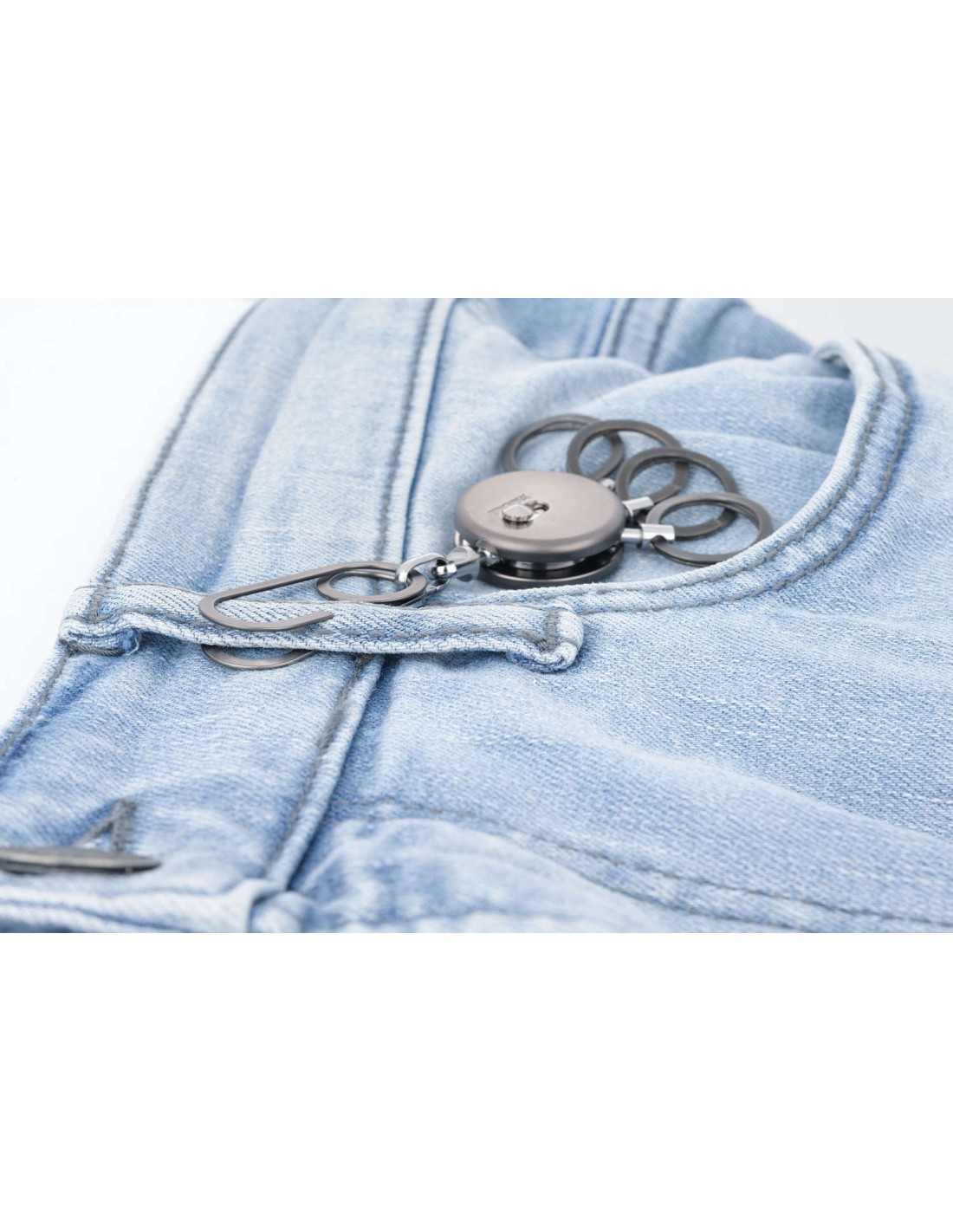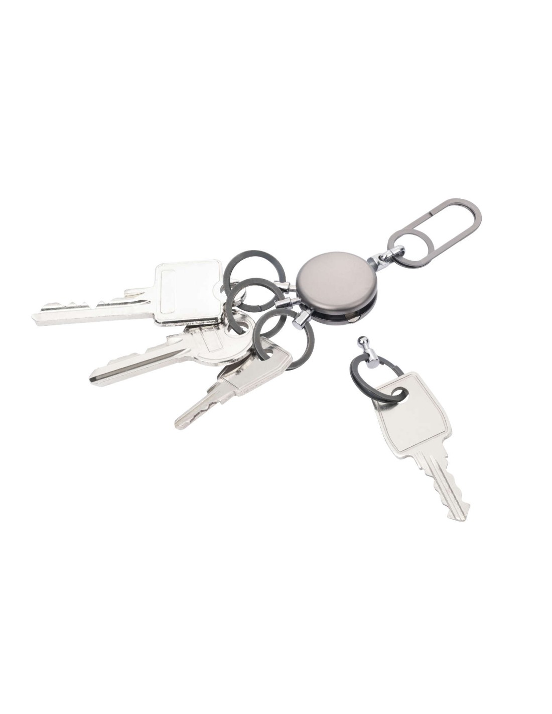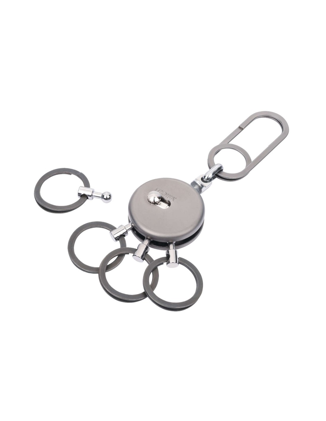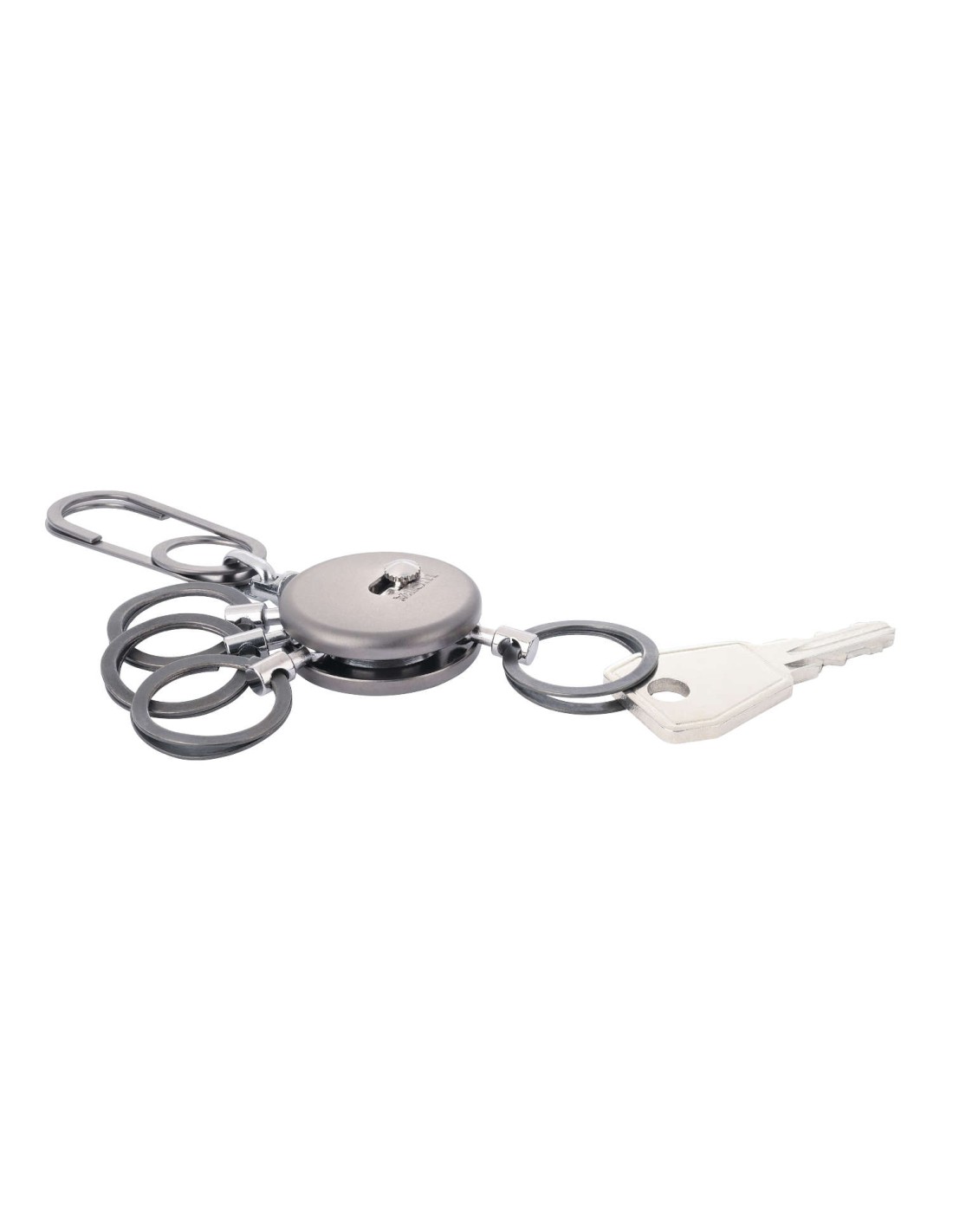 Schlüsselanhänger, rund, inkl. Karabinerhaken, 4 ausklinkbare Ringe, schnelles & einfaches Anbringen der Schlüssel dank patentiertem Öffnungsmechanismus (TROIKA NAIL GUARD), Messing, Metall, verchromt, matt, gunmetal