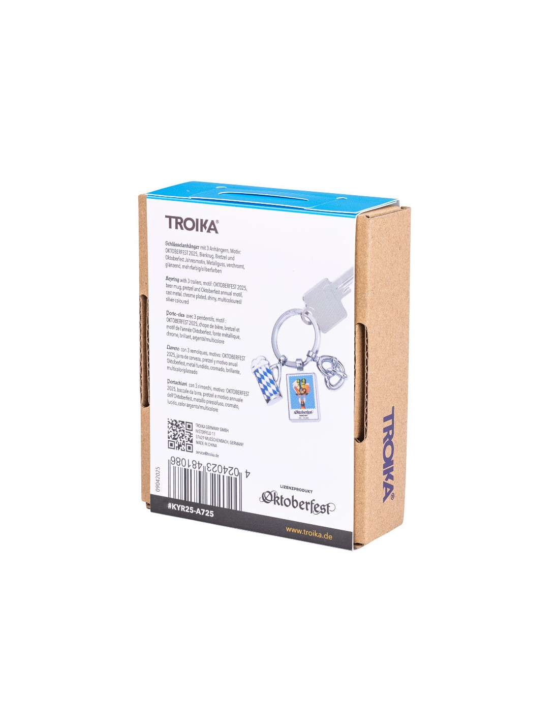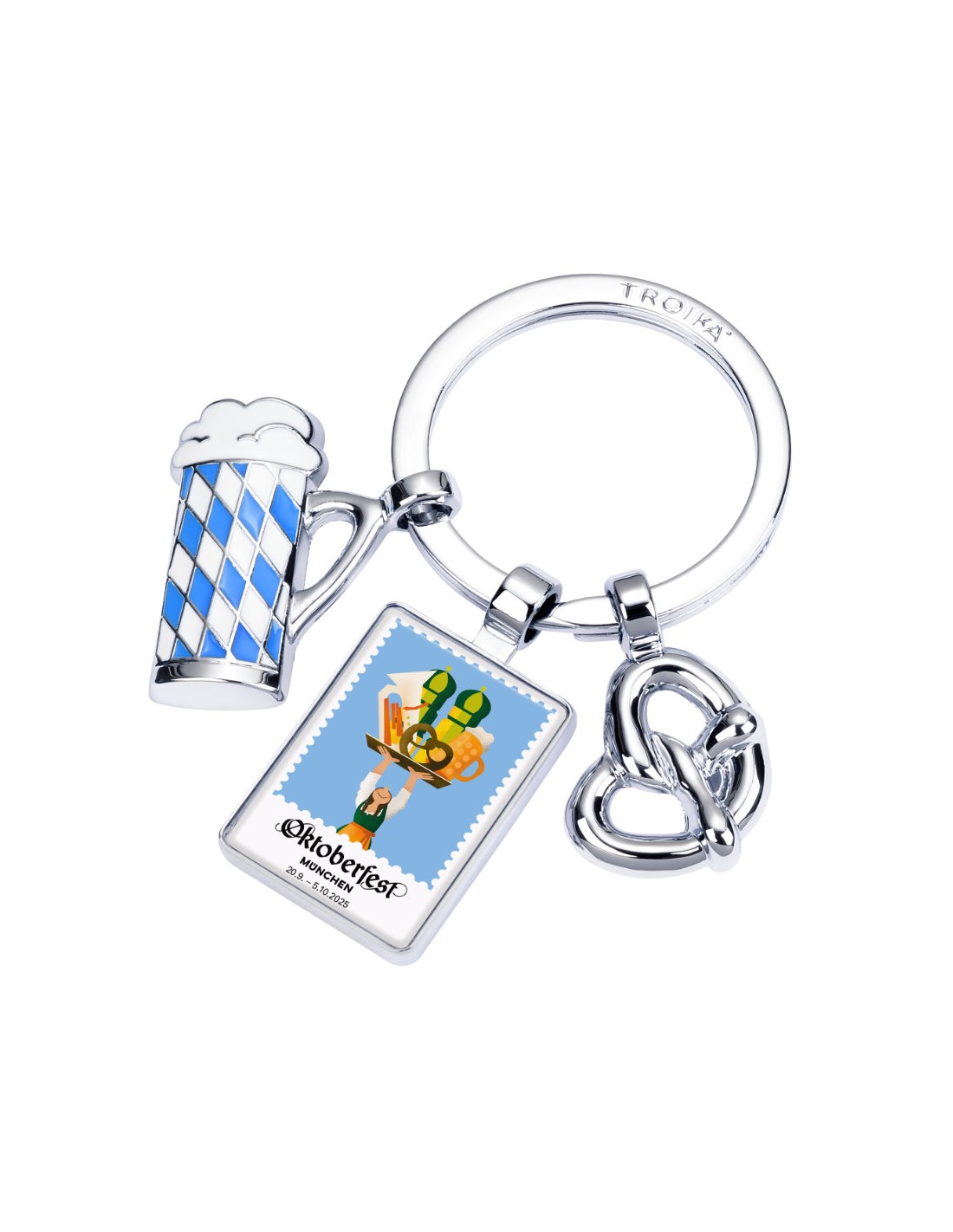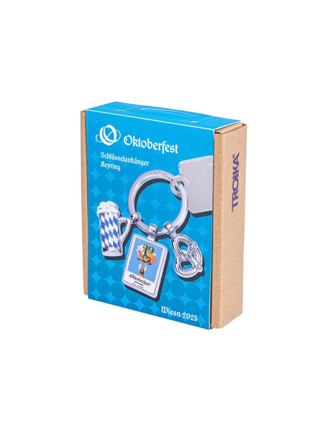 Schlüsselanhänger mit 3 Anhängern, Motiv: OKTOBERFEST 2025, Bierkrug, Bretzel und Oktoberfest Jahresmotiv, Metallguss, verchromt, glänzend, mehrfarbig/silberfarben