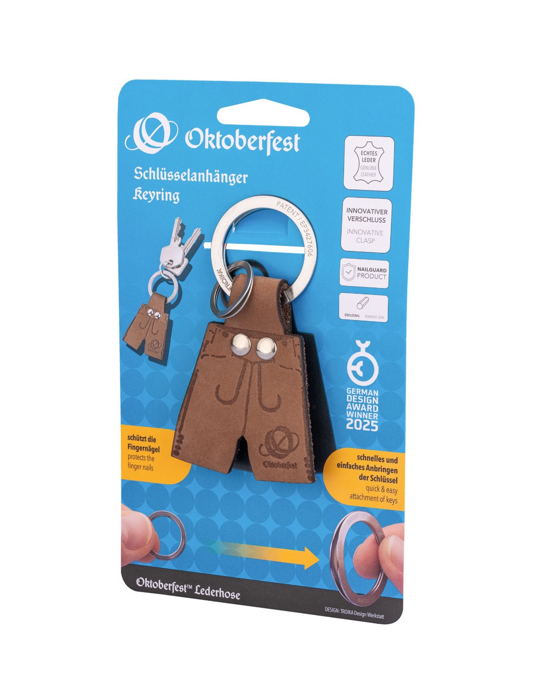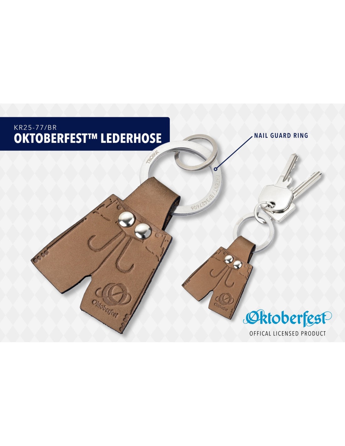 Schlüsselanhänger Lederhose, Motiv: OKTOBERFEST, schnelles & einfaches Anbringen der Schlüssel dank patentiertem Öffnungsmechanismus (TROIKA NAIL GUARD), Leder (Made in Germany), braun