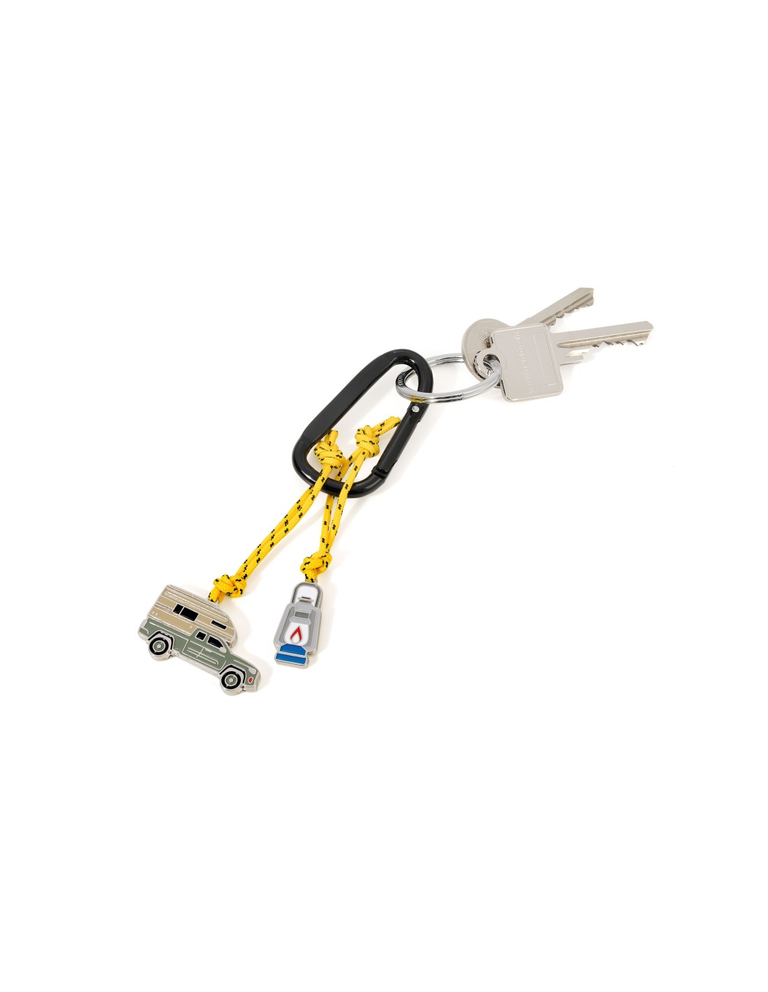 Schlüsselanhänger mit Karabinerhaken, 2 Anhänger an dekorativem Kletterseil: Öllampe und Pick-Up Camper, Aluminium, Nylon, mehrfarbig