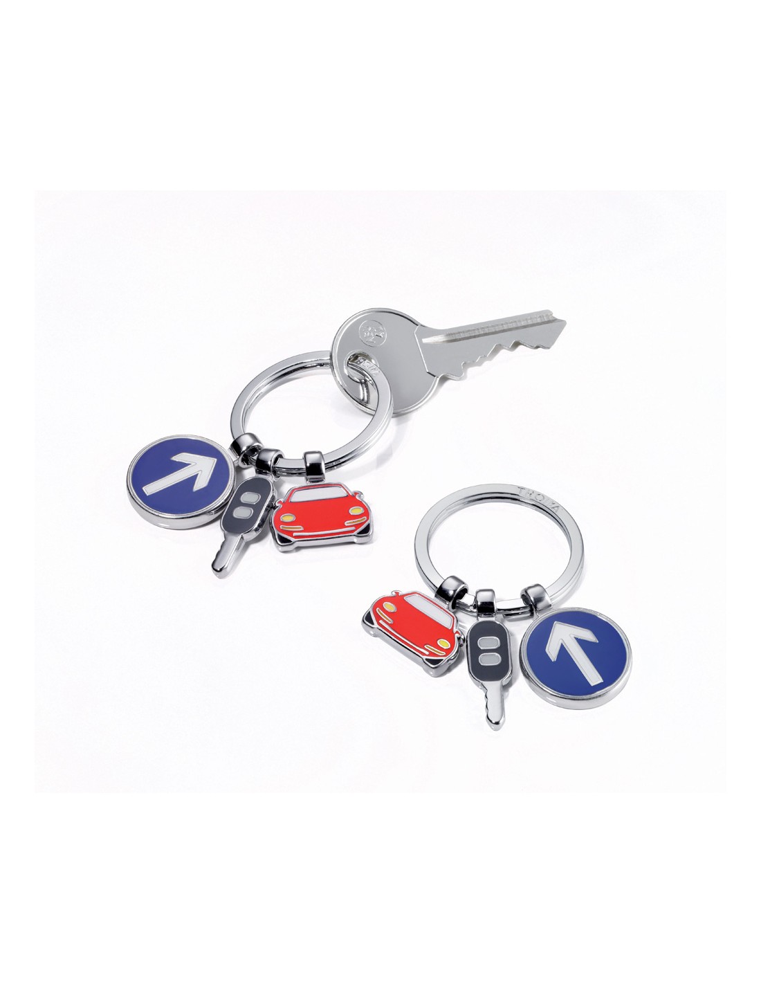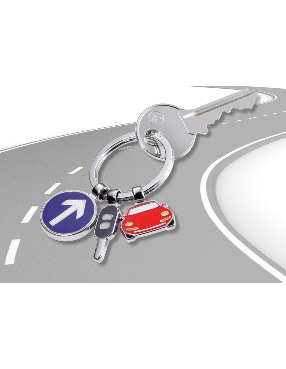 Schlüsselanhänger mit 3 Anhängern, Auto, Autoschlüssel, Verkehrsschild, Metallguss/Emaille, verchromt, glänzend, mehrfarbig
