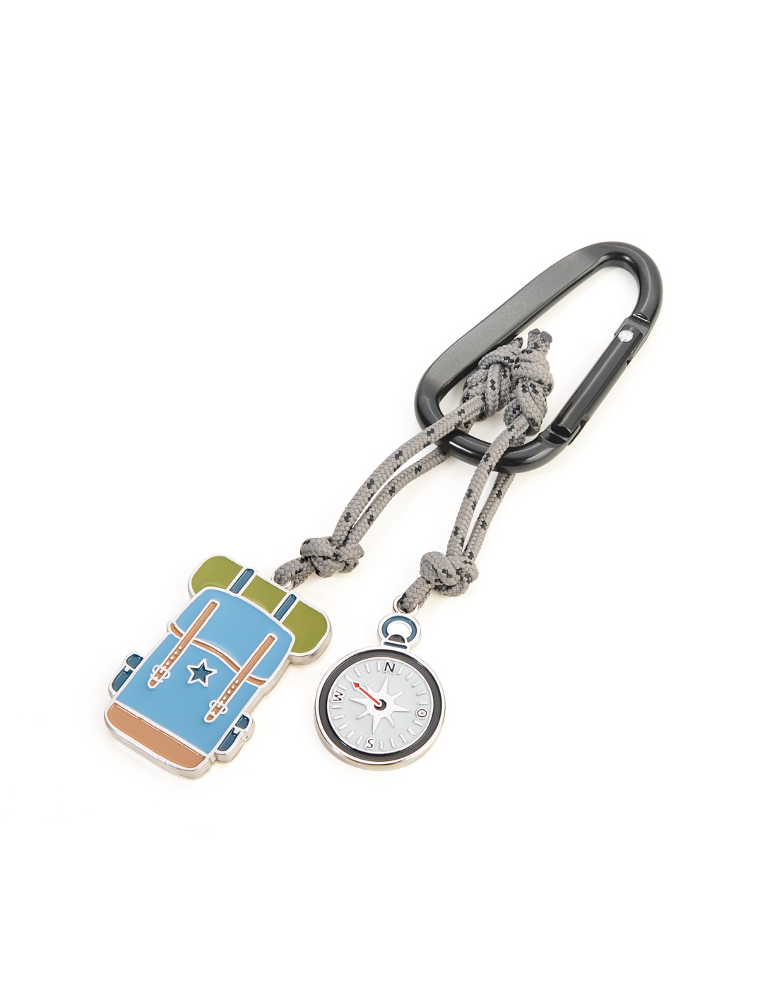 Schlüsselanhänger mit Karabinerhaken, 2 Anhänger an dekorativem Kletterseil: Wanderrucksack und Kompass, Aluminium, Emaille, Metallguss, Nylon, mehrfarbig