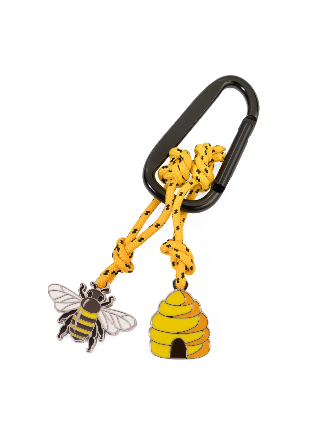 Schlüsselanhänger mit Karabinerhaken, 2 Anhänger an dekorativem Kletterseil: Biene, Bienenkorb, Aluminium, Emaille, Metallguss, Nylon, glänzend, gelb/schwarz/silberfarben