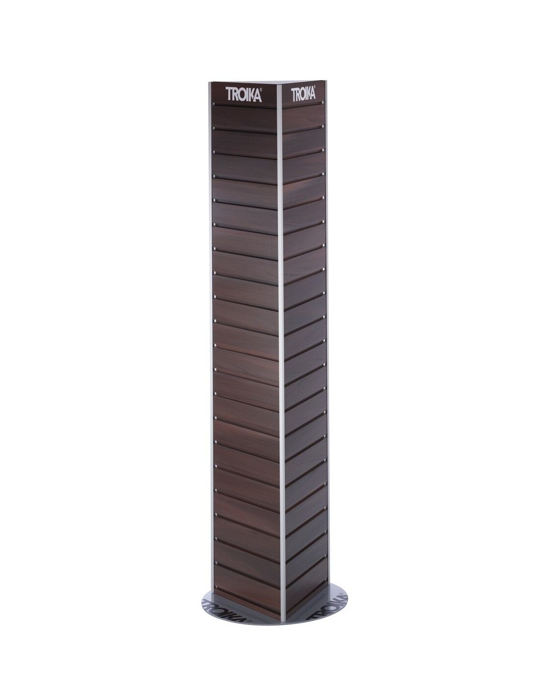 Bodendisplay zur Selbstbedienung, dreiseitige Lamellenwand, Holzoptik, für Eurohaken (10F306, 10F307, 10F308, 10F312), für Regalboden (10F309, 10F311), Standfuß (rund), mit TROIKA-Logo, drehbar, Kunststoff/Aluminium/Stahl, matt, braun/silber