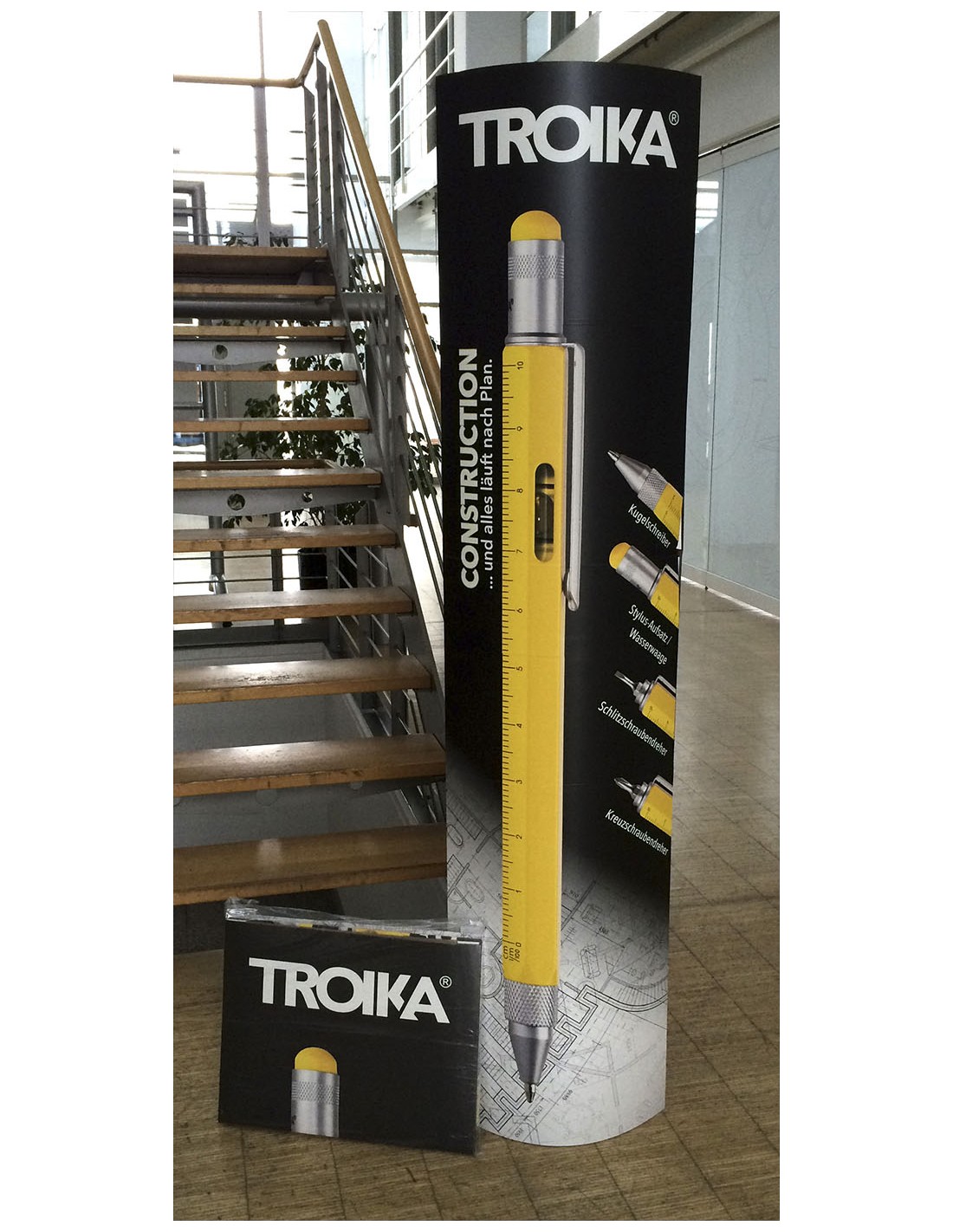 Thekendisplay zur Selbstbedienung, einseitige Lamellenwand, Holzoptik, für Eurohaken (10F306, 10F307, 10F312), Standfuß (rechteckig), mit TROIKA-Logo, Kunststoff/Aluminium/MDF, matt, braun/schwarz/silber