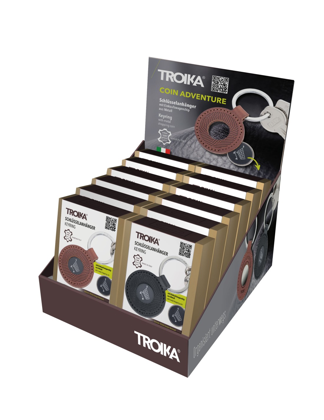 Thekendisplay inkl. 12 x TROIKA COIN ADVENTURE Schlüsselanhänger (KR23-05/..), vorsortiert (je 6 x KR23-05/BK, KR23-05/BR), zur Selbstbedienung, Pappe, bedruckt, matt, mehrfarbig