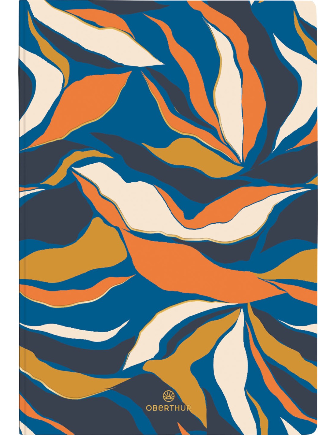 Carnet A5 Bahia Flammes avec couverture imprimée souple extra flexible avec marquage doré, ouverture à 360°, 200 pages lignées et foliotées, papier ivoire 100g, coins ronds. Tranche dorée.