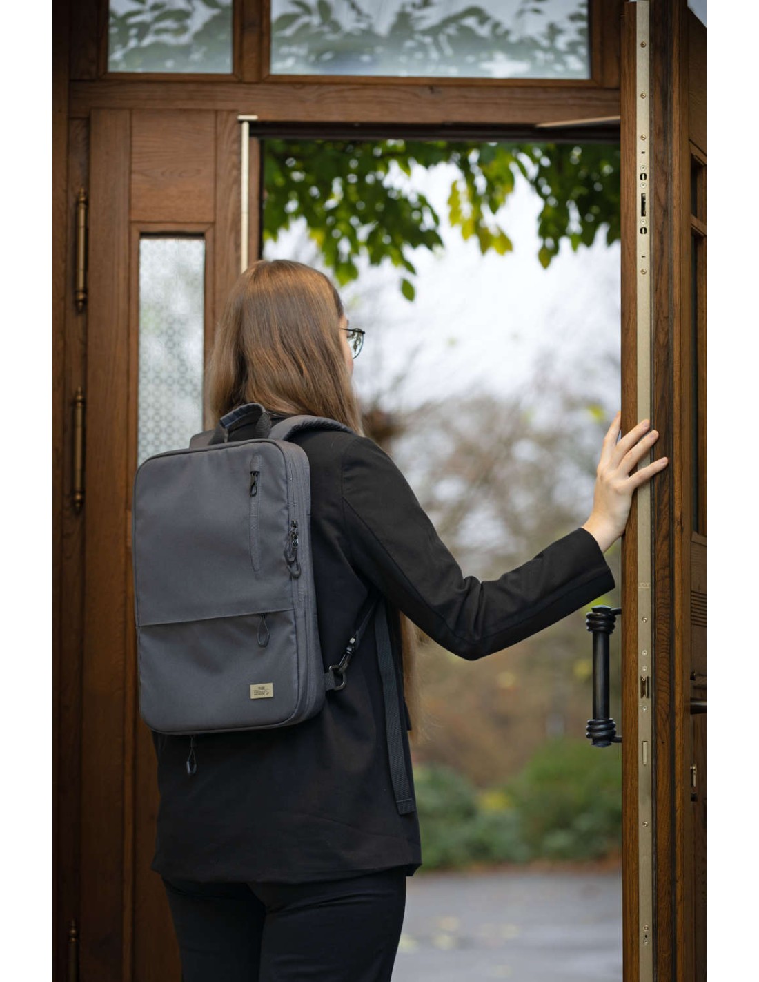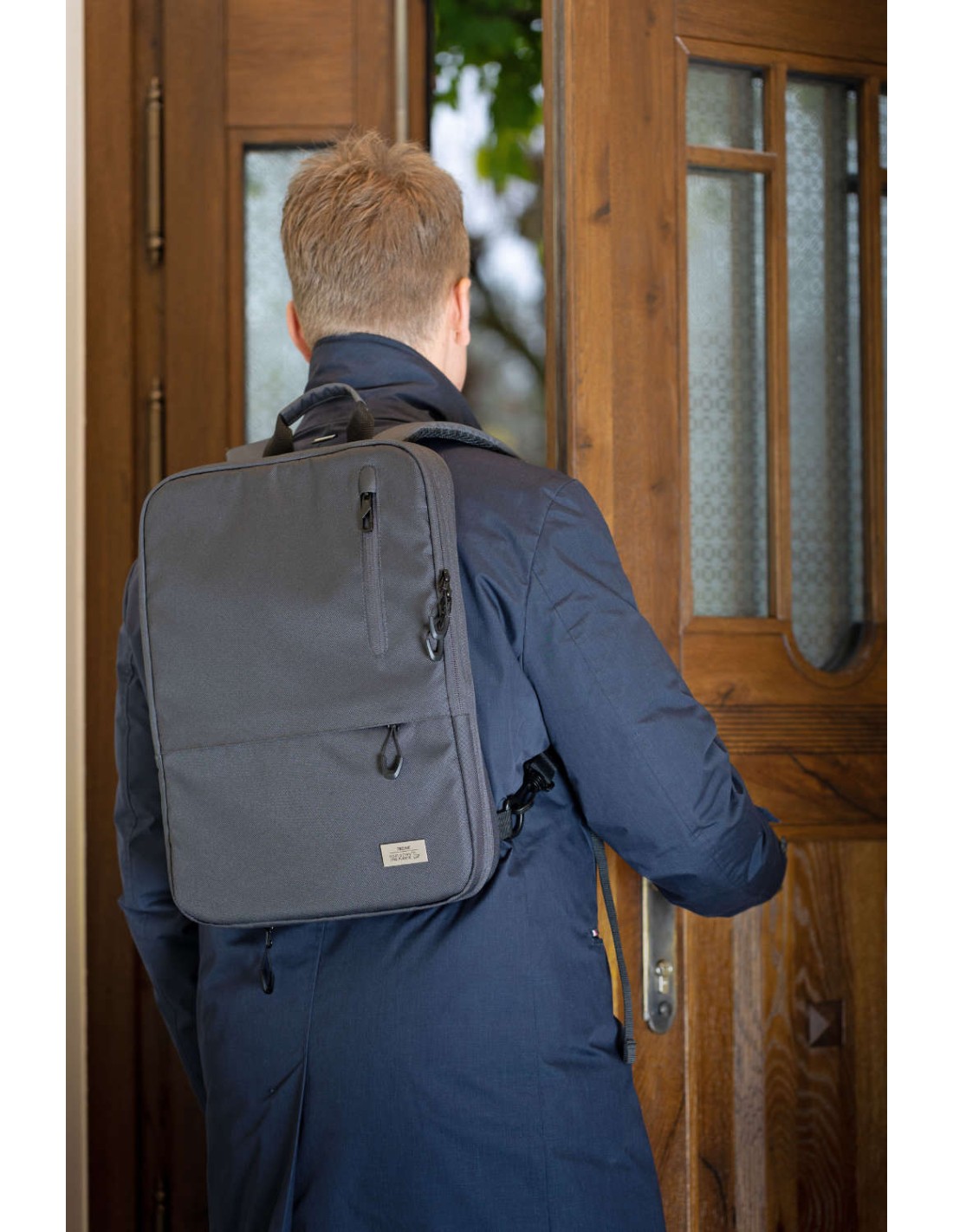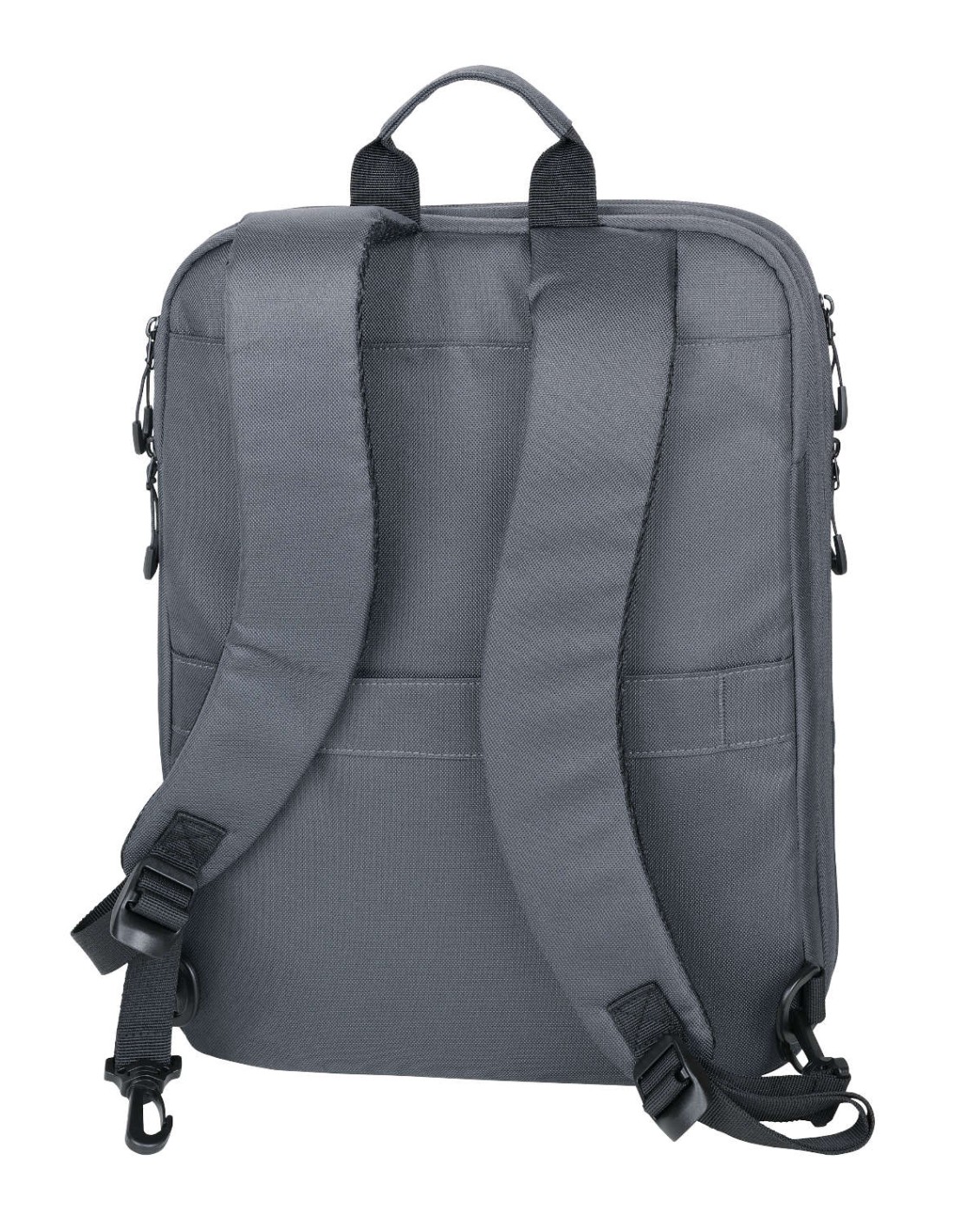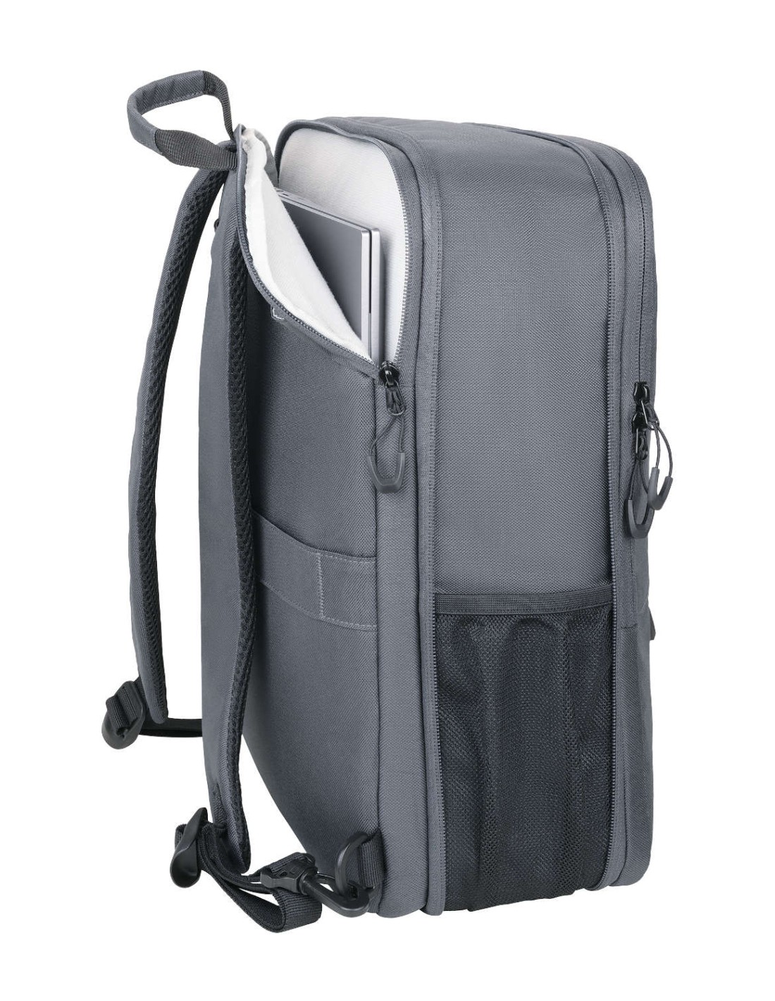 Sac à dos pour ordinateur portable en plastique marin recyclé, extensible grâce à une fermeture éclair supplémentaire, avec 2 grands compartiments (compartiment rembourré pour ordinateur portable et compartiment principal) avec fermeture éclair à double sens, pour ordinateur portable (jusqu'à 16''), plusieurs poches intérieures, 2 compartiments frontaux + 2 poches en filet expansé pour bouteille et parapluie, fond renforcé, boucle pour la fixation au trolley, poignée de transport, sangles de sac à dos cachées, Capacité extensible d'env. 6 litres à env. 14 litres, 100% rPET, plastique marin recyclé, gris foncé