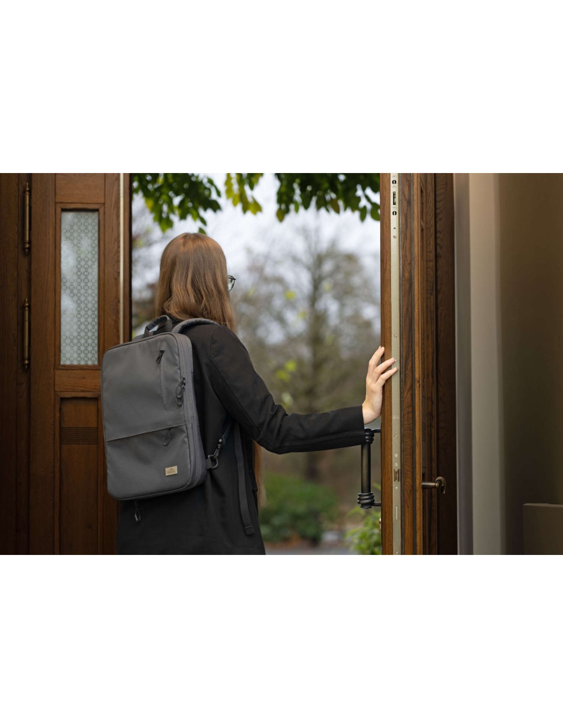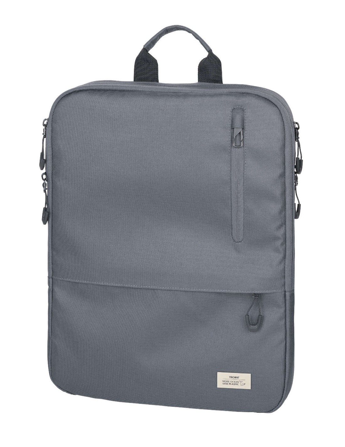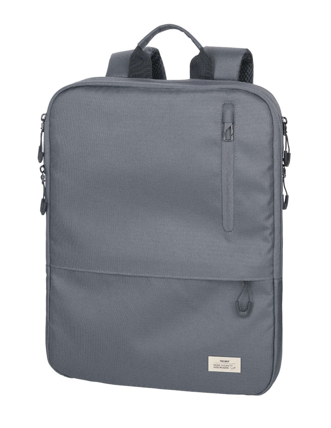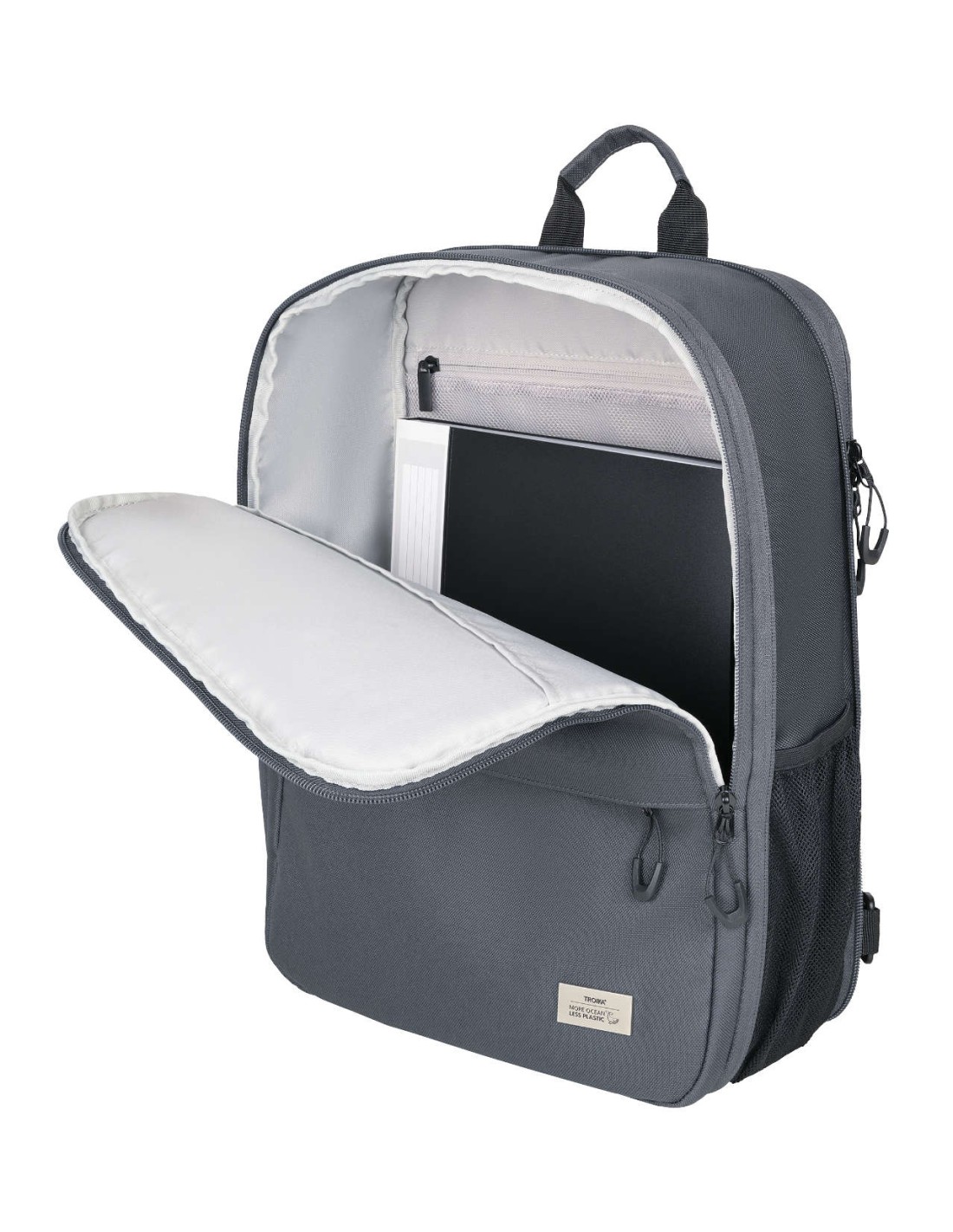 Sac à dos pour ordinateur portable en plastique marin recyclé, extensible grâce à une fermeture éclair supplémentaire, avec 2 grands compartiments (compartiment rembourré pour ordinateur portable et compartiment principal) avec fermeture éclair à double sens, pour ordinateur portable (jusqu'à 16''), plusieurs poches intérieures, 2 compartiments frontaux + 2 poches en filet expansé pour bouteille et parapluie, fond renforcé, boucle pour la fixation au trolley, poignée de transport, sangles de sac à dos cachées, Capacité extensible d'env. 6 litres à env. 14 litres, 100% rPET, plastique marin recyclé, gris foncé