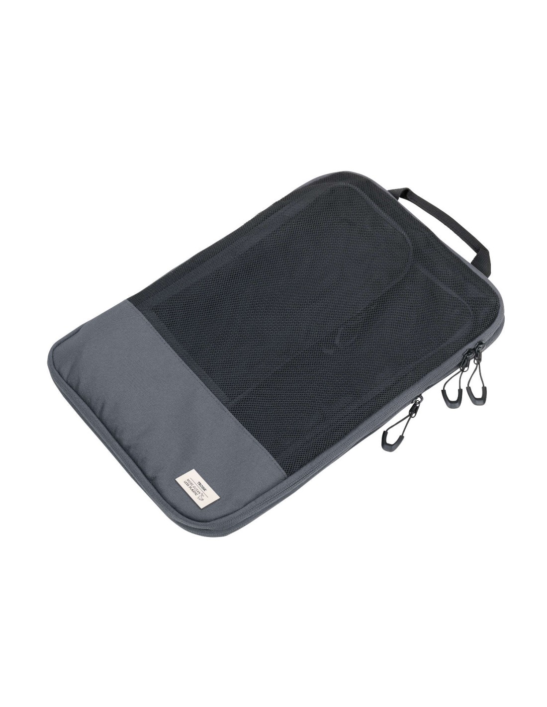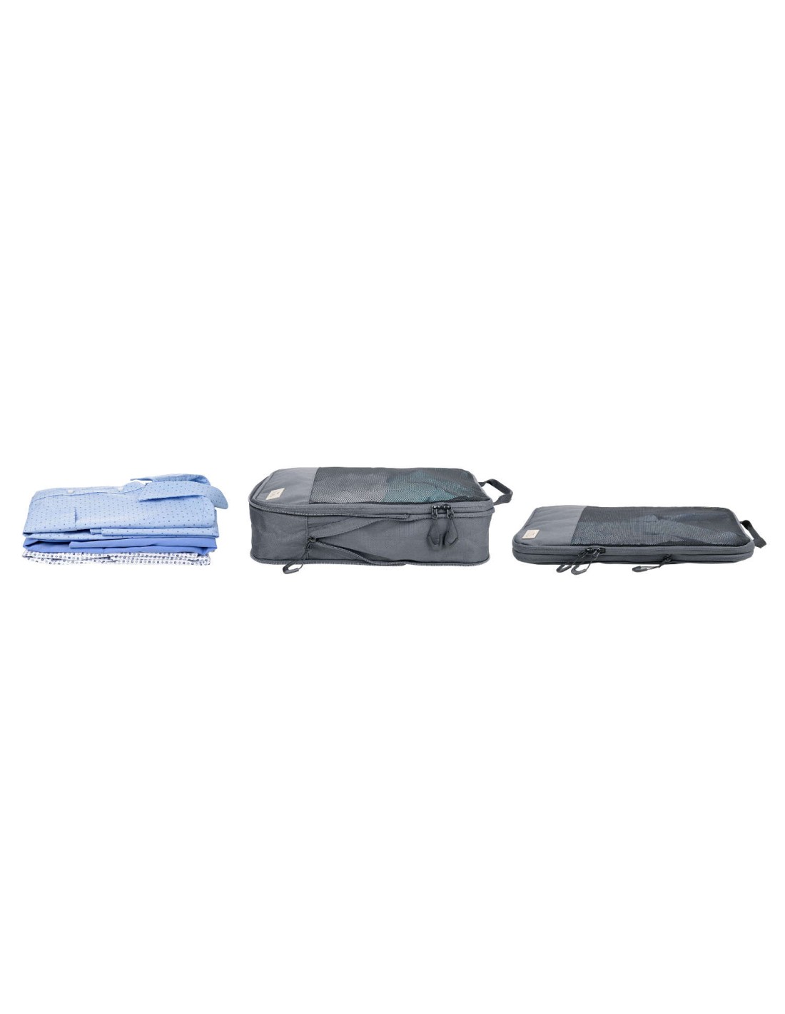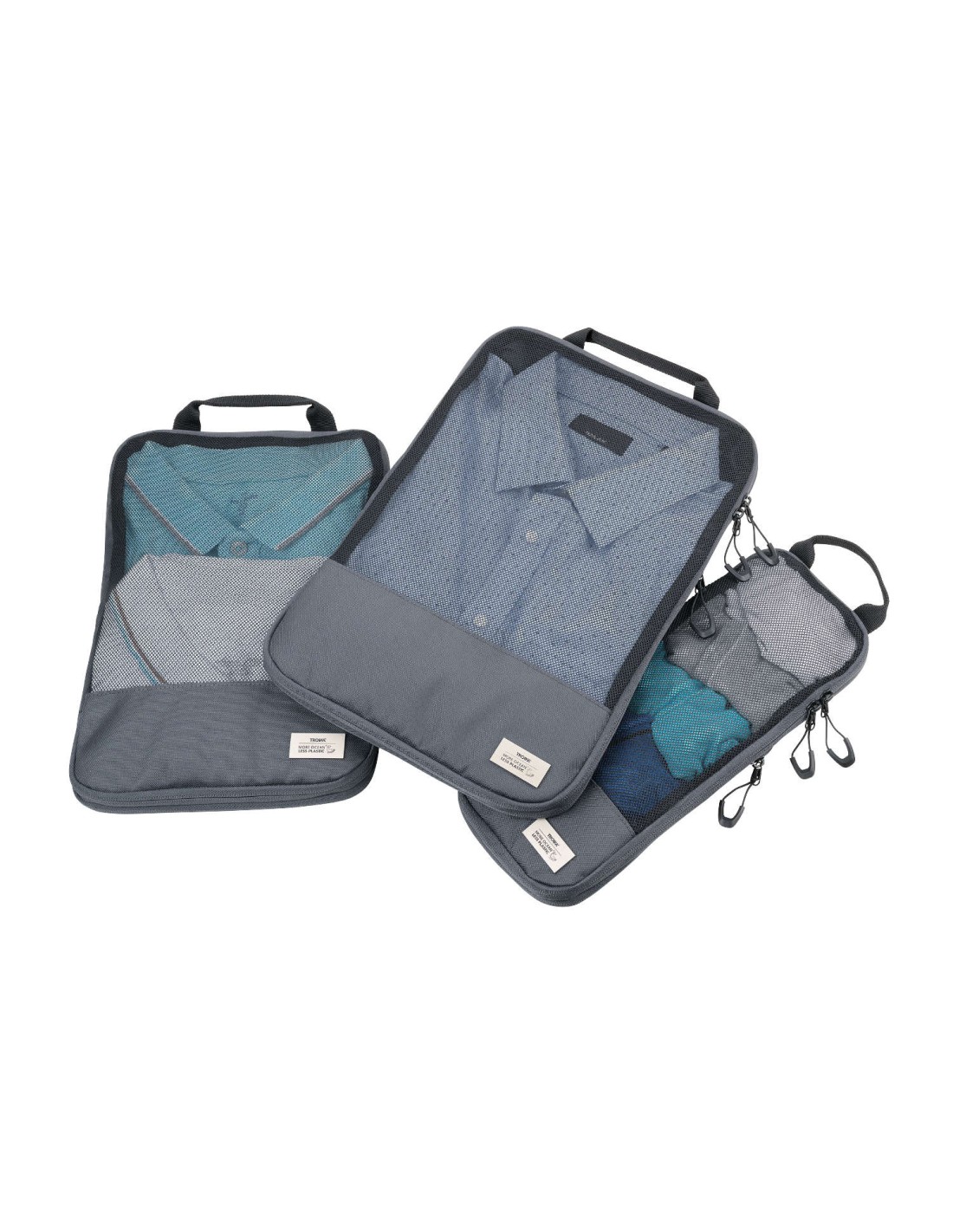 Ensemble de sac de compression de voyage en plastique marin recyclé, 3 poches de rangement avec fermeture à glissière et fermeture à glissière de compression supplémentaire pour un gain de place., rangement ordonné et infroissable des vêtements dans la valise et le sac à dos, 3 tailles : L (chemises & pantalons), M (T-shirts), S (lingerie & chaussettes), chacun avec fenêtre en filet et poignée de transport, 100% rPET, plastique marin recyclé, gris foncé
