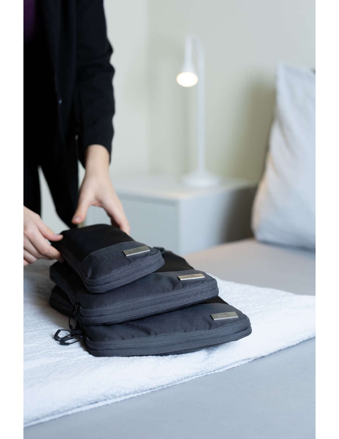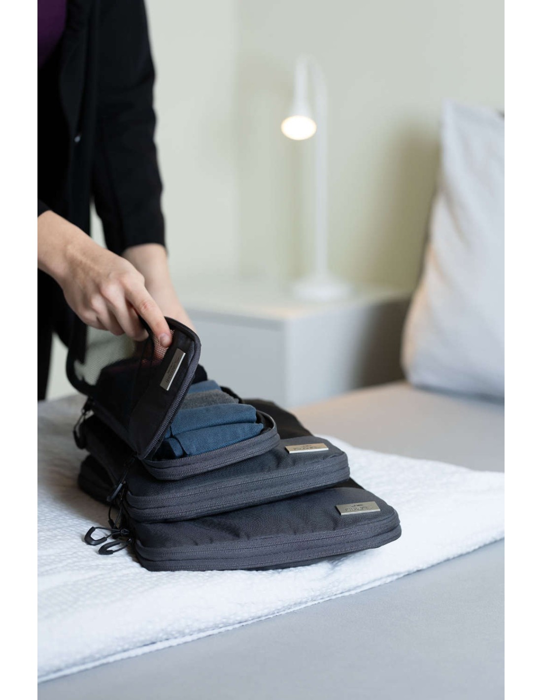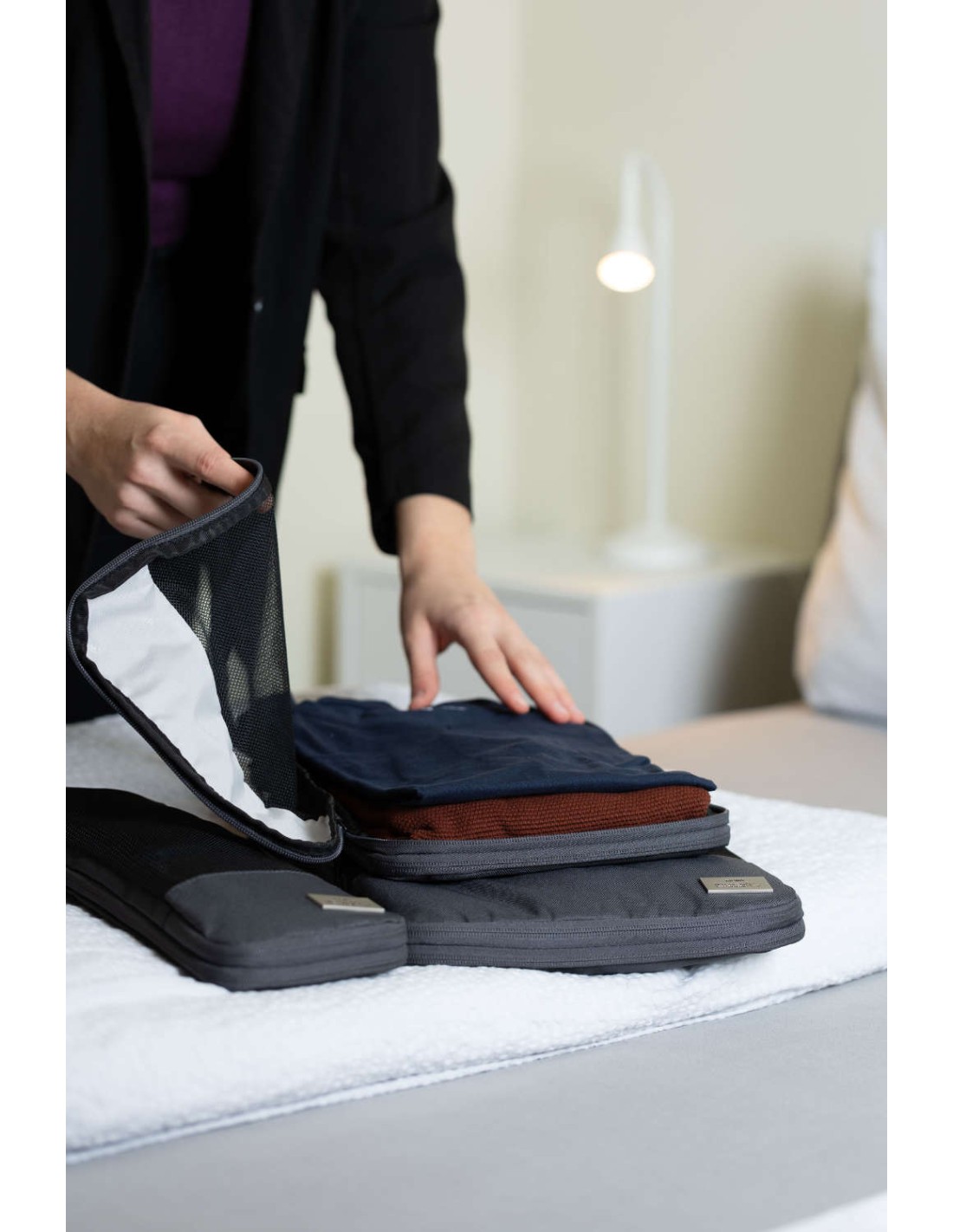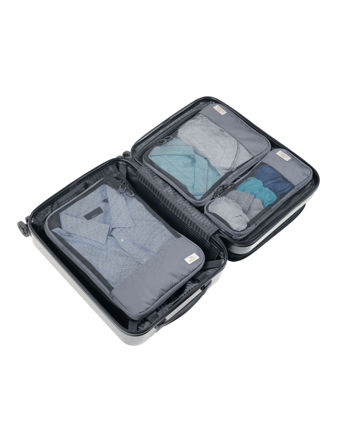 Ensemble de sac de compression de voyage en plastique marin recyclé, 3 poches de rangement avec fermeture à glissière et fermeture à glissière de compression supplémentaire pour un gain de place., rangement ordonné et infroissable des vêtements dans la valise et le sac à dos, 3 tailles : L (chemises & pantalons), M (T-shirts), S (lingerie & chaussettes), chacun avec fenêtre en filet et poignée de transport, 100% rPET, plastique marin recyclé, gris foncé