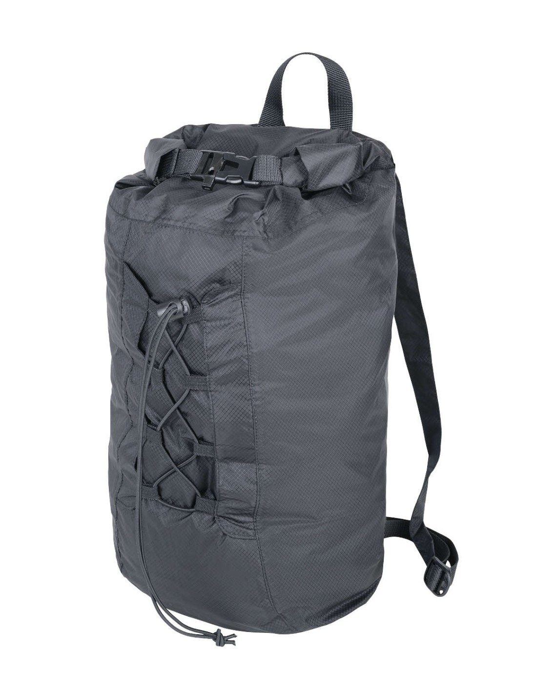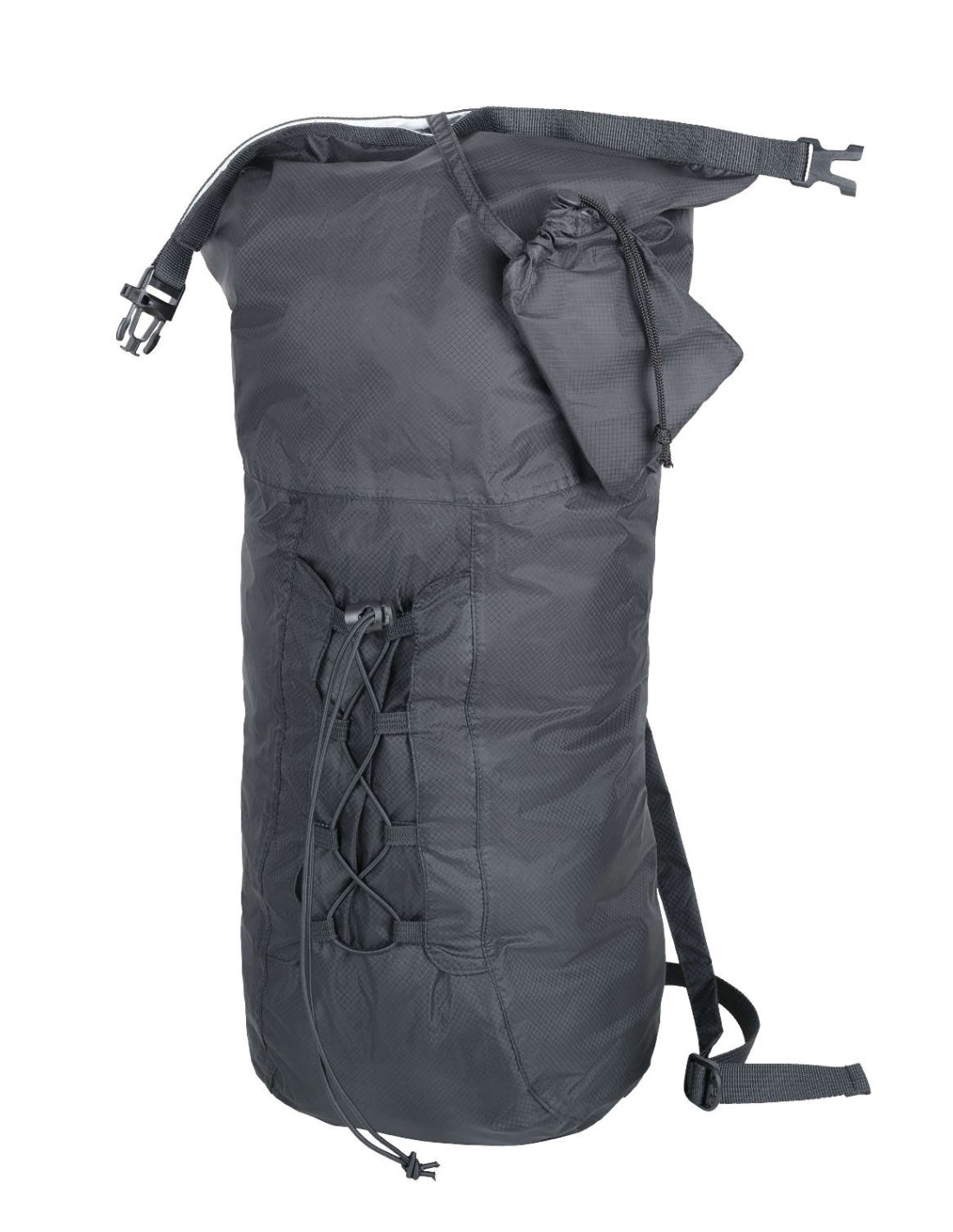 Sac à dos de trekking pliable (se range dans le compartiment intérieur pour gagner de la place), ultra léger 140g, 100% nylon ripstop avec revêtement TPU, étanche à l'eau, grand compartiment principal avec fermeture à enroulement, capacité de 18 litres, bandes élastiques pour un rangement supplémentaire, par exemple pour la veste ou le casque, dragonne, bretelles réglables, sifflet d'urgence, nylon, noire