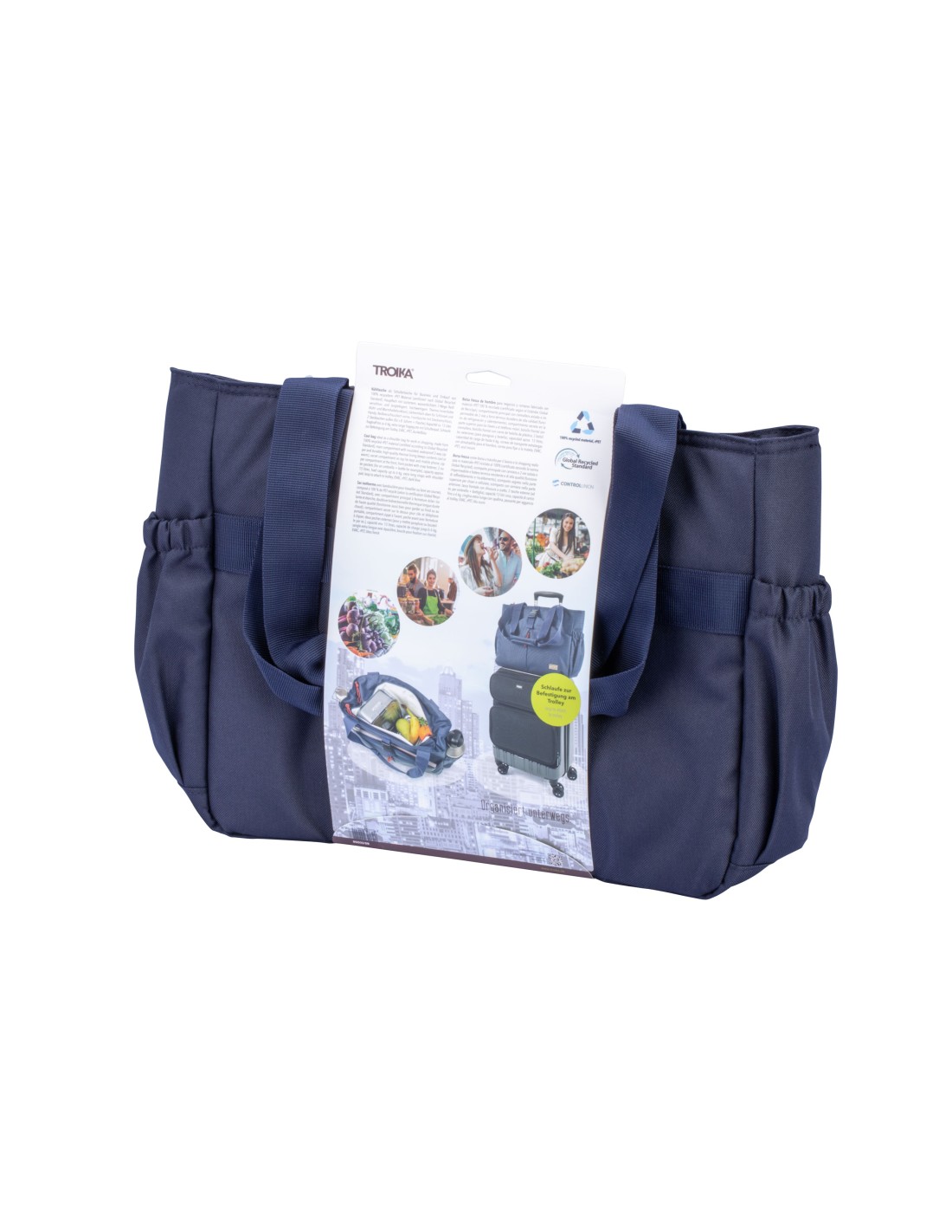 Sac isotherme avec bandoulière pour travailler ou faire ses courses, composé à 100 % de PET recyclé (selon la certification Global Recycled Standard), avec compartiment principal à fermeture éclair isolante et étanche, doublure bidirectionnelle thermique longue durée de haute qualité (fonctionne aussi bien pour garder au froid qu'au chaud), compartiment secret sur le dessus pour clés et téléphone portable, compartiment zippé à l'avant, poche avant avec fermeture à clipser, deux poches externes (pour y mettre parapluie ou bouteille par ex.), capacité env. 13 litres, capacité de charge jusqu'à 6 kg, sangle extra longue avec épaulière, boucle pour fixation sur chariot, EVAC, rPET, bleu foncé