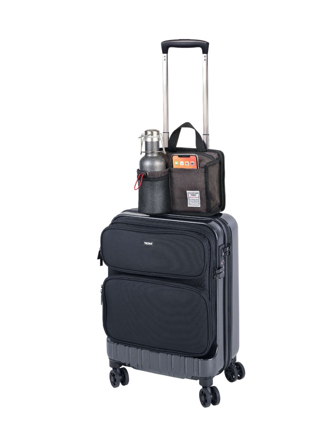 Organisateur de trolley à fixer sur le trolley de voyage ou d'exposition, deux compartiments frontaux pour la bouteille d'eau et le smartphone, compartiment principal spacieux avec boucle pour stylo, poche intérieure avec fermeture éclair, deux élastiques pour l'organisation des câbles, poche en mesh pour powerbank ou cartes de visite, compartiment transparent pour les billets, par exemple, dragonne, 100% polyester, polyester, anthracite/noire