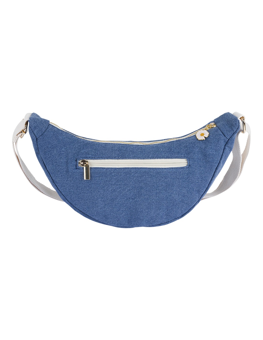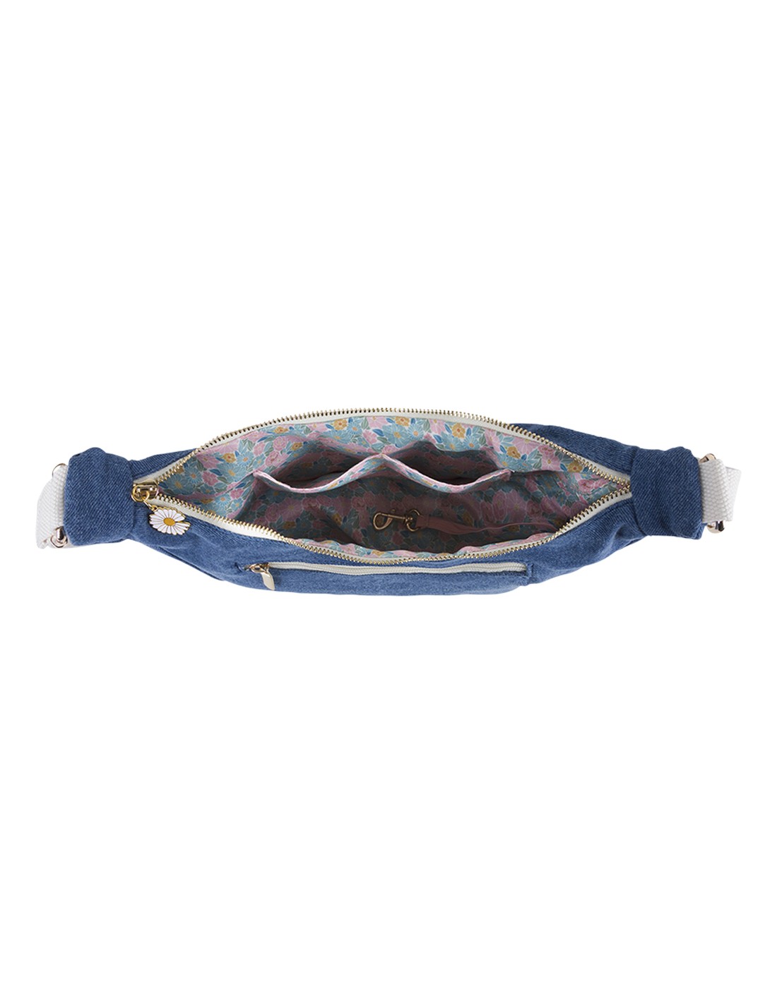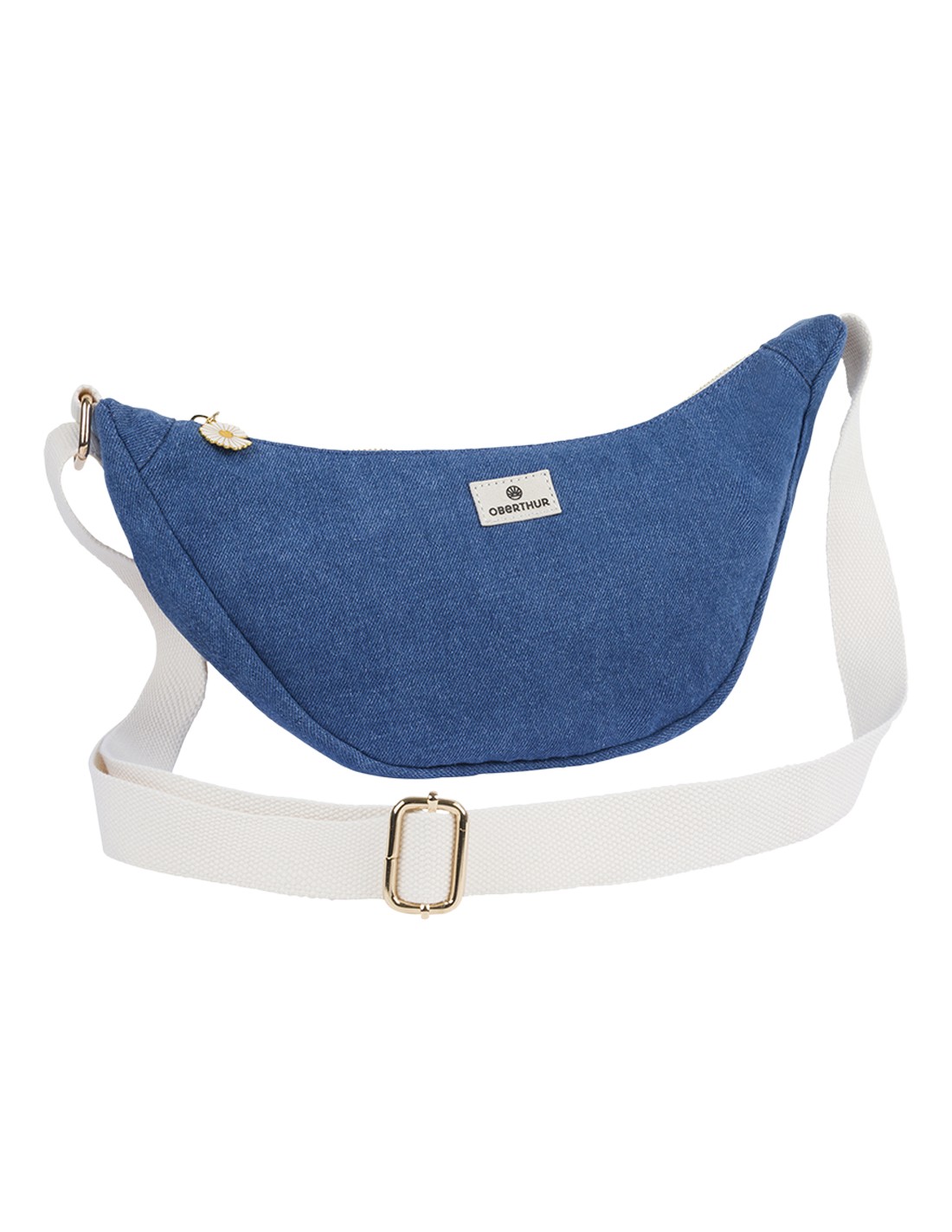 Sac demi lune en denim 100% recyclé. 1 compartiment principal zippé avec 3 poches intérieures dont 2 plaquées et 1 zippée, mousqueton avec lien élastiqué à l'intérieur, 1 poche zippée au dos, bandoulière ajustable. Zip métal doré, tirette de zip métallique en forme de marguerite, doublure avec imprimé fleuri. Accessoires métal doré. Dimensions : 35 x 11,5 x 15 cm. Coloris bleu.