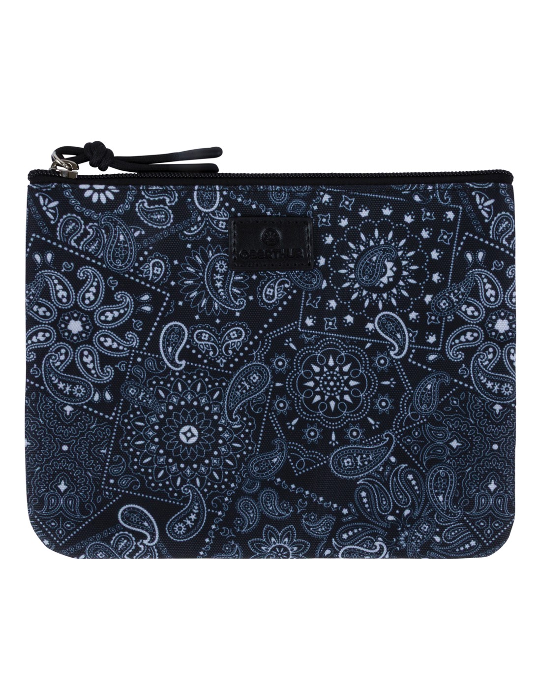 Pochette plate en polyester 100% recyclé, imprimé bandana. 1 compartiment principal zippé. Patch PU cousu avec logo Oberthur embossé. Accessoires métal chromé et tirette de zip en cordelette noire. Dimensions : 22 x 1,5 x 17,5 cm