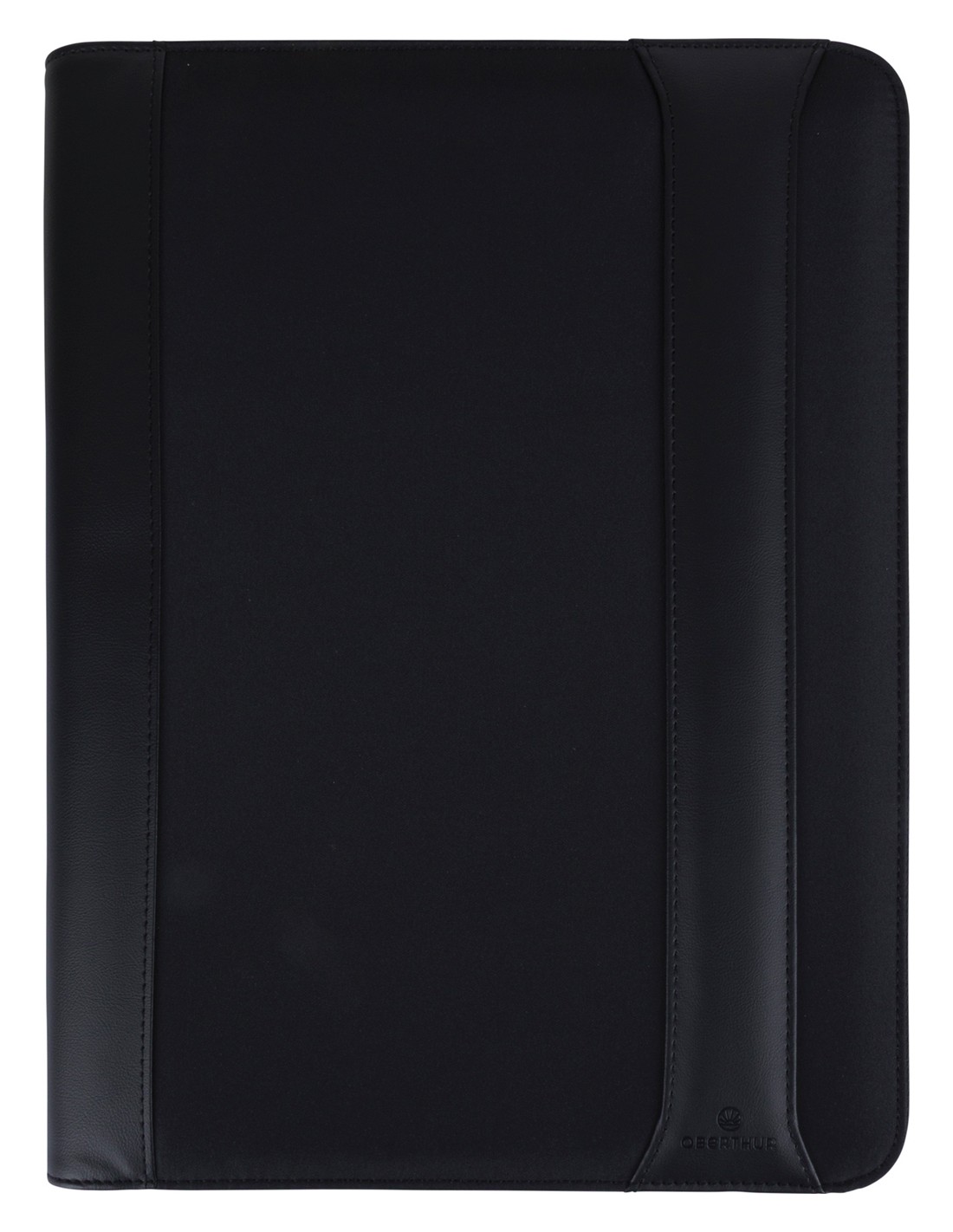 Conférencier A4 zippé, bi-matière microfibre et PU lisse, coloris noir. Bloc-notes inclus. Espaces de rangements, découpes pour cartes et coulisseau stylo. Dimensions : 34 x 3 x 26 cm.