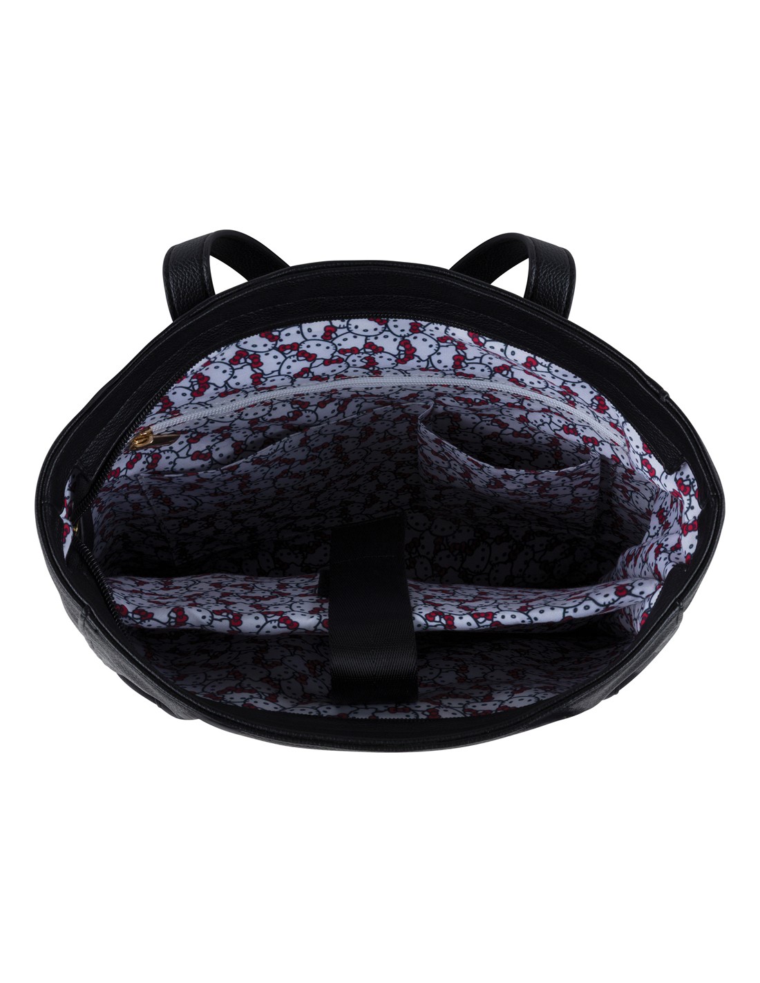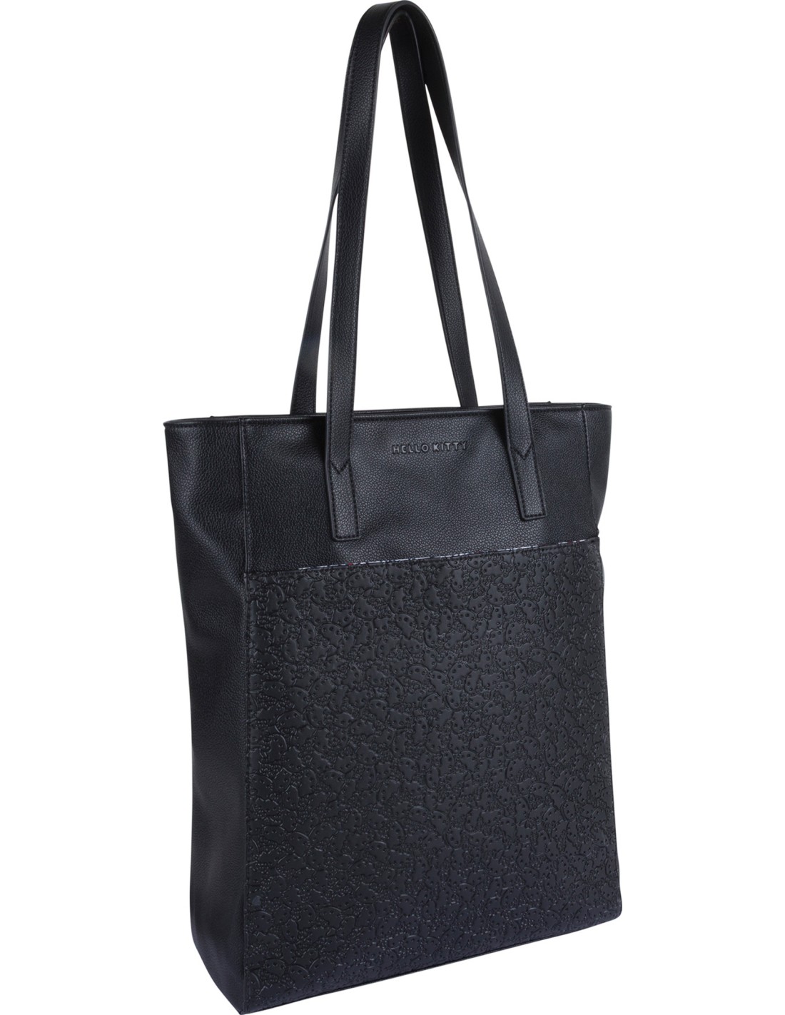 Sac cabas en mix-matière : PU lisse avec motif Hello Kitty embossé et PU grainé. 1 compartiment principal zippé. Poche extérieure avec bouton aimanté. 3 poches intérieures dont 1 zippée. Pieds de renfort. Pochette moussée pour ordinateur 15,6''. Tirettes de zip en forme de tête Hello Kitty. Logo Hello Kitty noir en relief. Accessoires chromés noirs. Doublure imprimée avec motif Hello Kitty. Dimensions : 31 x 42 x 10 cm. Coloris noir.