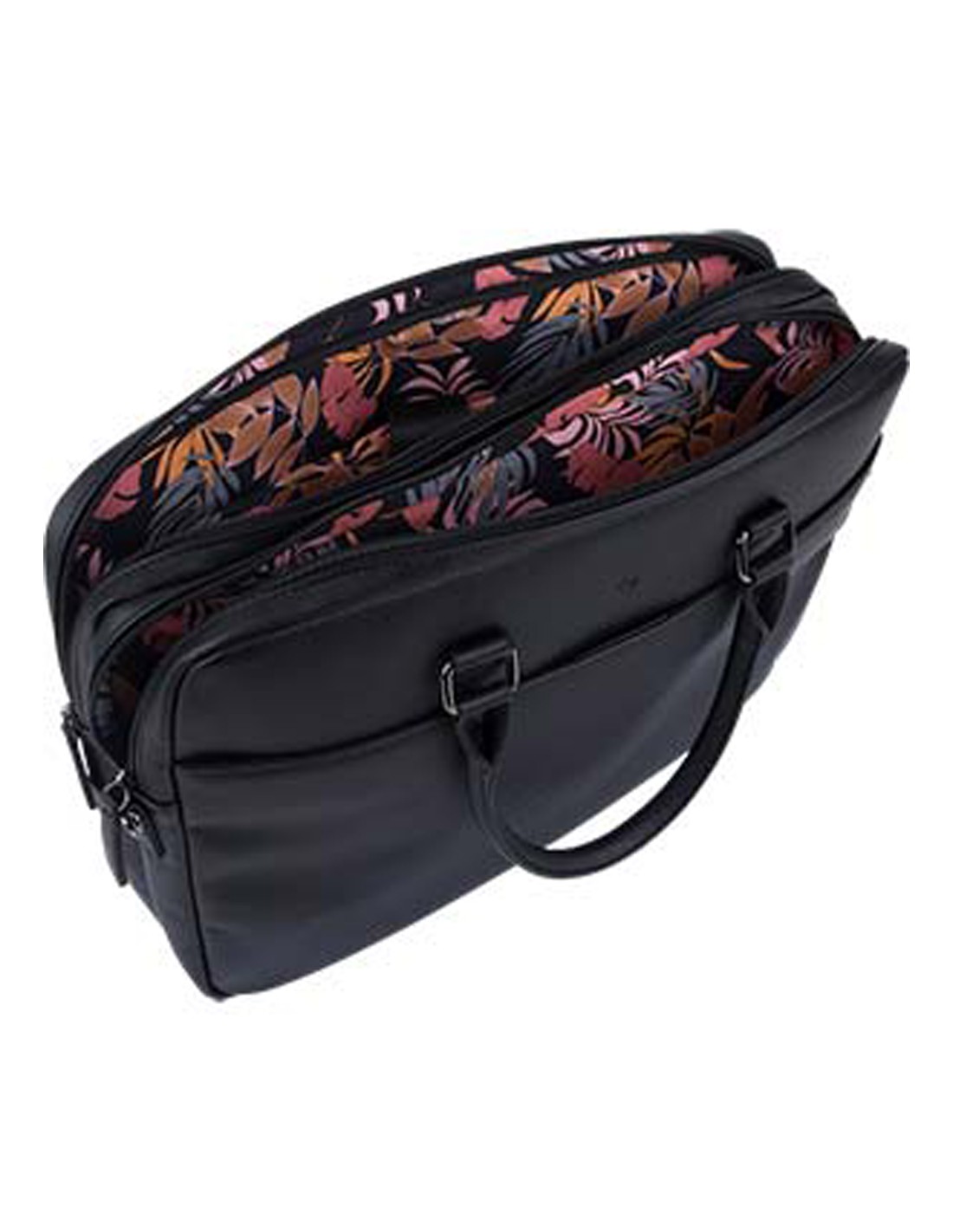 Sacoche ordinateur 2 compartiments zippés, matière synthétique avec grain saffiano. 1 poche avec fermeture aimantée devant, 1 poche zippée à l'arrière, 1 poche intérieure zippée, 1 pochette moussée pour ordinateur 15,6'', sangle trolley et pieds de renfort. Logo soleil levant Oberthur noir et patch PU à l'intérieur avec logo embossé. Accessoires chromés noirs. Dimensions : 46 x 32,5 x 10 cm. Coloris noir.